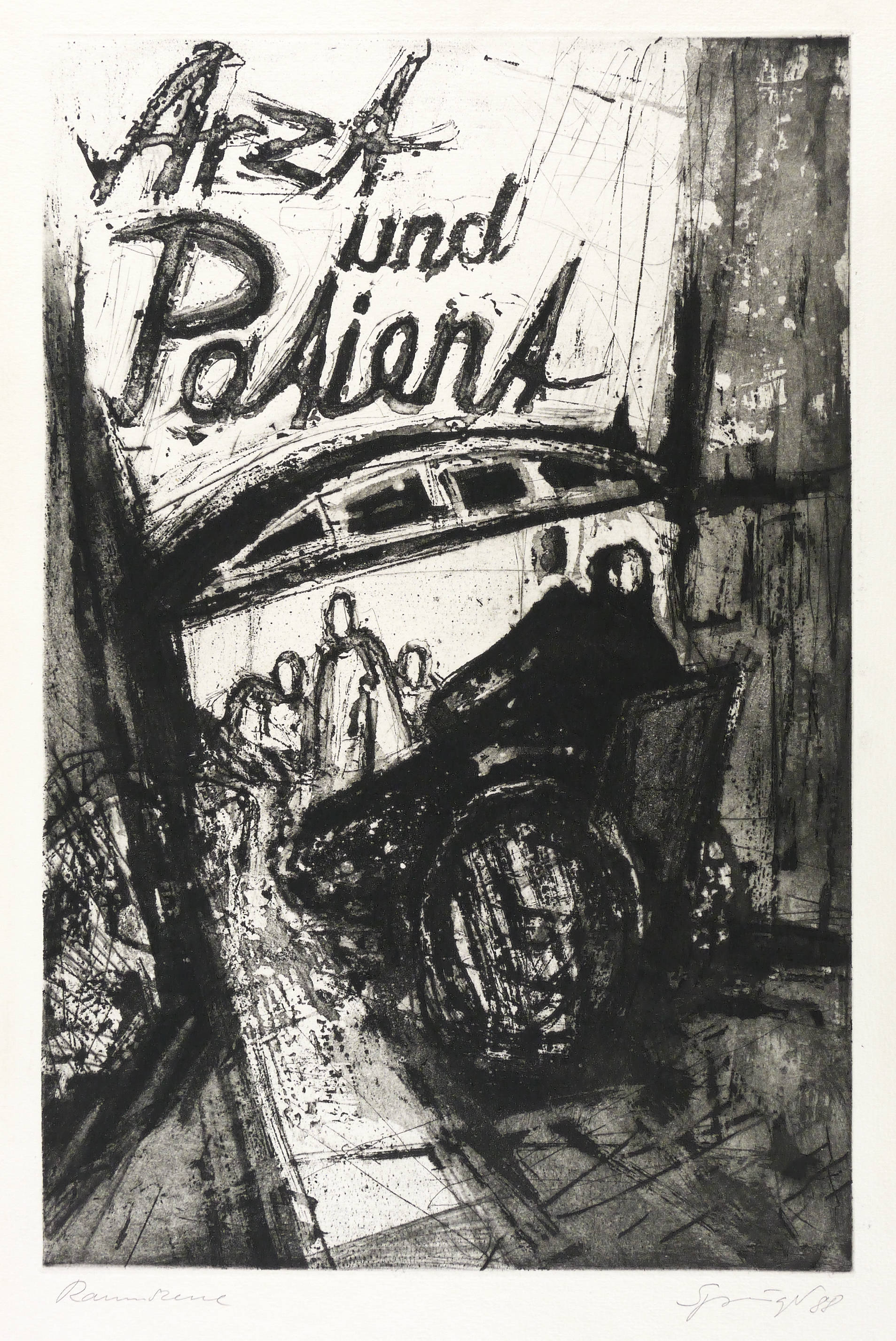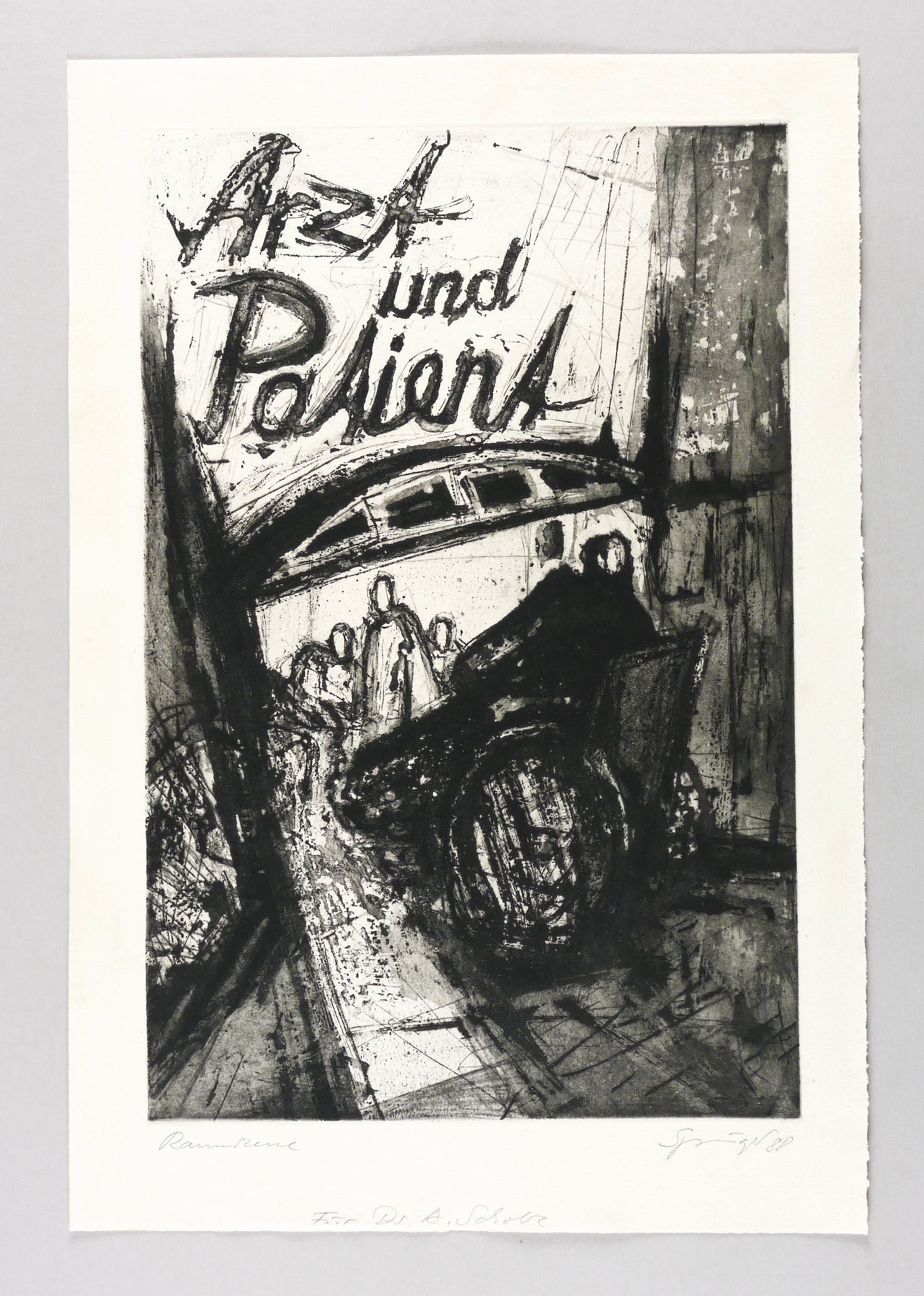 Rechts unten in Bleistift signiert und datiert. Links Auflagenbezeichnung und Titel. In der Platte links oben Inschrift: ″Arzt und Patient″. – Provenienz: Sammlung Dr. Ingrid und Prof. Dr. Albrecht Scholz, Dresden. – Sehr guter Zustand.