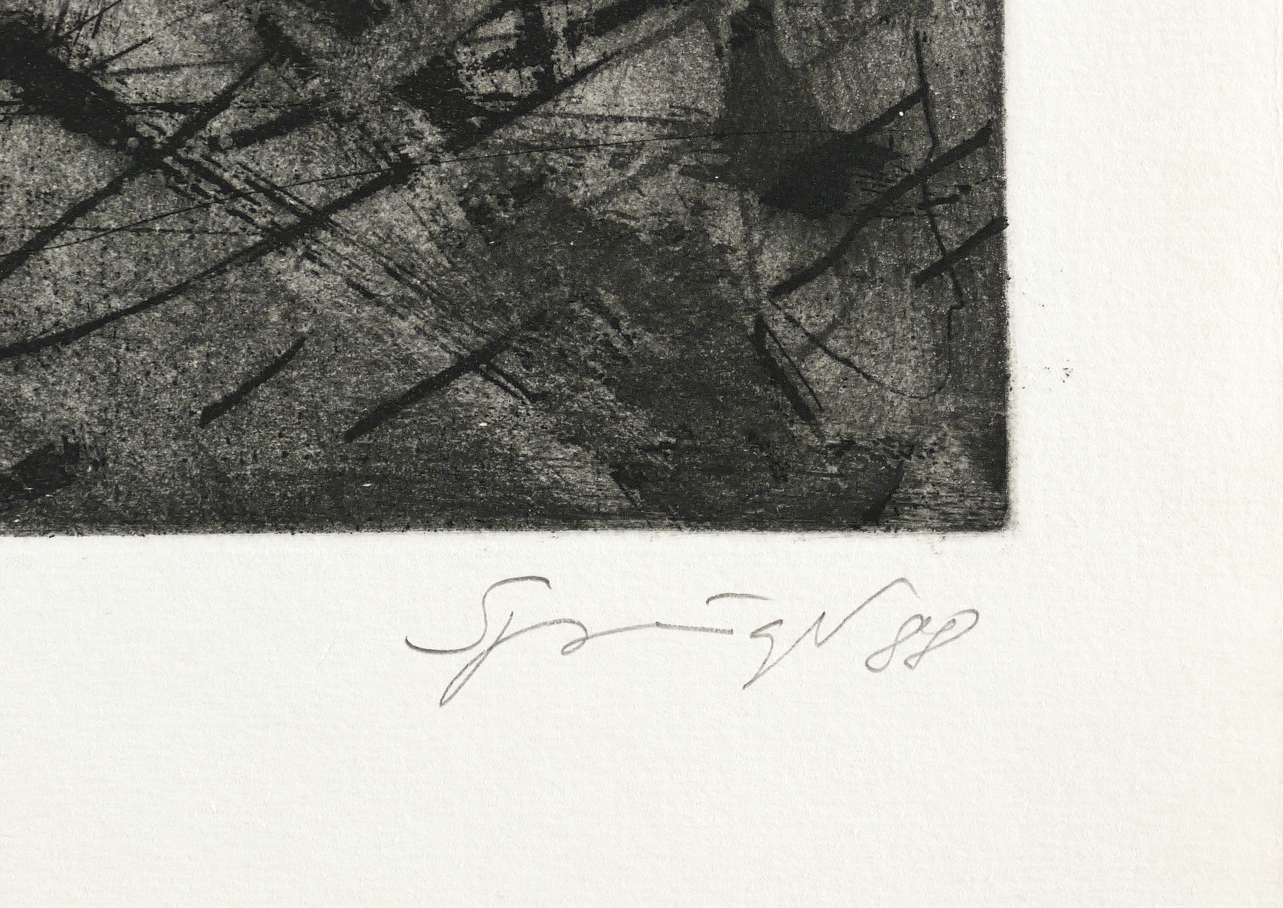 1988. Radierung / Reservage, Aquatinta & Roulette, in Schwarz, auf hellchamois Bütten. – Originale Künstlergrafik, von Reinhard Springer. – Künstlerexemplar (e.a.). – 48,5 x 32,0 cm (Darstellung / Platte), 58 x 39 cm (Blatt).