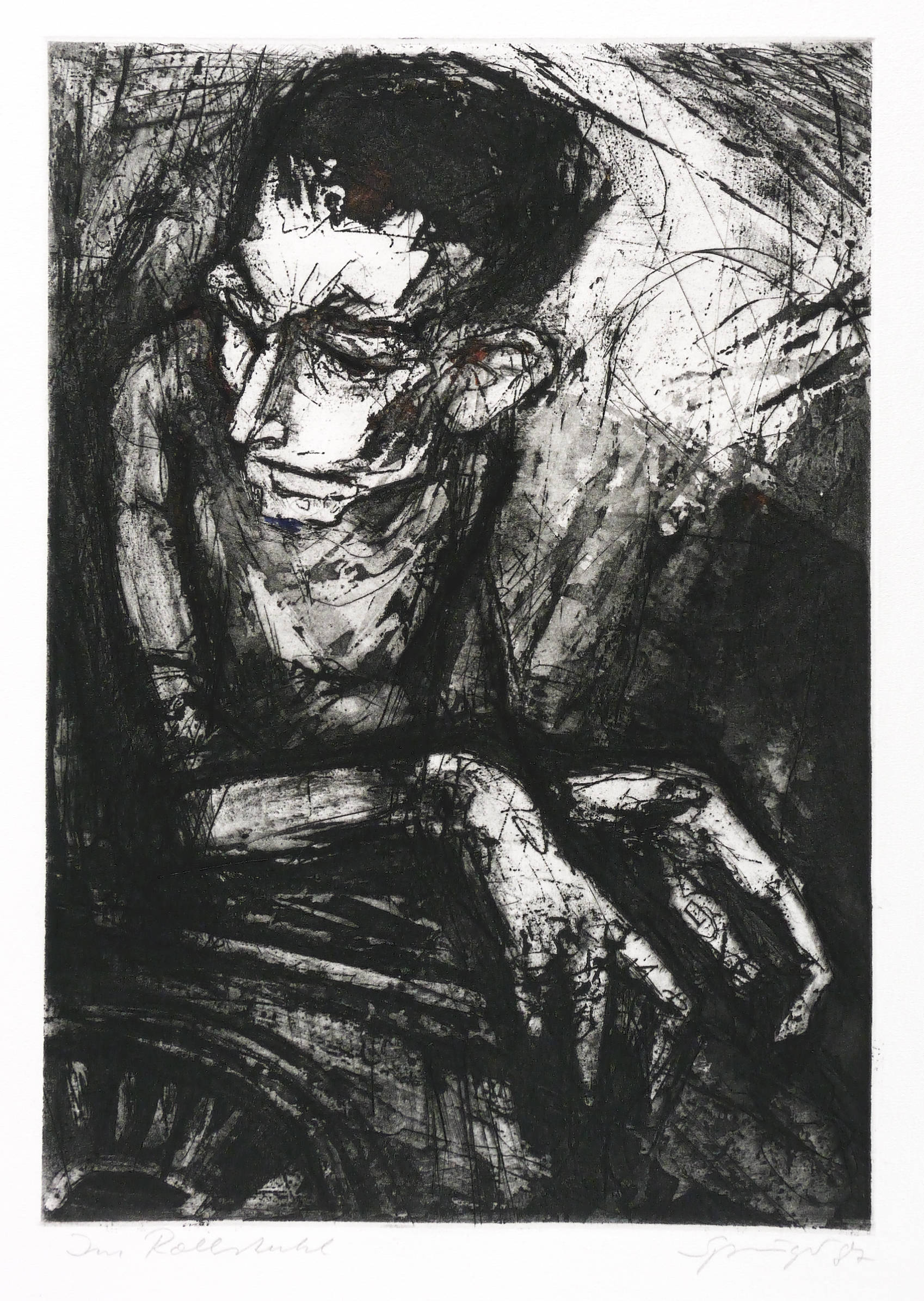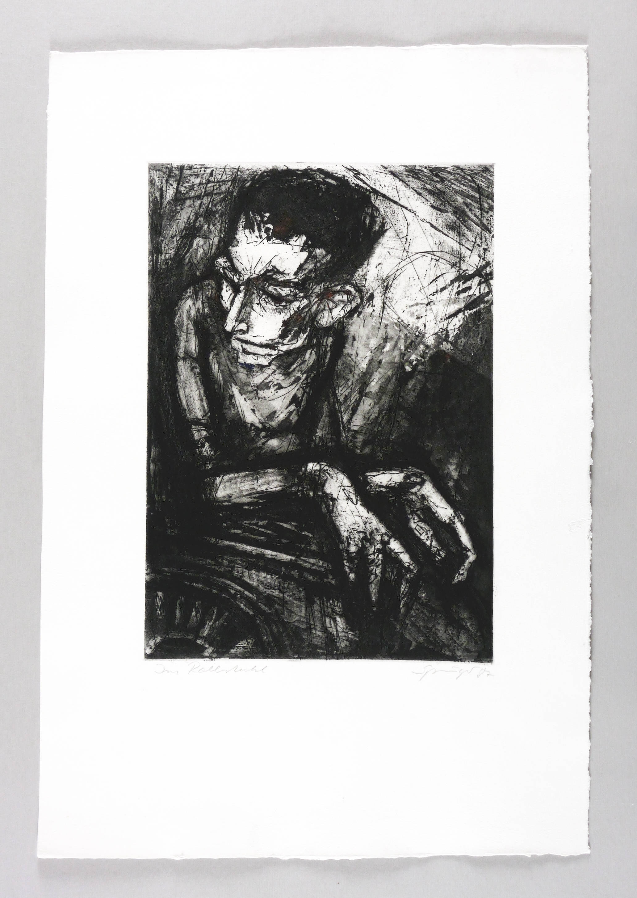 Rechts unten in Bleistift signiert und datiert: ″Springer 87″. Links Titel: ″Im Rollstuhl″. Wasserzeichen der Hahnemühle. – Provenienz: Sammlung Dr. Ingrid und Prof. Dr. Albrecht Scholz, Dresden. – Sehr guter Zustand.