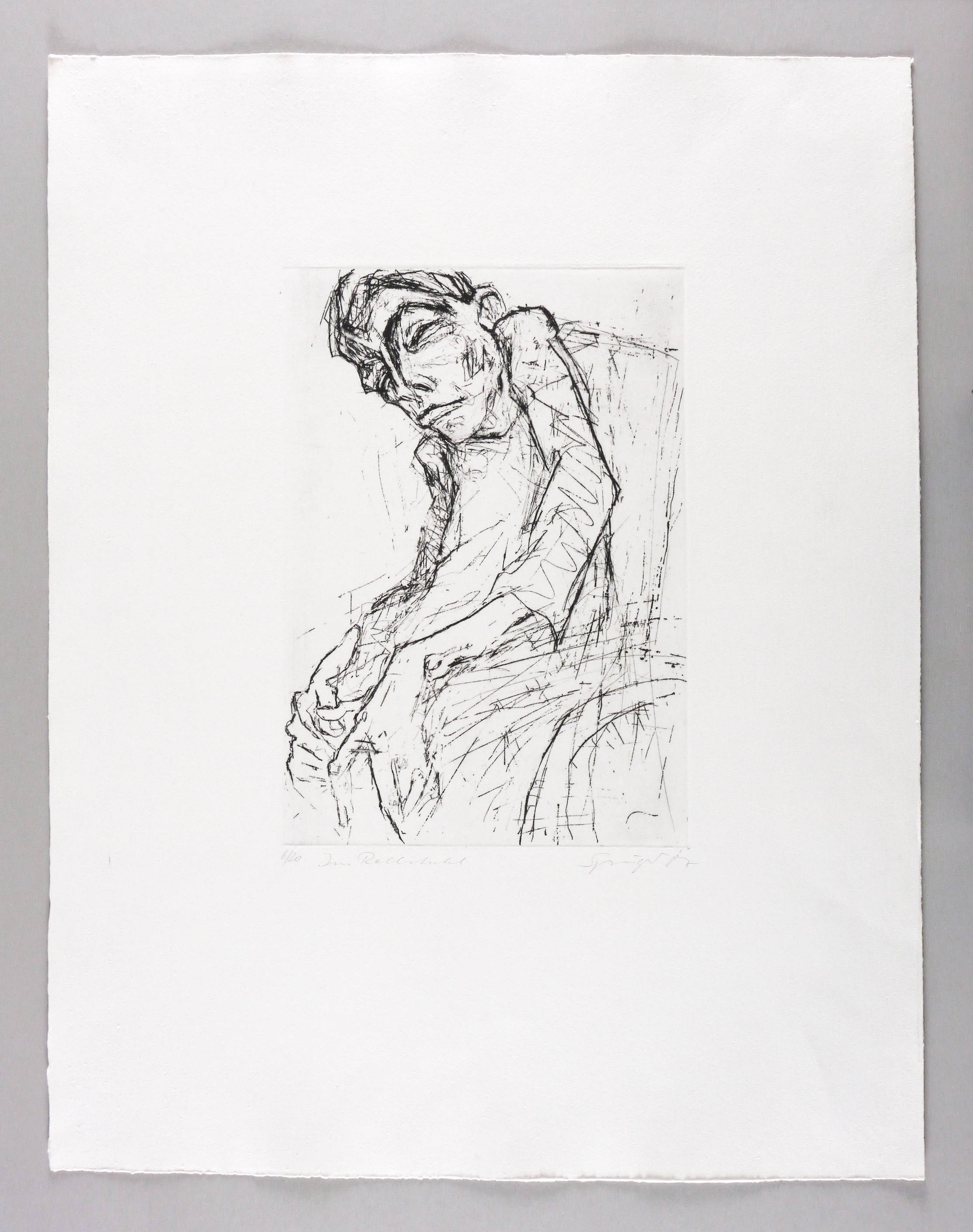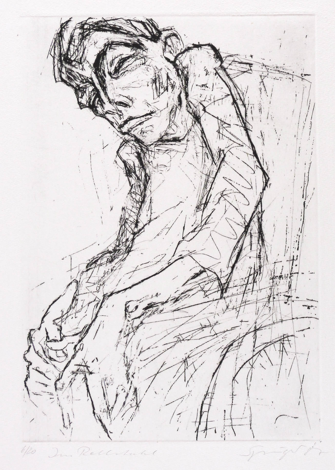 Rechts unten in Bleistift signiert und datiert: ″Springer 87″. Links Auflagenbezeichnung: ″6/20″. Mittig Titel: ″Im Rollstuhl″. – Abzug auf großem Bogen. – Tadellos. Sehr guter Erhaltungszustand.
