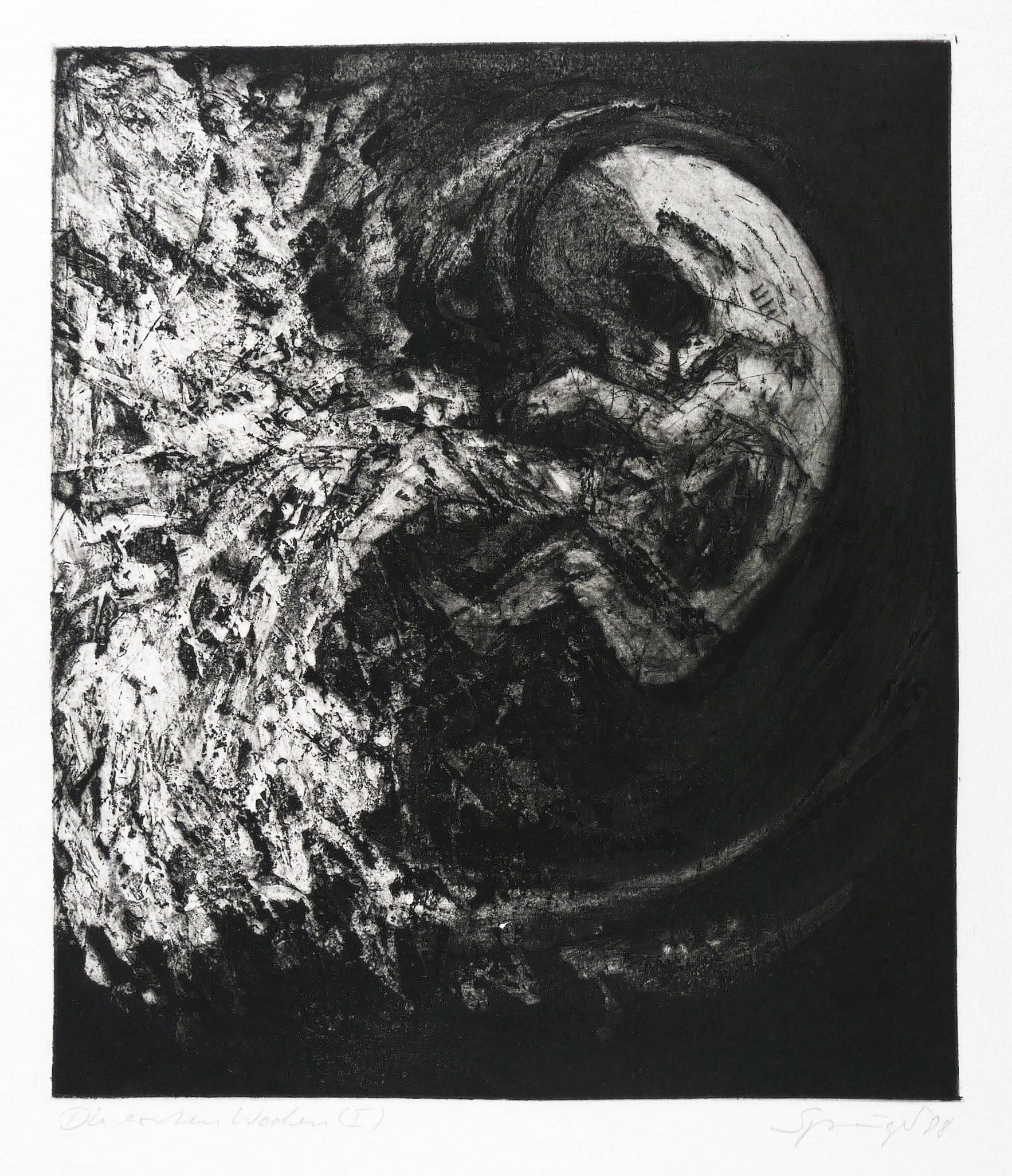 1988. Radierung / Roulette, Strichätzung, Aquatinta & Reservage, in Schwarz, auf hellchamois Velinkarton. – Originale Künstlergrafik, von Reinhard Springer. – Künstlerexemplar (e.a.). – 34,0 x 29,0 cm (Darstellung / Platte), 50 x 38 cm (Blatt).