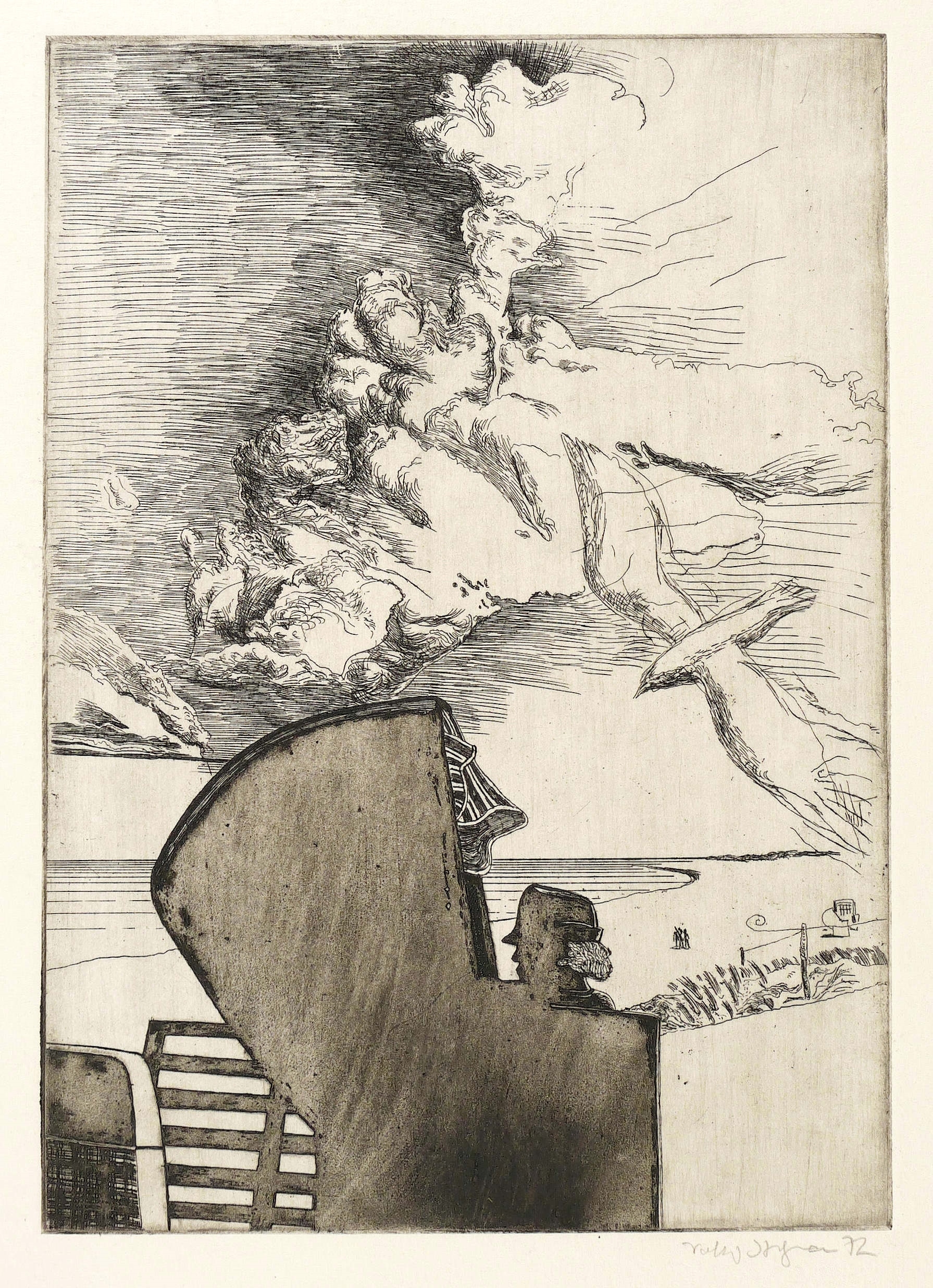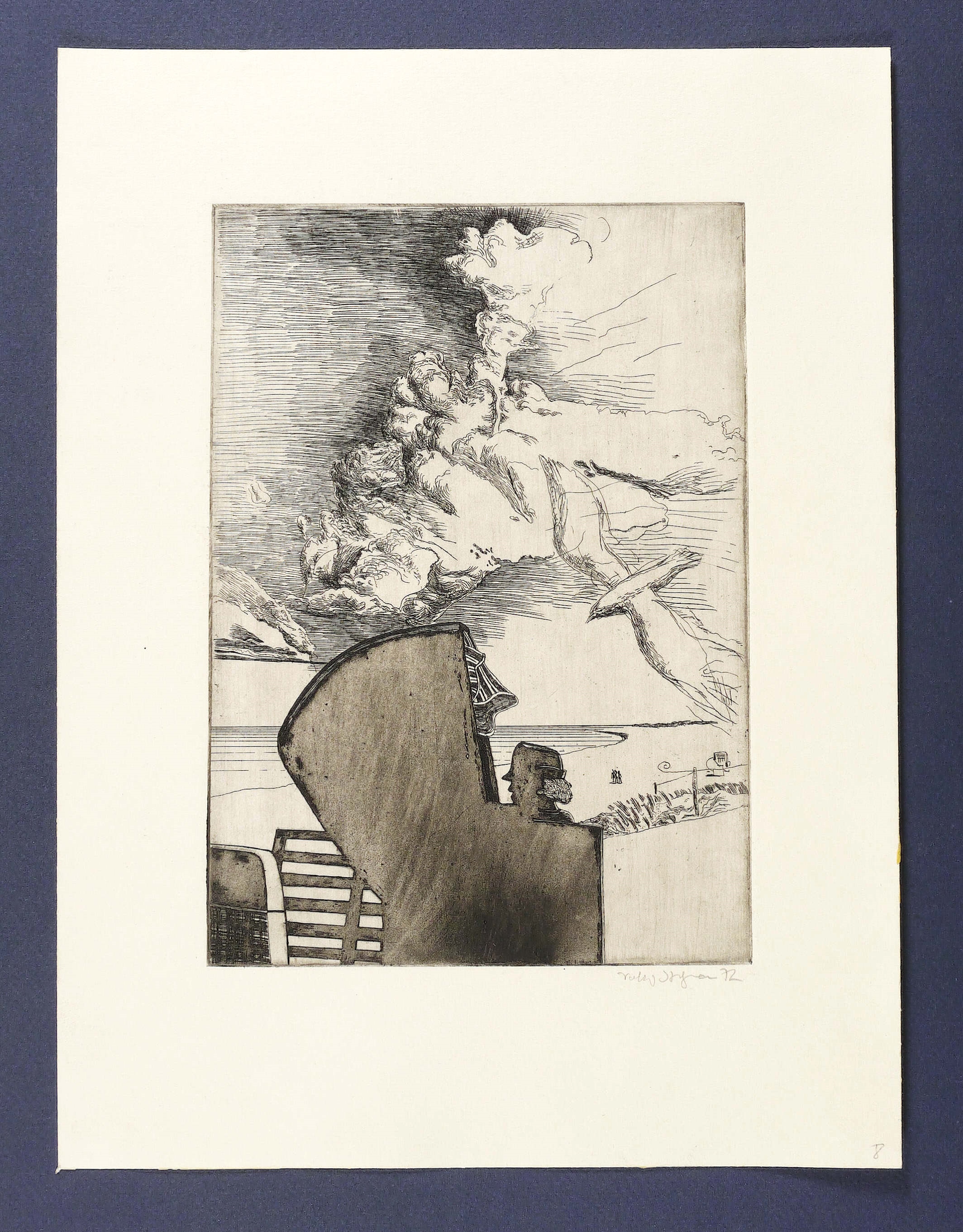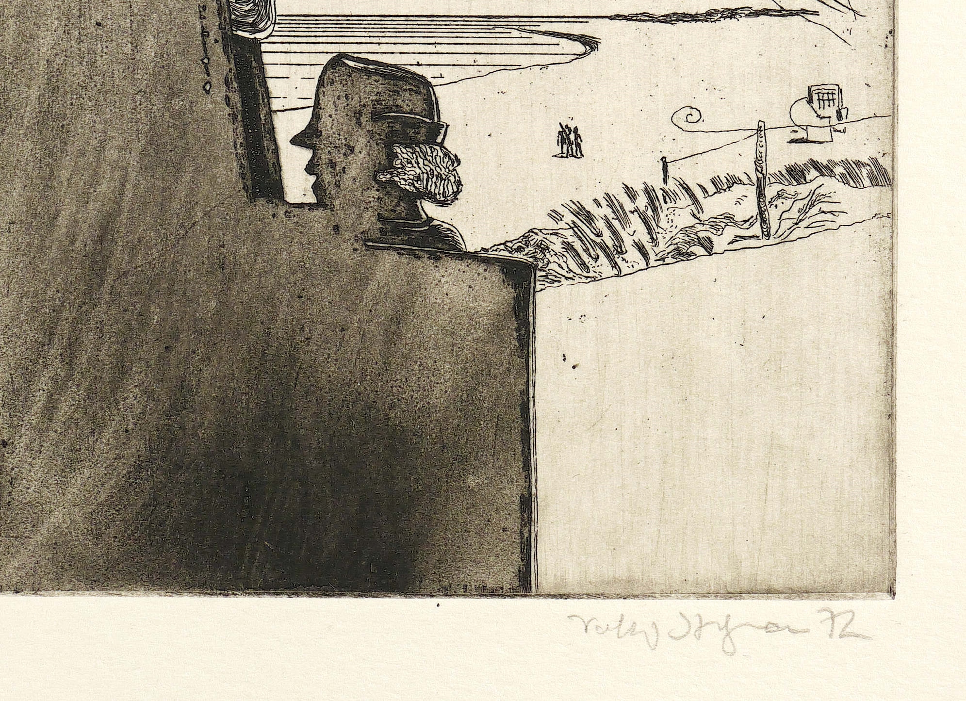 1972. Radierung / Strichätzung & Aquatinta, in Schwarz, auf hartem hellgelbem Papier. – Originale Künstlergrafik, von Volker Stelzmann. – 21,7 x 15,3 cm (Darstellung / Platte), 32 x 24 cm (Blatt).
