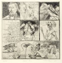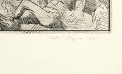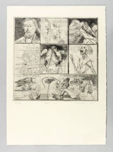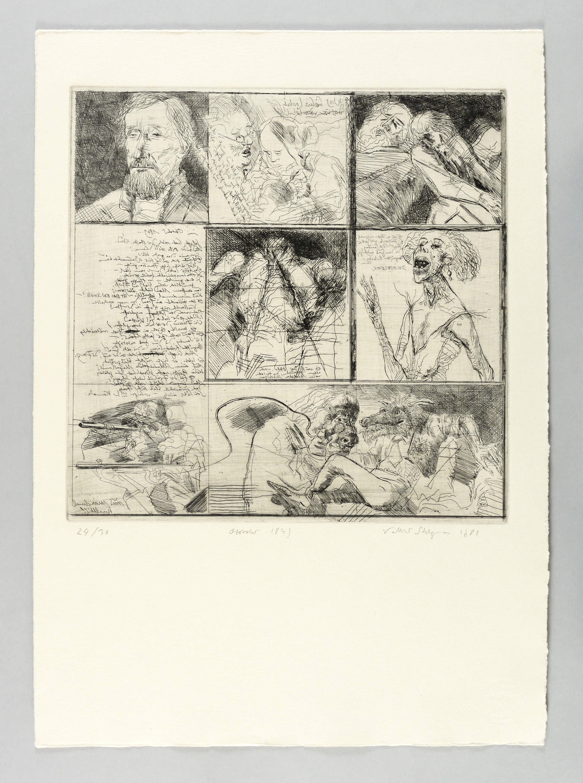 Behrends-Musinowski 140. – Aus: Grafik zu Heinrich Heine (Leipzig: Verband Bildender Künstler & Hochschule für Grafik und Buchkunst 1981). – Rechts unten in Bleistift signiert und datiert: ″Volker Stelzmann 1981″. Llinks Auflagenbezeichnung und Titel. In der Platte zahlreiche spiegelverkehrte Inschriften. – Druck Ingo Duderstedt. – Tadellos. Sehr guter Zustand.