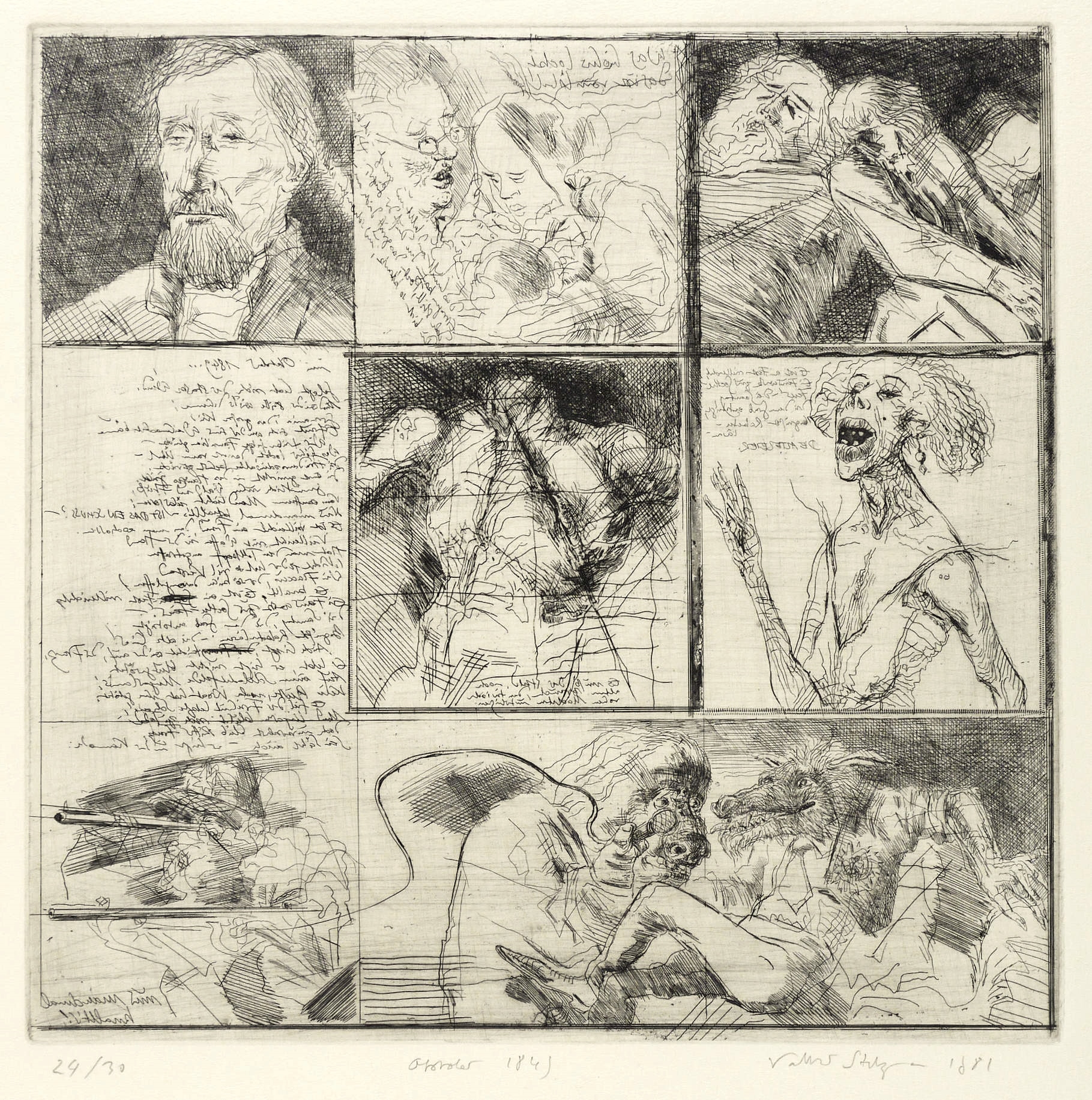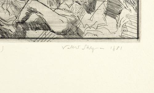 1981. Radierung / Strichätzung, mit Plattenton, in Schwarz, auf gelbem Hahnemühle-Bütten. – Von Volker Stelzmann. – Auflage Exemplar Nr. 24/30. – 28,6 x 29,1 cm (Darstellung / Einfassungslinie), 29,3 x 29,7 cm (Platte), 48 x 35 cm (Blatt).