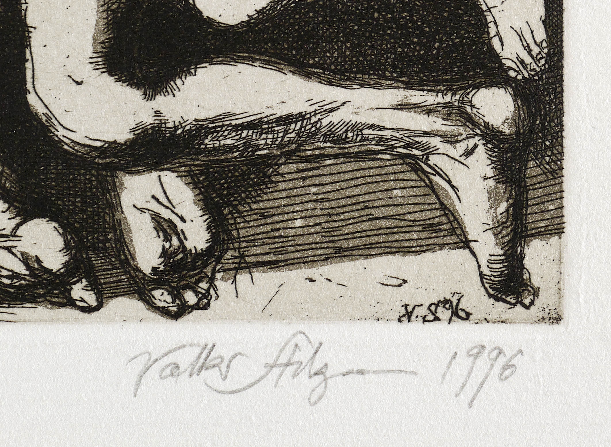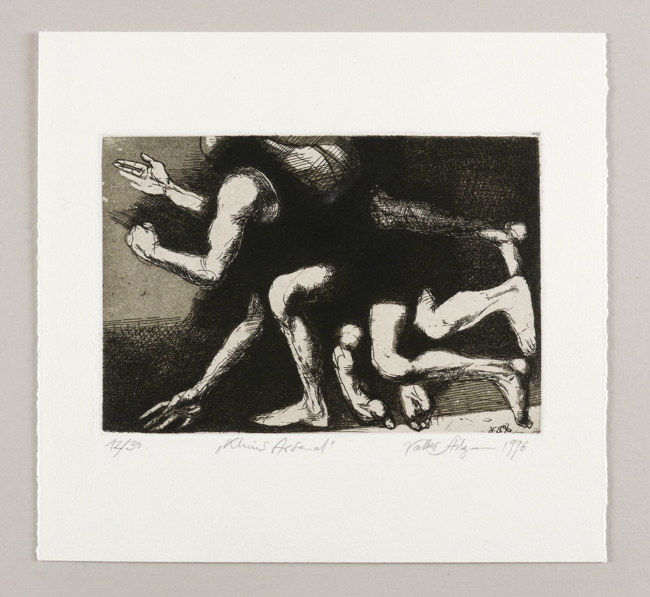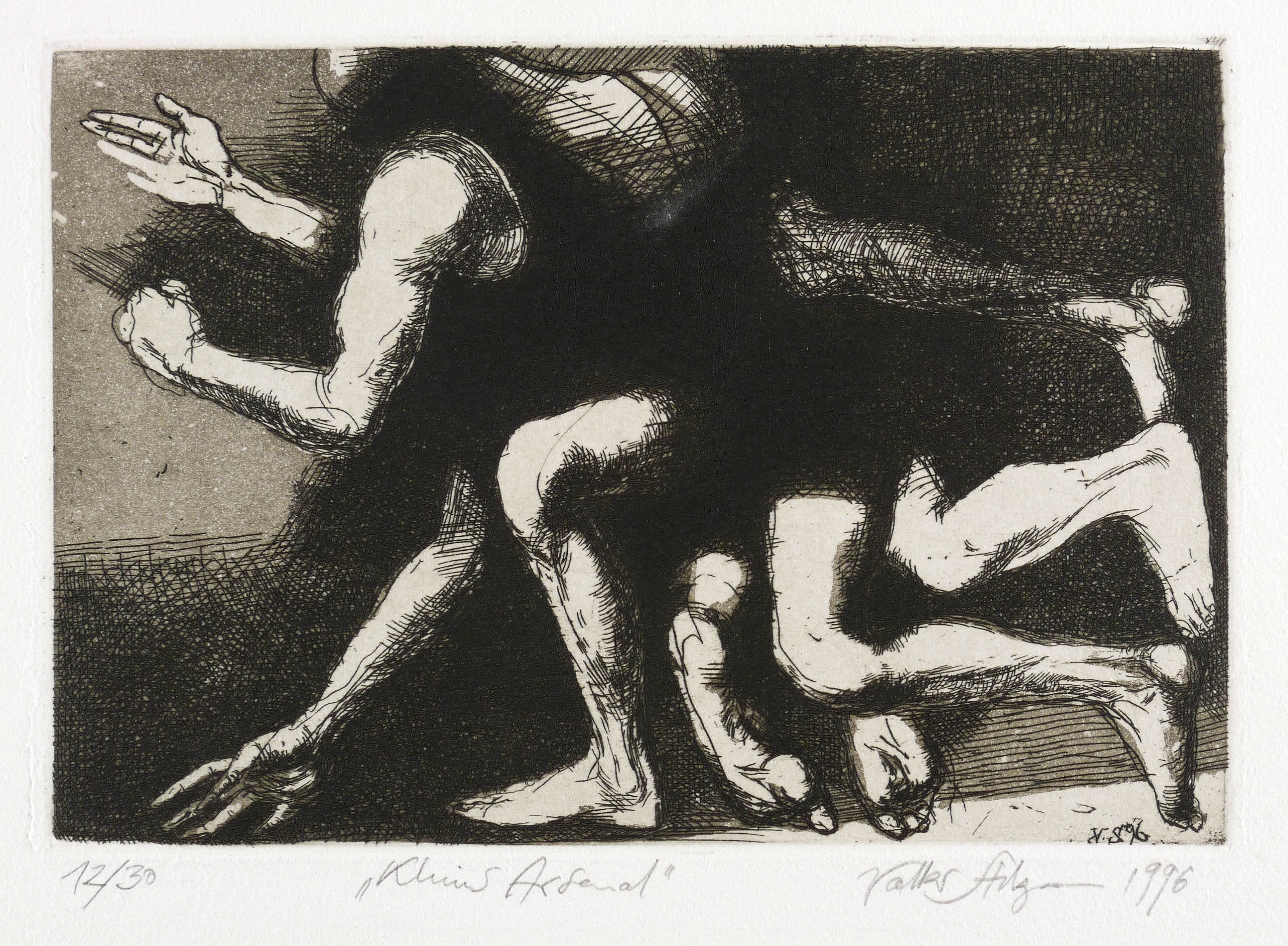 1996. Radierung / Strichätzung & Aquatinta, in Schwarz, mit Plattenton, auf Büttenpapier. – Originale Künstlergrafik, von Volker Stelzmann. – Auflage Exemplar Nr. 12/13. – 12,7 x 18,8 cm (Darstellung / Platte), 23 x 25 cm (Blatt).