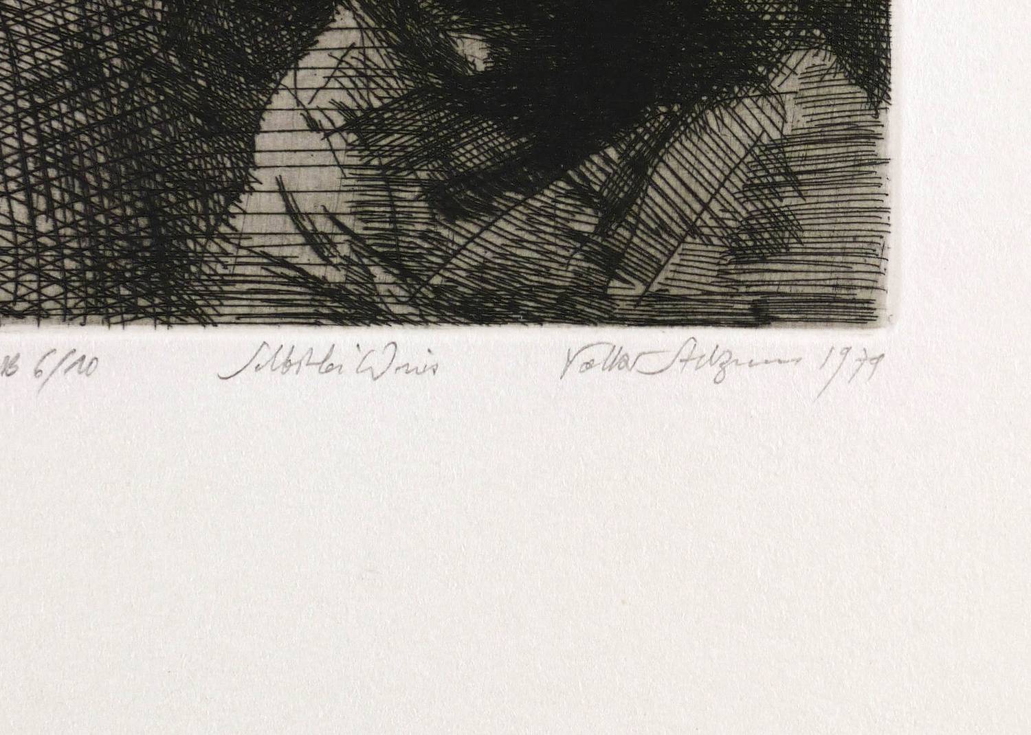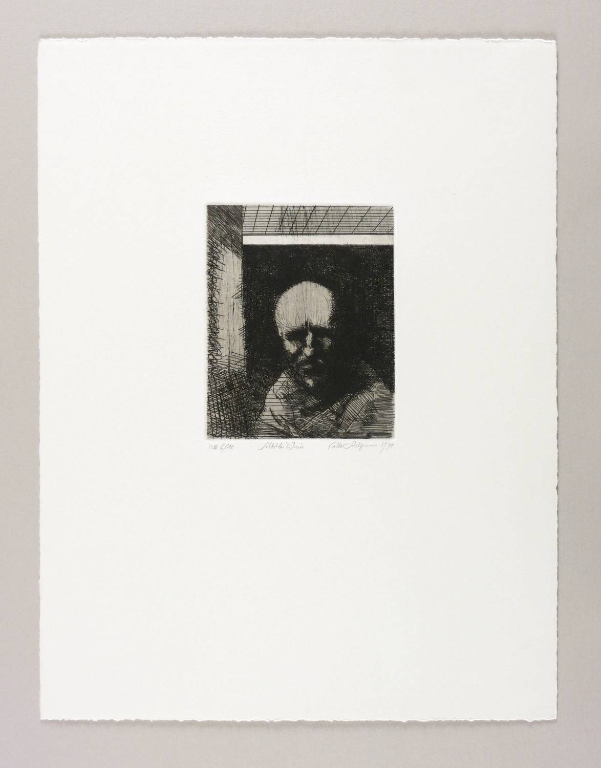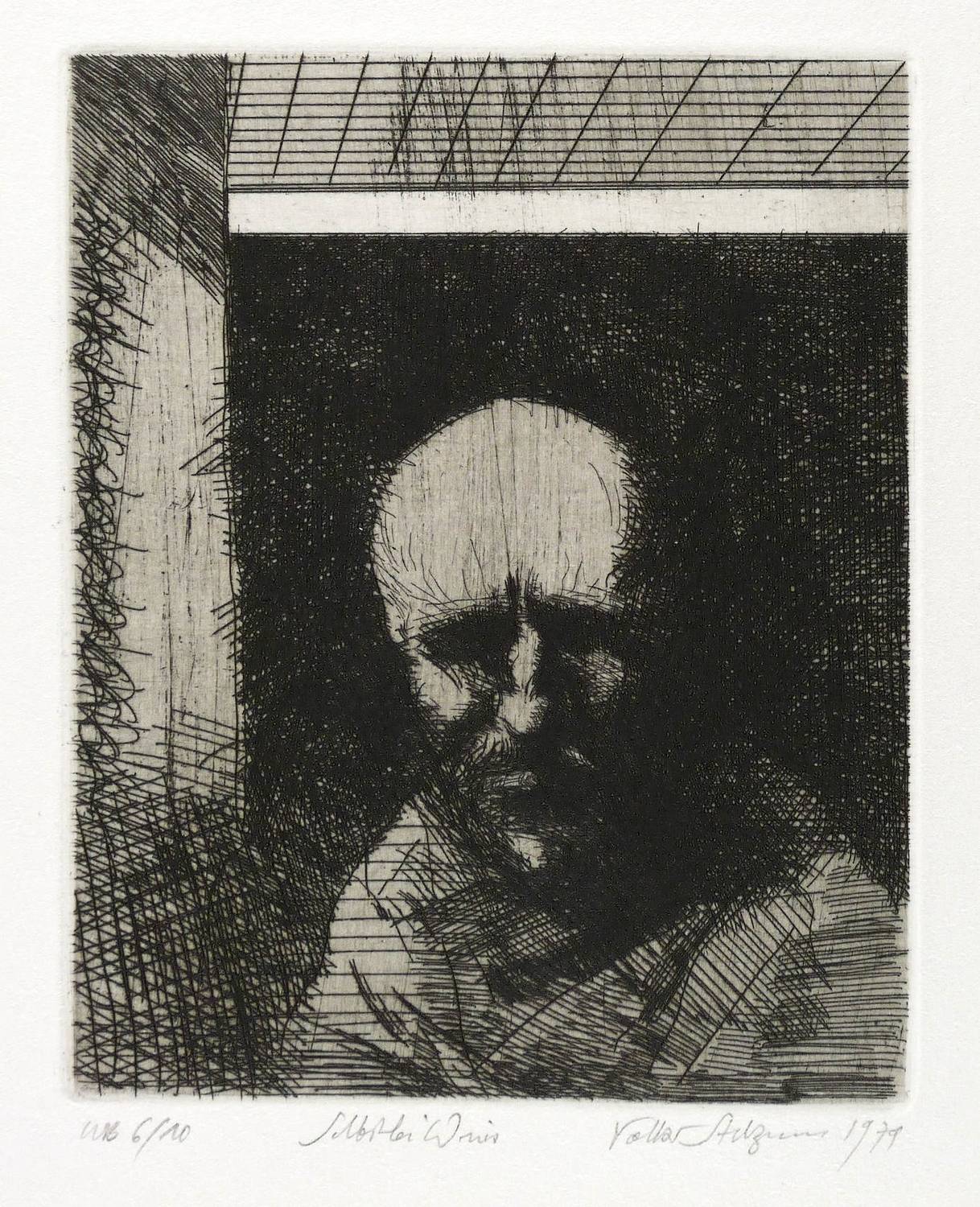 1979. Radierung / Strichätzung, Grund geschliffen, in Schwarz, mit Plattenton, auf schwerem Velin. – Originale Künstlergrafik, von Volker Stelzmann. – Auflage Exemplar Nr. 6/10. – 15,7 x 12,6 cm (Darstellung / Platte), 45 x 35 cm (Blatt).