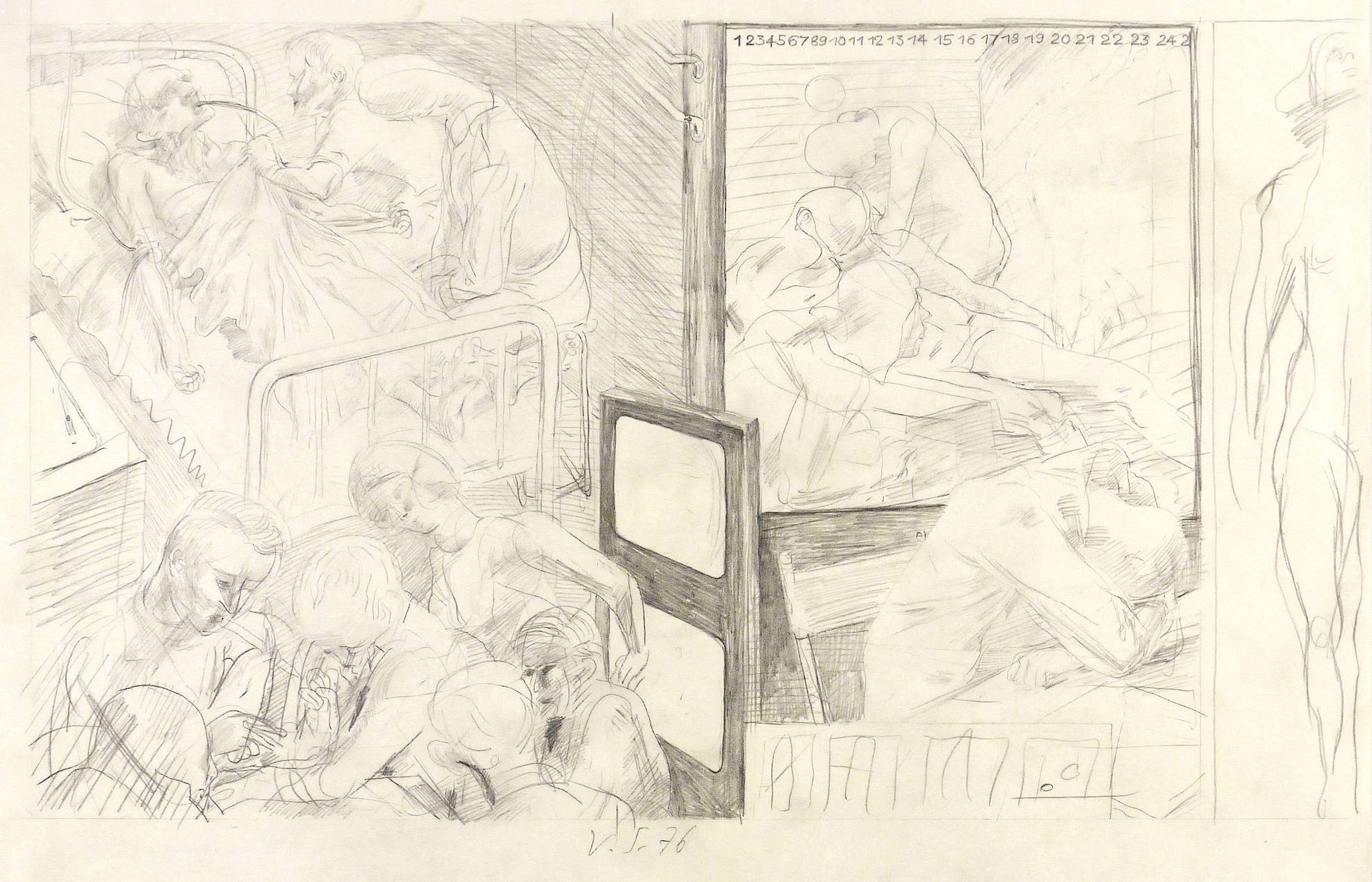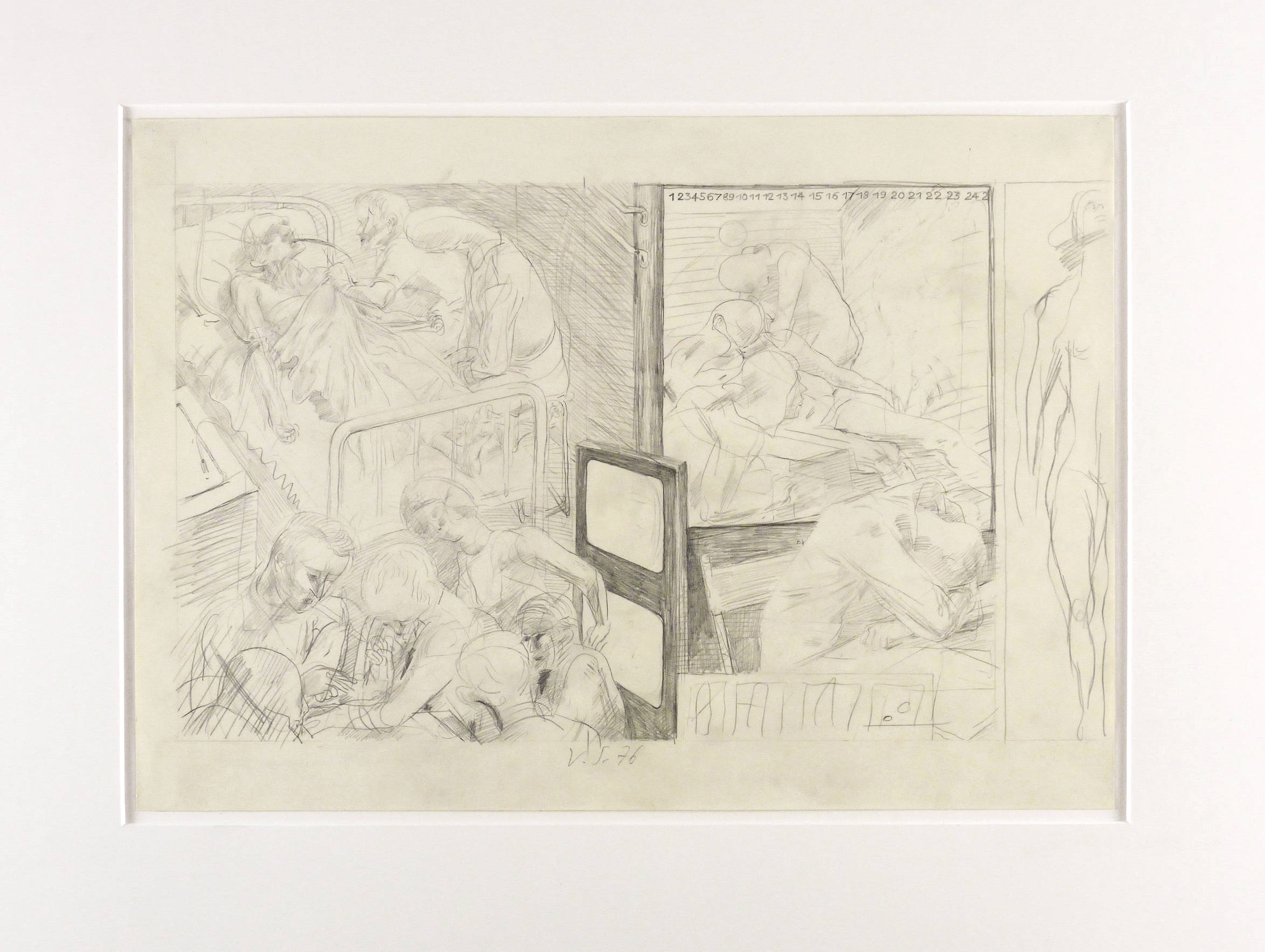 1976. Zeichnung / Bleistiftzeichnung, auf hellchamois Velin. – Originale Künstlergrafik, von Volker Stelzmann. – Unikat. – 42,0 x 59,7 cm (Darstellung / Blatt), 70 x 90 cm (Passepartout).