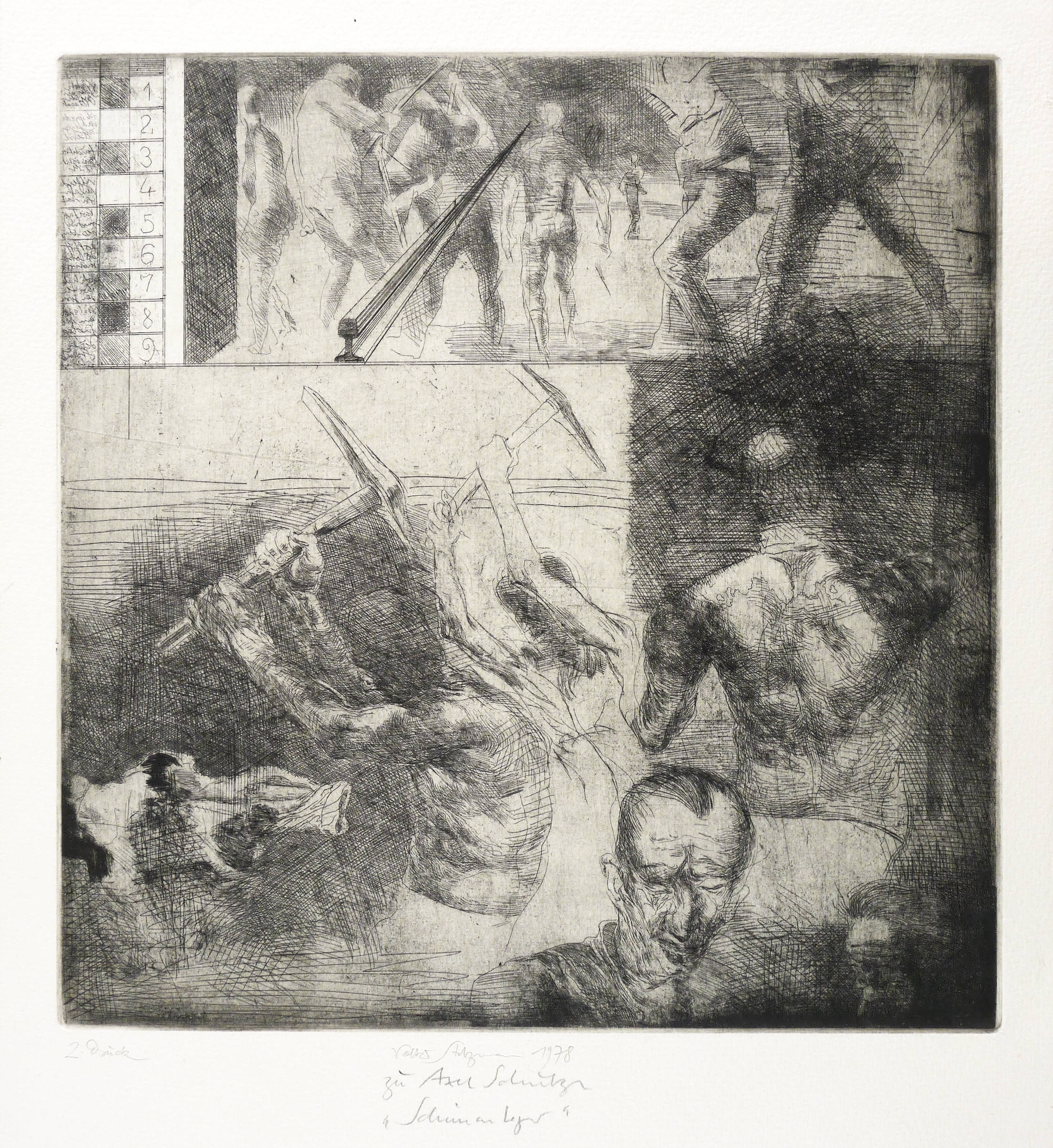 Behrends-Musinowski 86. – Unterhalb in Bleistift signiert und datiert: ″Volker Stelzmann 1978″. Darunter Titel: ″zu Axel Schulze 'Schienenleger'″. Links Auflagenbezeichnung. ″2. Druck″. – Sehr guter Zustand.