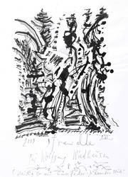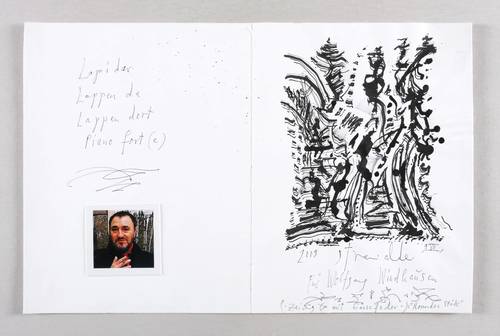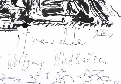 Unterhalb in Tusche signiert und datiert: ″2009 strawalde 9.VII.″ Darunter WIdmaung an Wolfgang Windhausen und Bezeichnung: ″Zeichnung (mit Gänsefeder) = Rasendes Stück″. Links davon Inschrift: ″Lapidar / Lappen da / Lappen dort / Piano fort(e)″. – Doppelseite auf Karton aufgezogen. Guter Zustand.