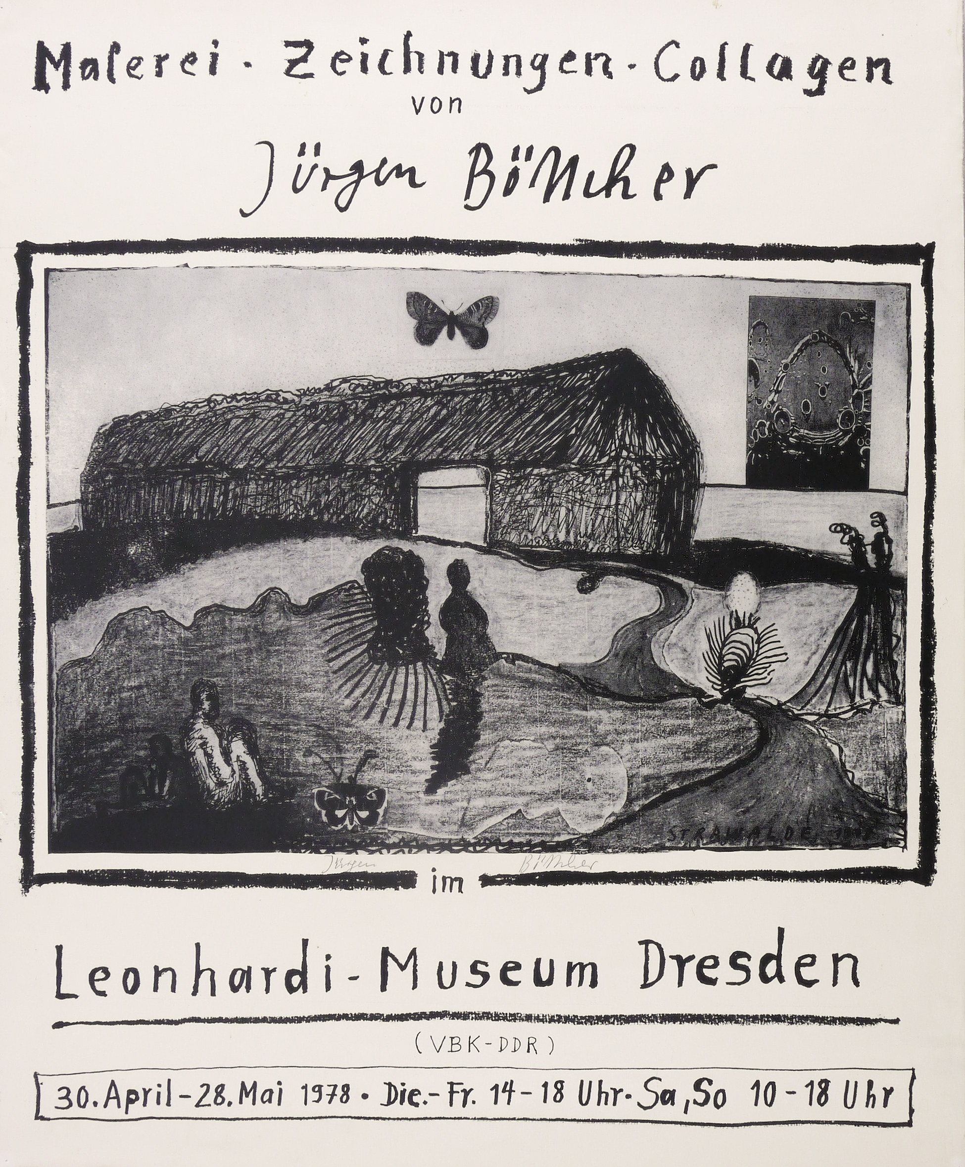 Unterhalb der Darstellung in Bleistift signiert: ″Jürgen Böttcher″. In der Darstellung rechts unten gedruckte Signatur mit Jahr: ″STRAWALDE 1978″. Dazu Plakat-Inschrift. – Originalgrafisches Künstlerplakat zur Ausstellung ″Malerei, Zeichnungen, Collagen von Jürgen Böttcher″ im Leonhardi-Museum in Dresden 30.4.-28.5.1978. – Provenienz: Sammlung Gerlint Söder und Erhard Frommhold, Dresden. – Links kleiner reparierter Randriss (8 mm). Sonst guter Zustand.