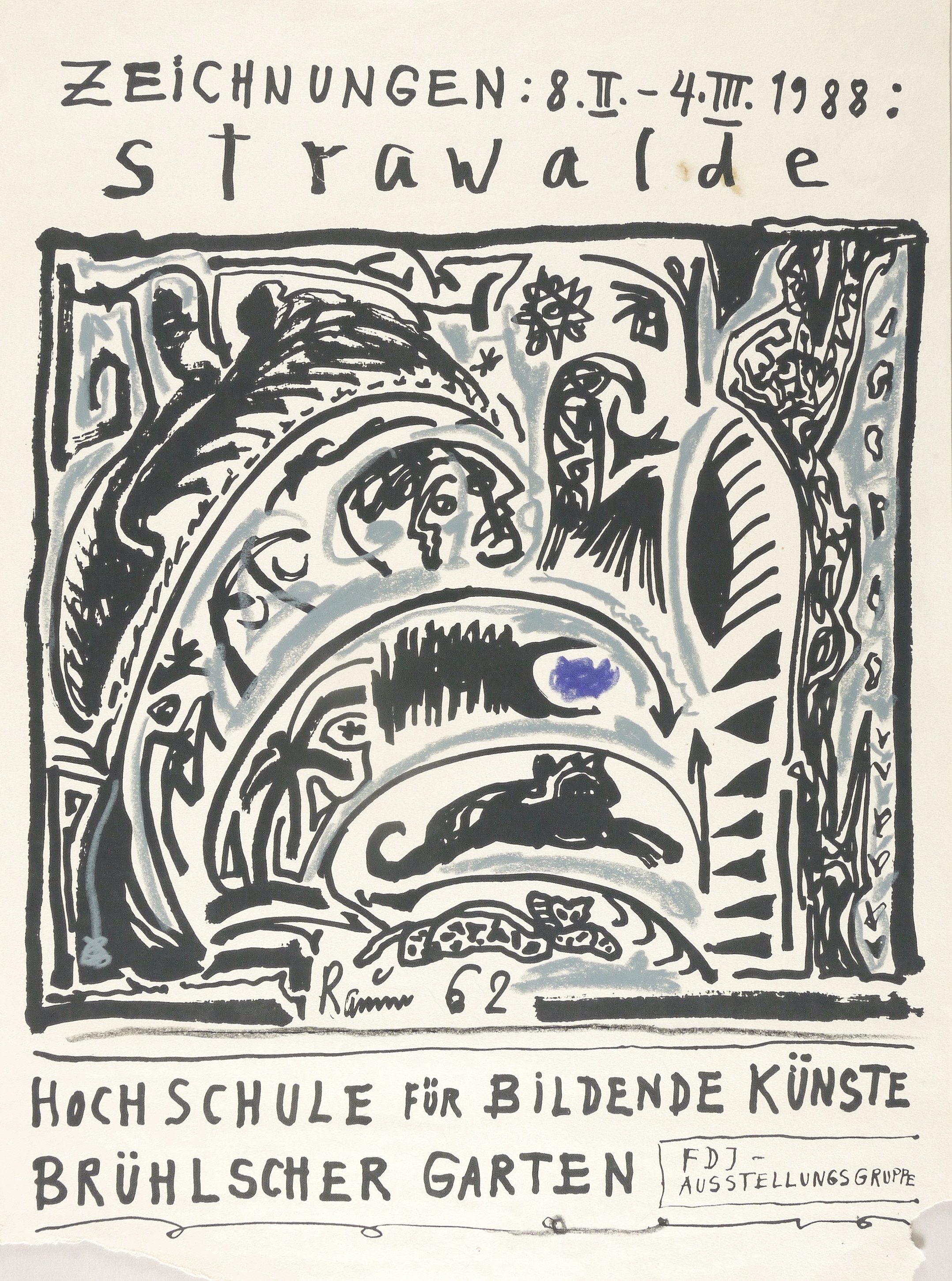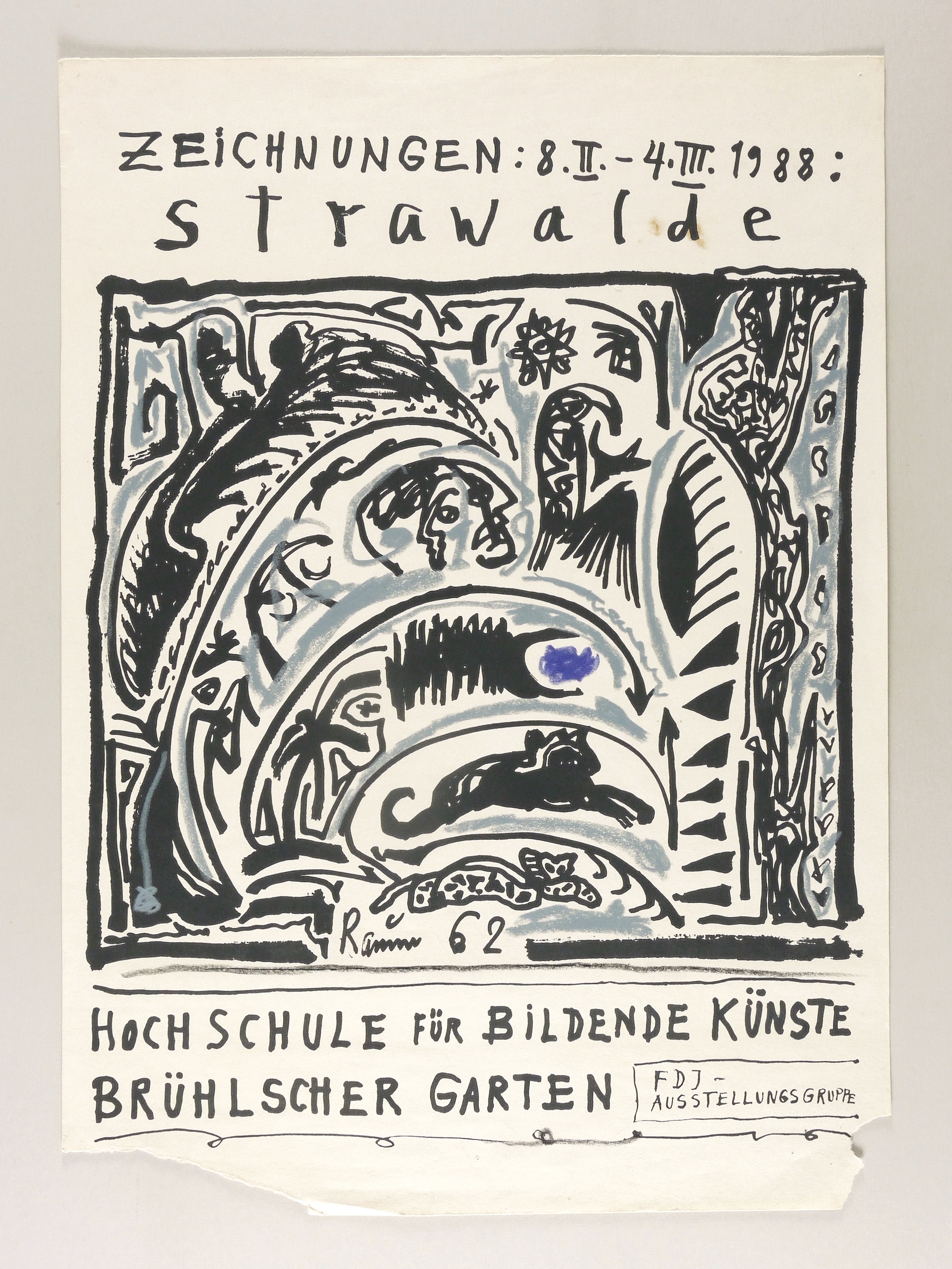 Nicht handsigniert. – Originalgrafisches Künstlerplakat zur Ausstellung ″Zeichnungen. Strawalde″ in der Hochschule für Bildende Künste (HfBK) in Dresden 8.2.-4.3.1988. – Im unteren Rand Eckenausrisse außerhalb der Darstellung bzw. des Druckbildes. Mangelhafter Zustand.