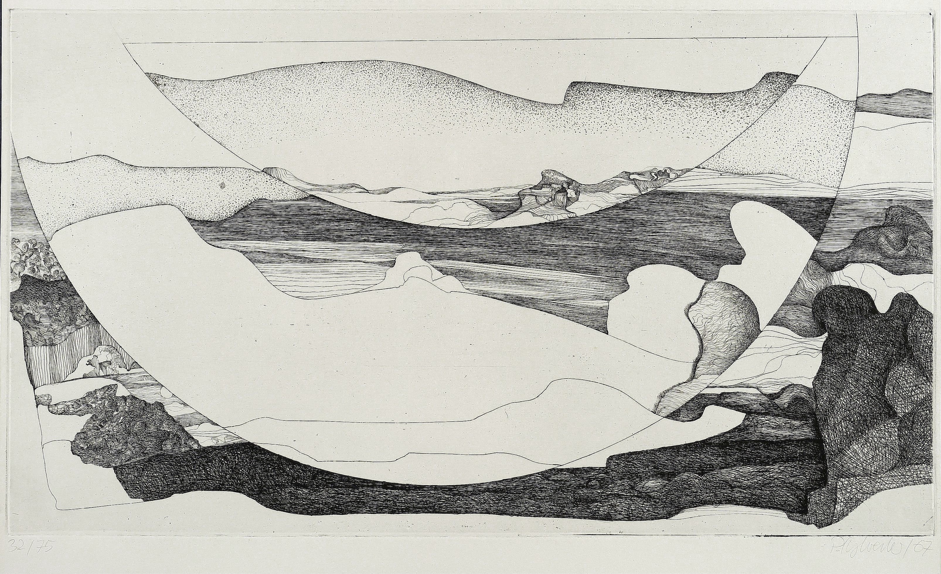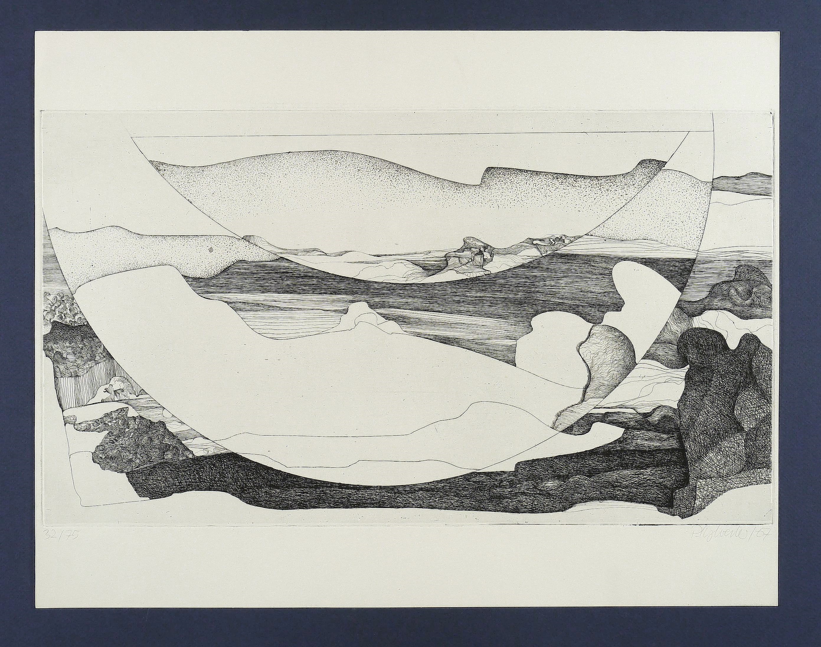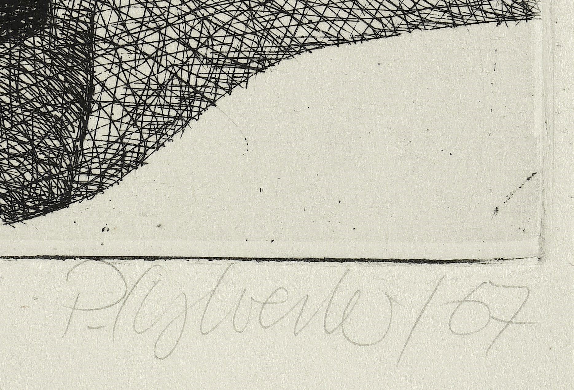 1967. Radierung / Strichätzung, in Schwarz, auf hellchamois Velinkarton. – Originale Künstlergrafik, von Peter Sylvester. – Auflage Exemplar Nr. 32/75. – 28,0 x 48,7 cm (Darstellung / Platte), 38,5 x 49,5 cm (Blatt).
