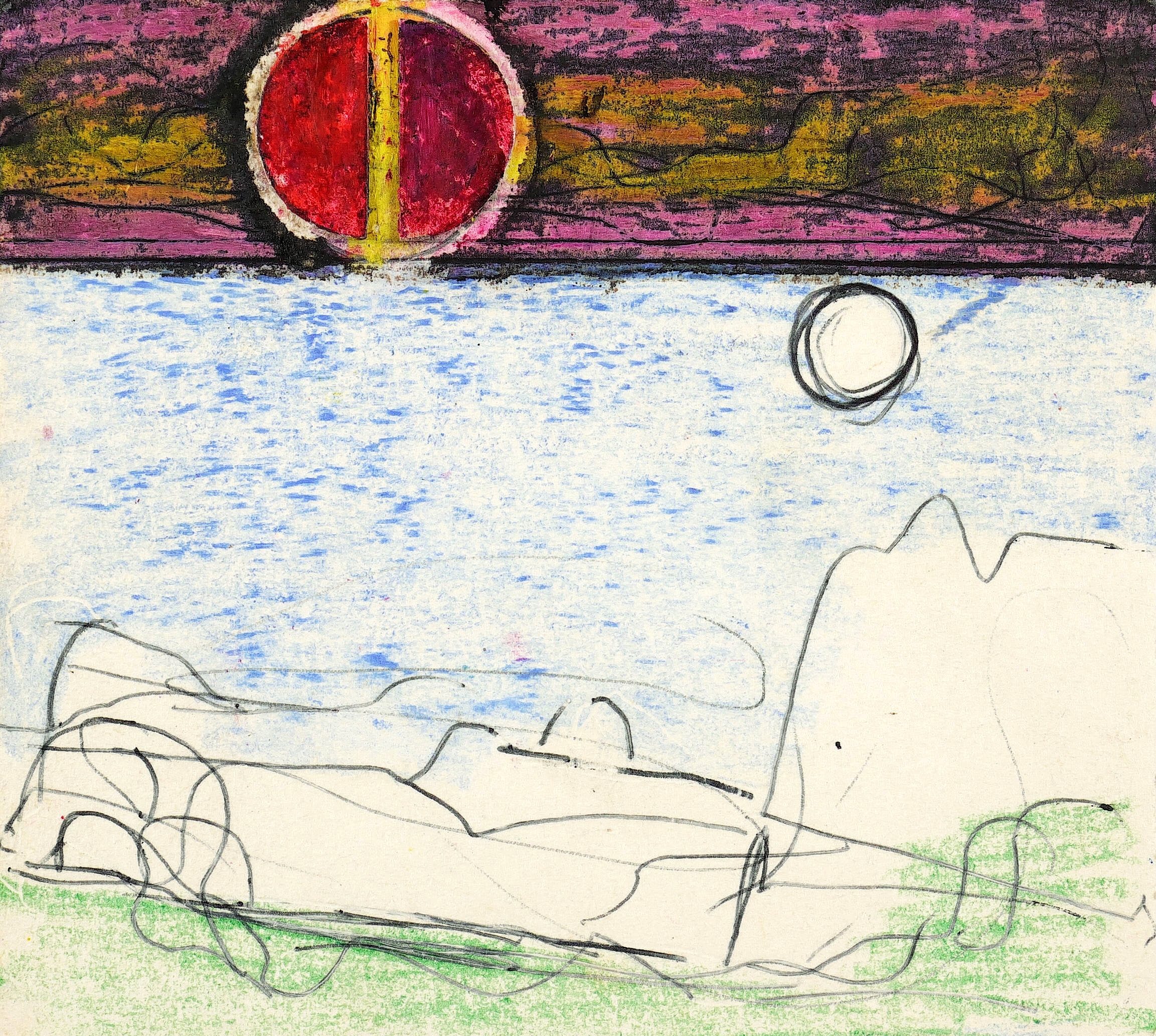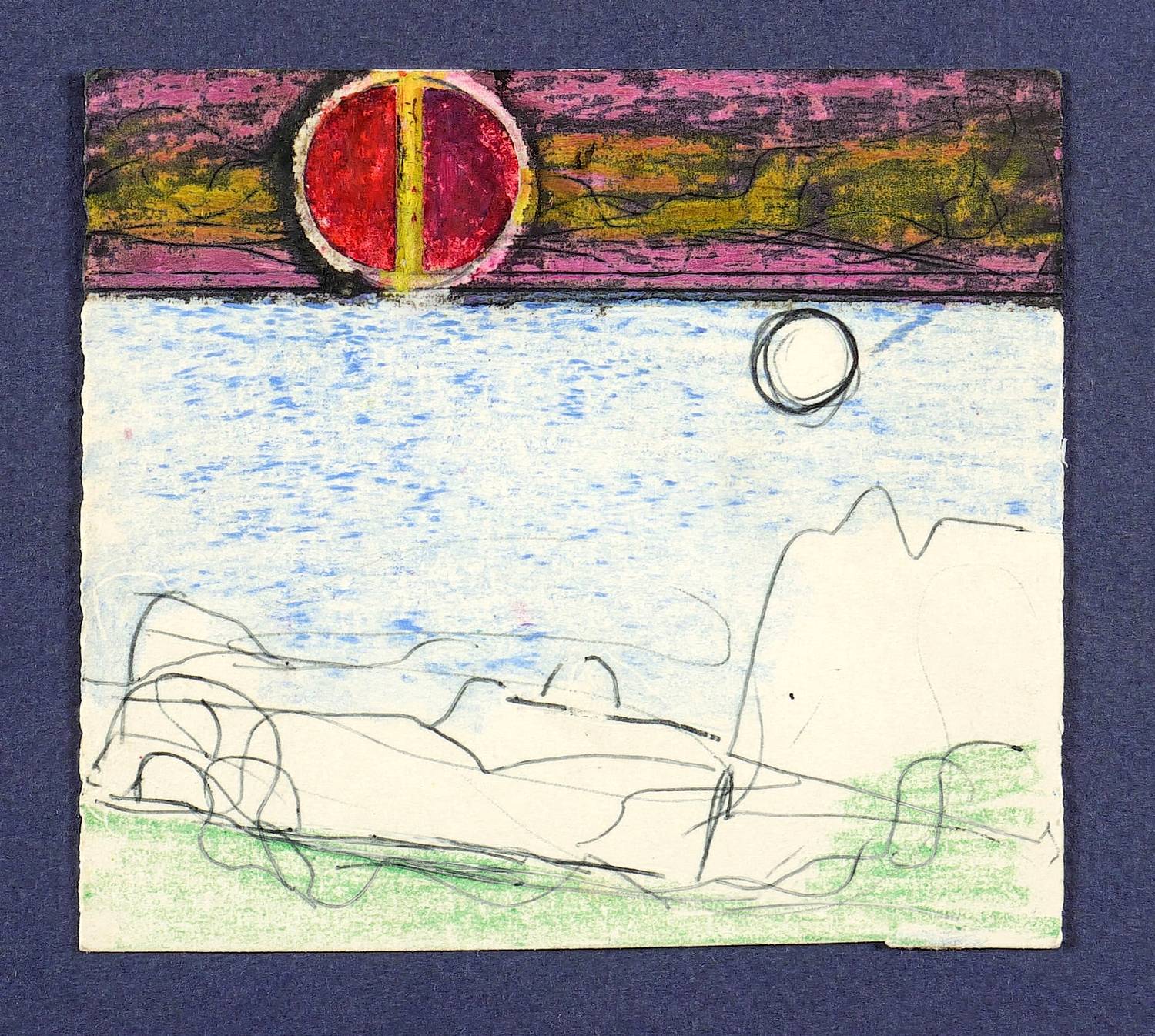 1967. Mischtechnik / Wachskreide & Collage, auf Karton. – Originale Künstlergrafik, von Peter Sylvester. – Unikat. – 9,5 x 10,5 cm (Darstellung / Blatt).