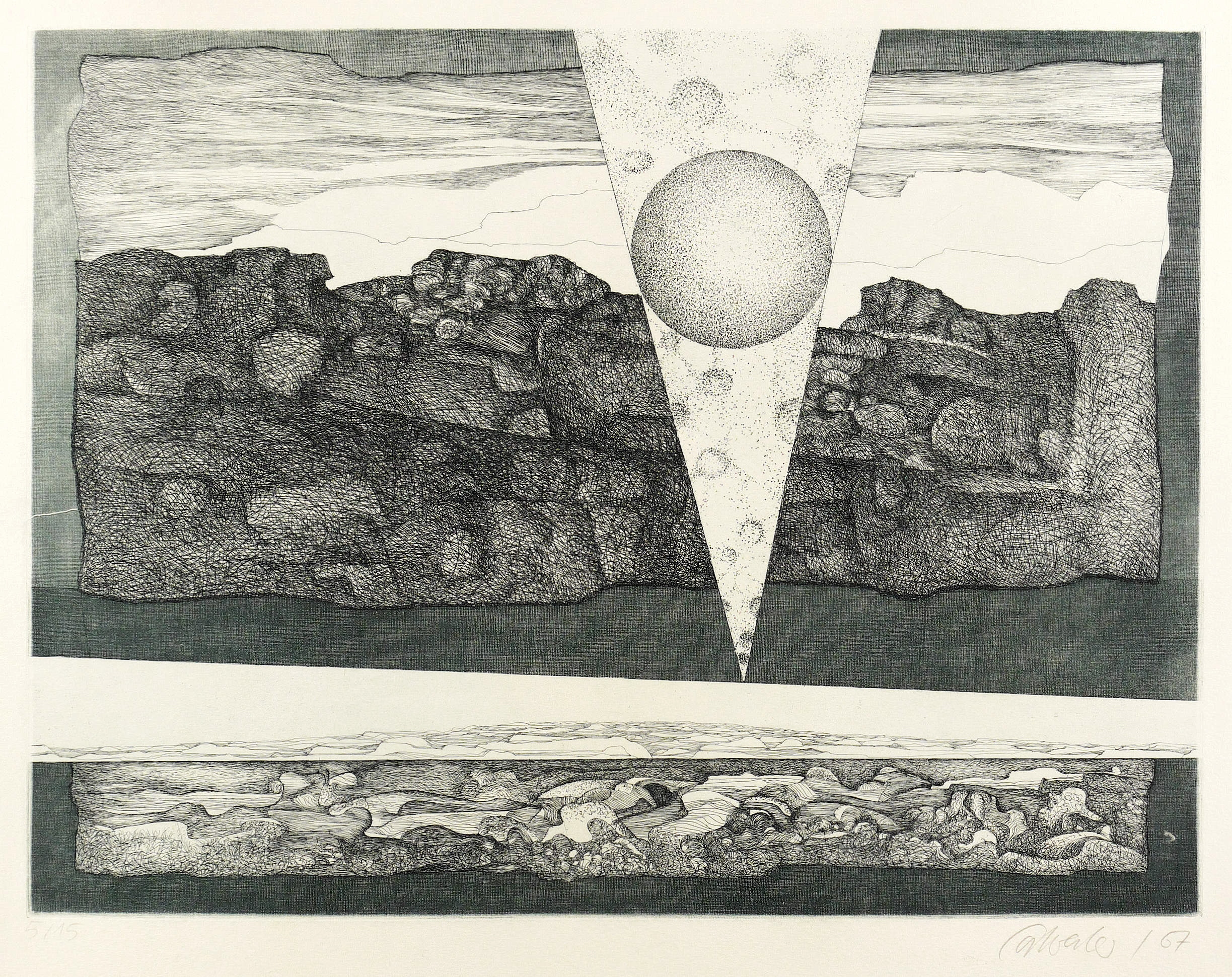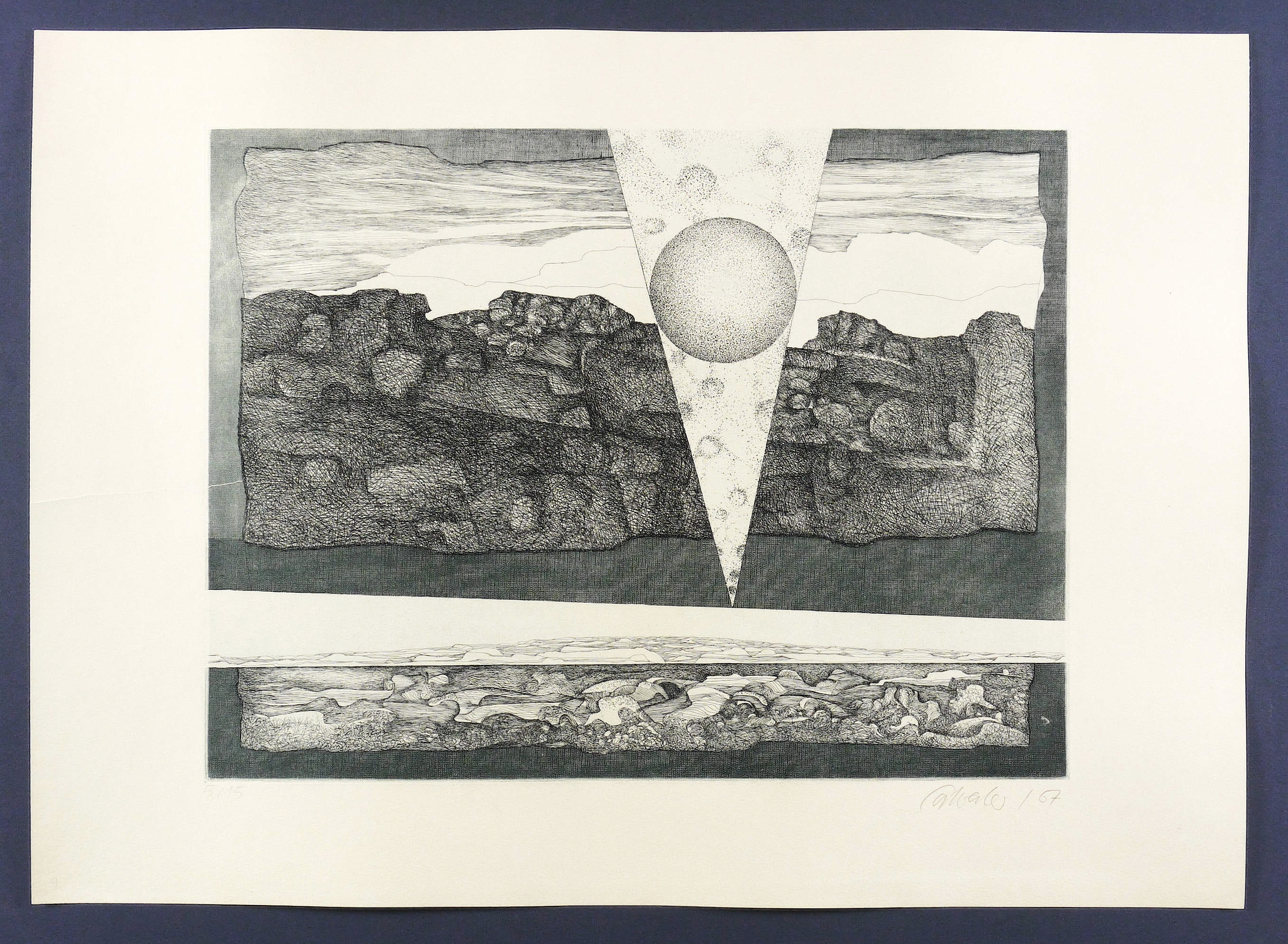 1967. Farbradierung / Strichätzung, Vernis mou & Aquatinta, in Braunschwrz & Grünschwarz, auf Büttenkarton. – Originale Künstlergrafik, von Peter Sylvester. – Auflage Exemplar Nr. 5/15. – 37,4 x 49,5 cm (Darstellung / Platte), 50 x 70 cm (Blatt).