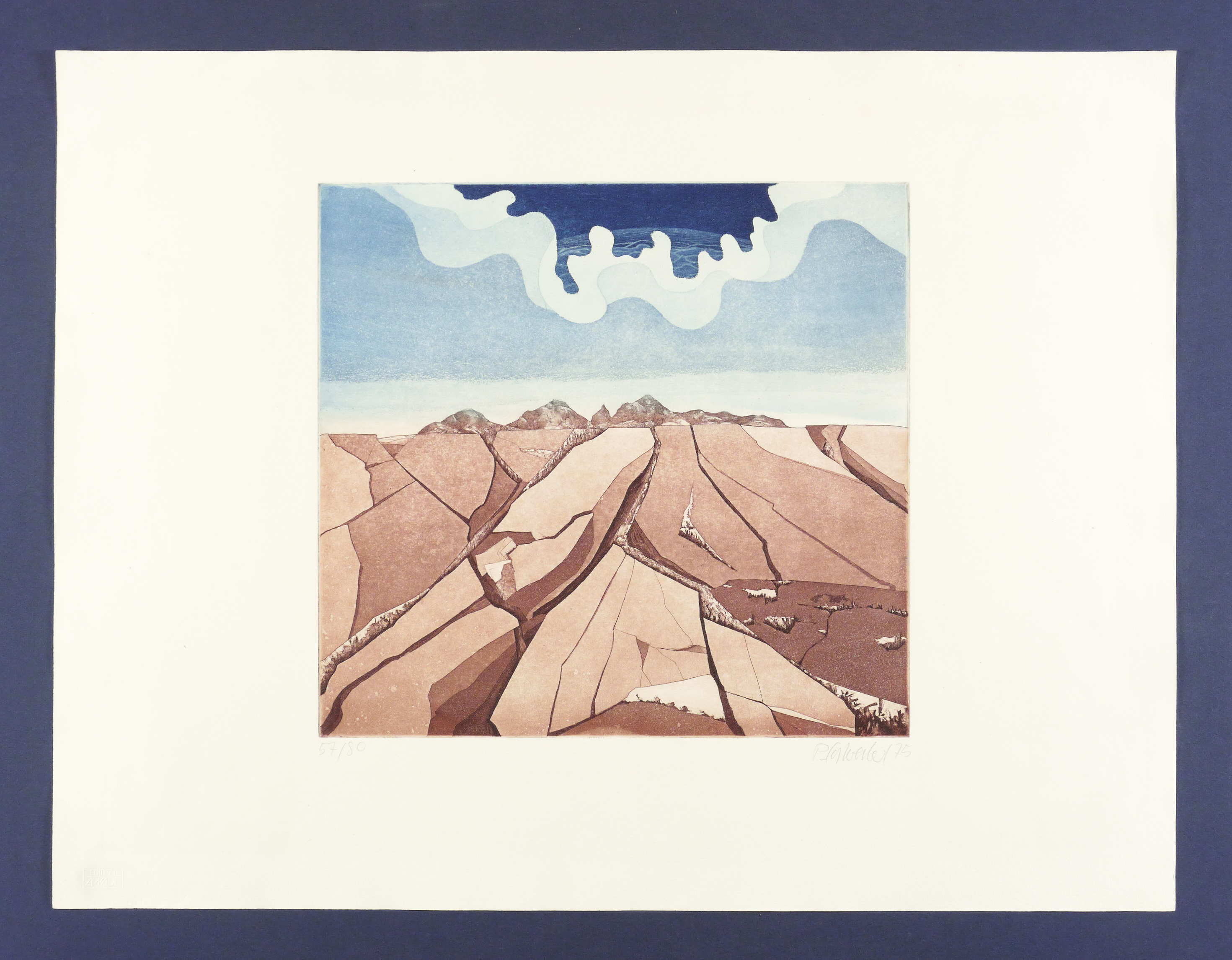 1975. Farbradierung / Farbaquatinta, in Aubergine & Blau, auf Weißenborn-Bütten. – Originale Künstlergrafik, von Peter Sylvester. – Auflage Exemplar Nr. 57/80. – 32,2 x 34,3 cm (Darstellung / Platte), 50 x 65 cm (Blatt).