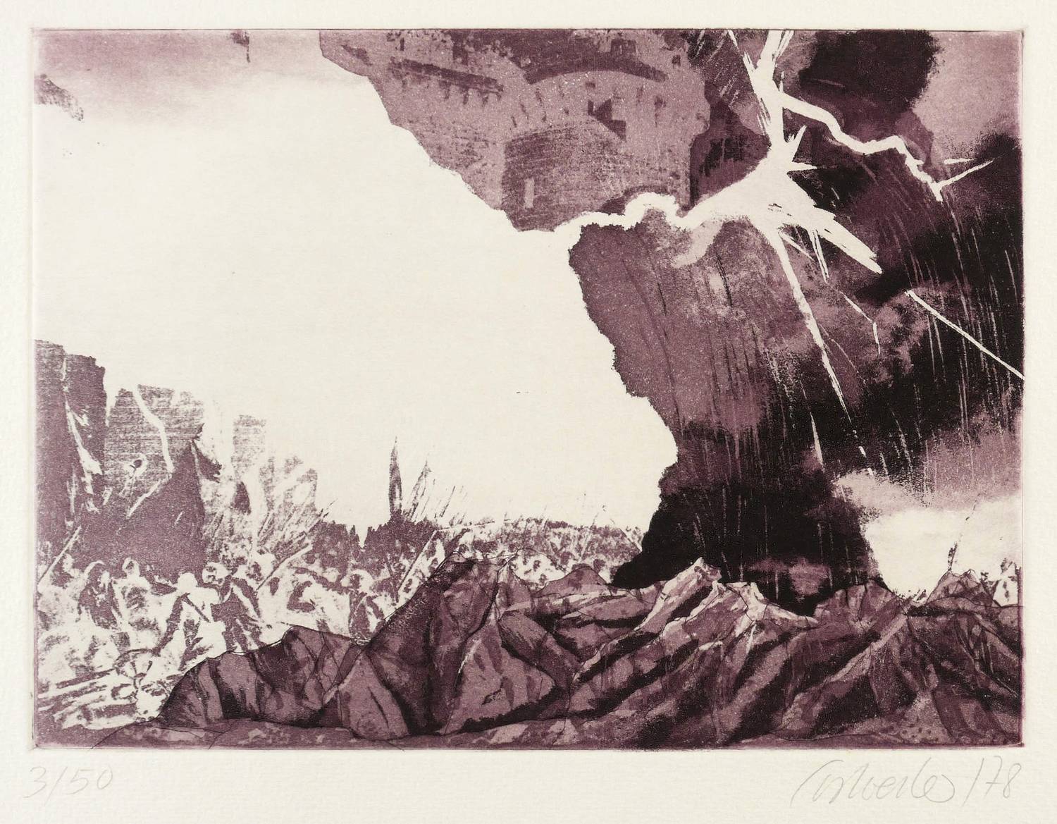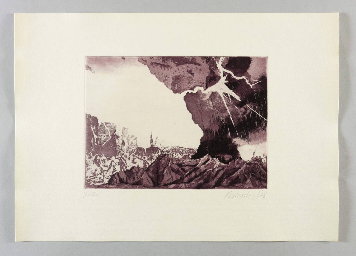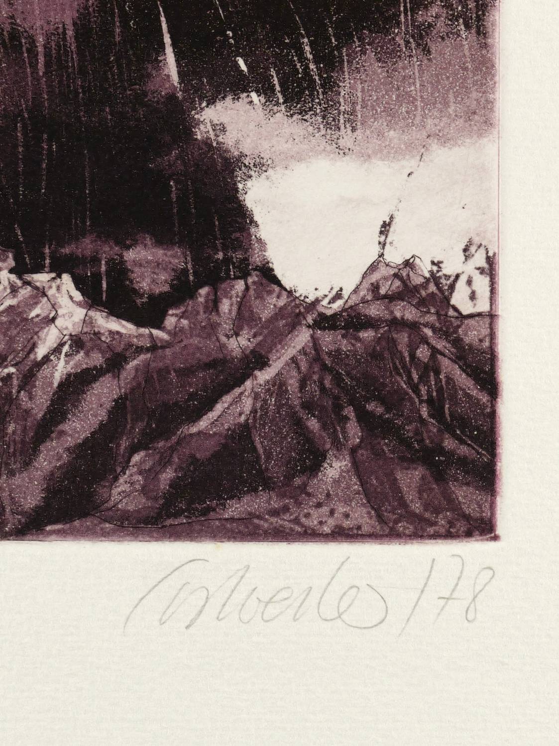 1978. Radierung / Aquatinta, in Violett, auf hellgelbem Karton. – Von Peter Sylvester. – Auflage Exemplar Nr. 3/50. – 19,8 x 27,0 cm (Darstellung / Platte), 34 x 48 cm (Blatt).