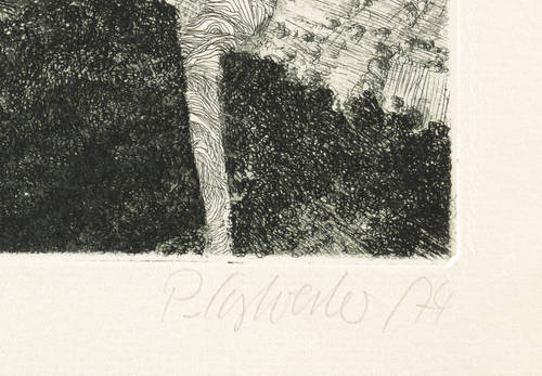 1974. Radierung / Strichätzung & Aquatinta, in Schwarzblau, auf festem gehämmertem Maschinenpapier. – Von Peter Sylvester. – 13,8 x 11,7 cm (Darstellung / Platte), 22 x 15 cm (Blatt).