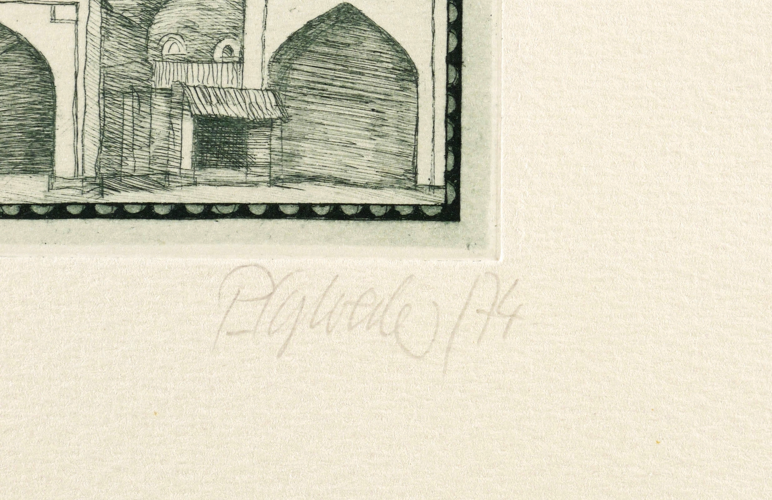 1974. Radierung / Strichätzung & Aquatinta, in Schwarzblau, auf festem gehämmertem Maschinenpapier. – Originale Künstlergrafik, von Peter Sylvester. – Auflage 10 Exemplare. – 12,9 x 10,4 cm (Darstellung / Platte), 31 x 21 cm (Blatt).