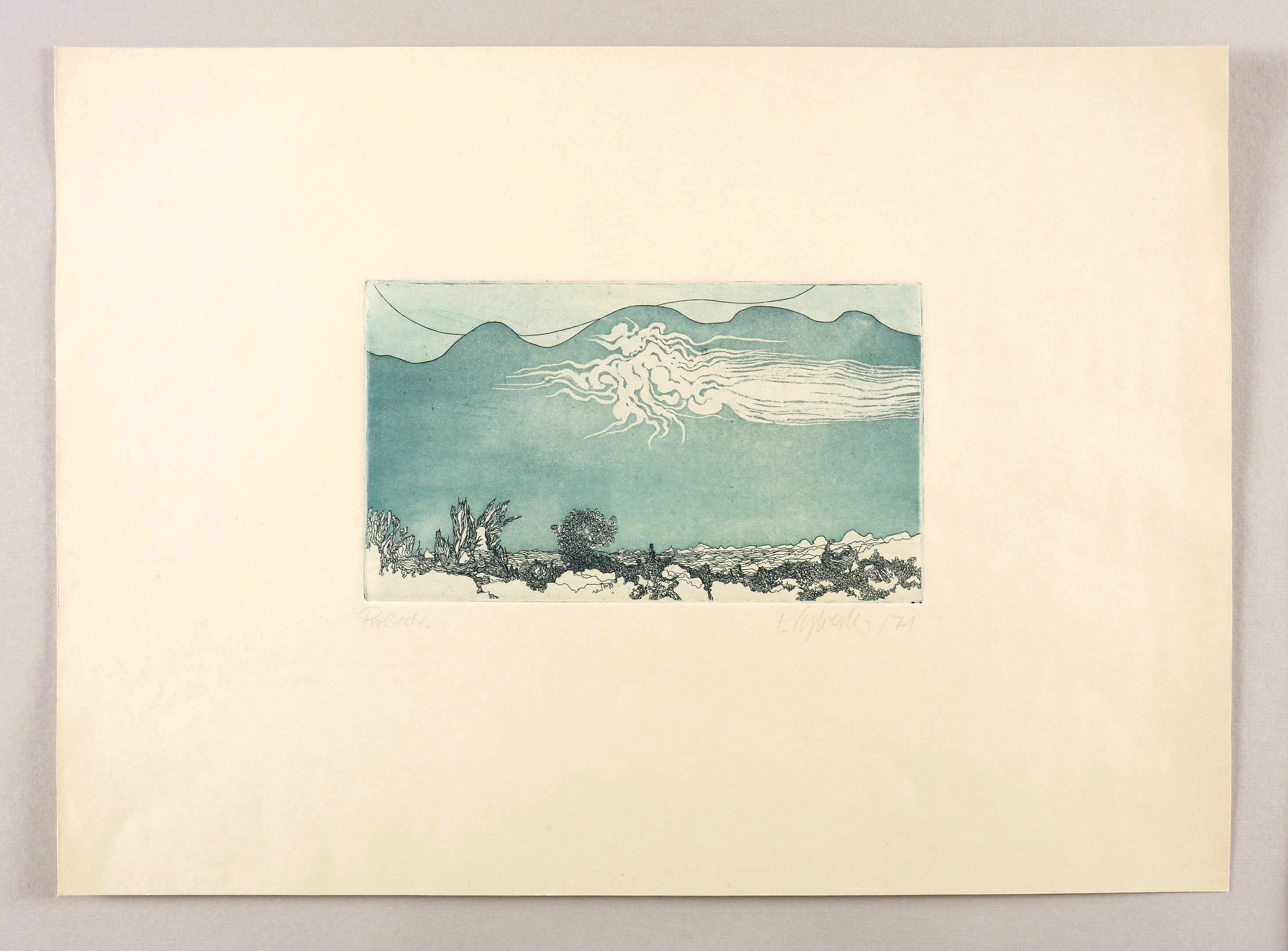 1971. Radierung / Aquatinta & Strichätzung, in Türkis, auf glattem gelbem Karton. – Originale Künstlergrafik, von Peter Sylvester. – Probedruck. – 13,4 x 23,5 cm (Darstellung / Platte), 36 x 49 cm (Blatt).