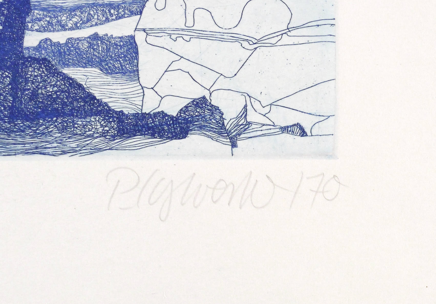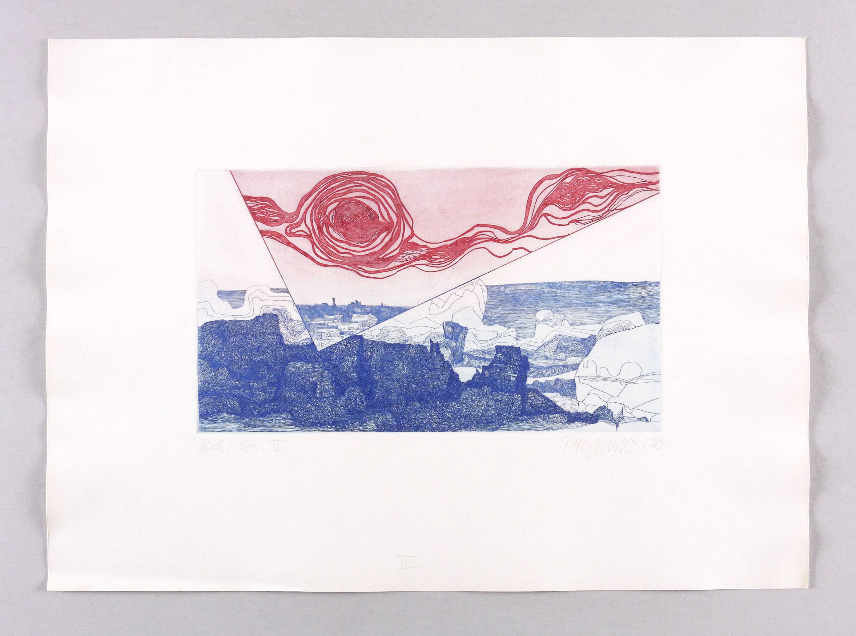 1970. Farbradierung / Strichätzung & Aquatinta, in Blau & Rot, auf festem hellchamois Velin. – Originale Künstlergrafik, von Peter Sylvester. – Künstlerexemplar (e.a.) Nr. V. – 16,8 x 29,0 cm (Darstellung / Platte), 35 x 48 cm (Blatt).