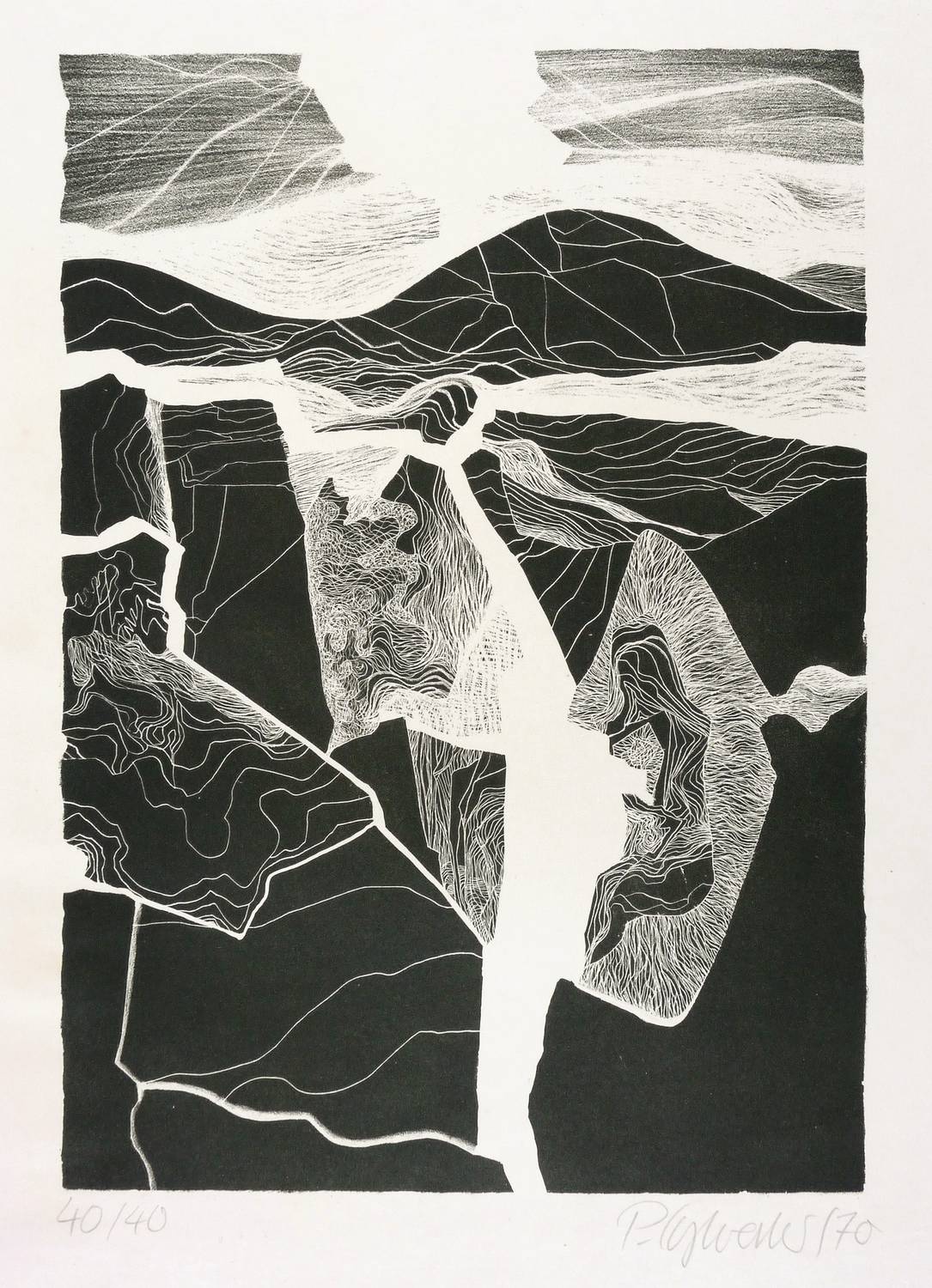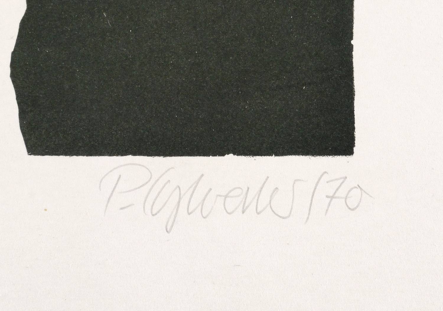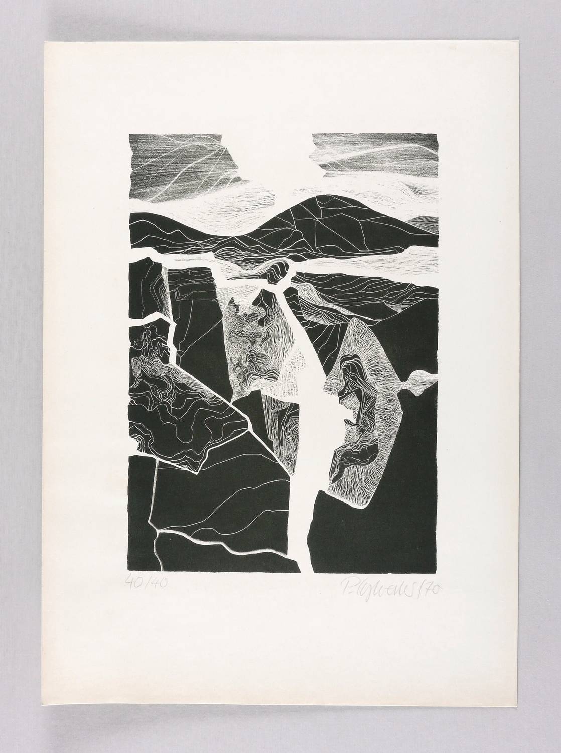 1970. Lithografie / Schablithografie, in Schwarz, auf weißem Karton. – Originale Künstlergrafik, von Peter Sylvester. – Auflage Exemplar Nr. 40/40. – 27,7 x 19,5 cm (Darstellung), 42 x 30 cm (Blatt).