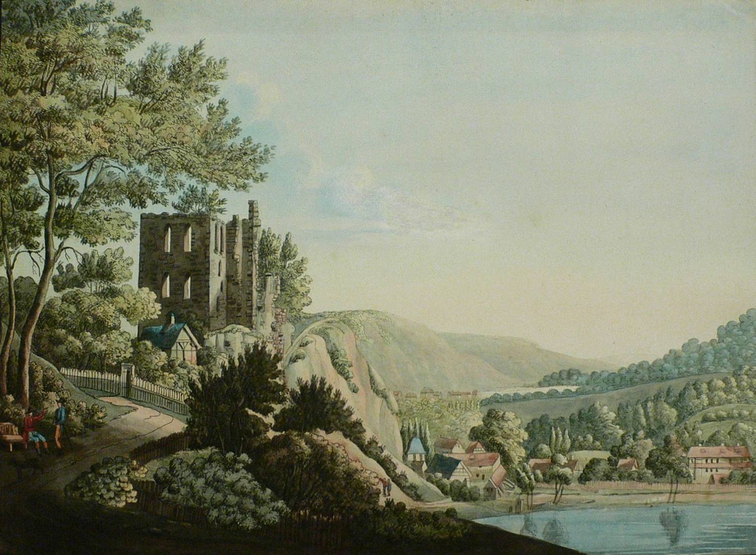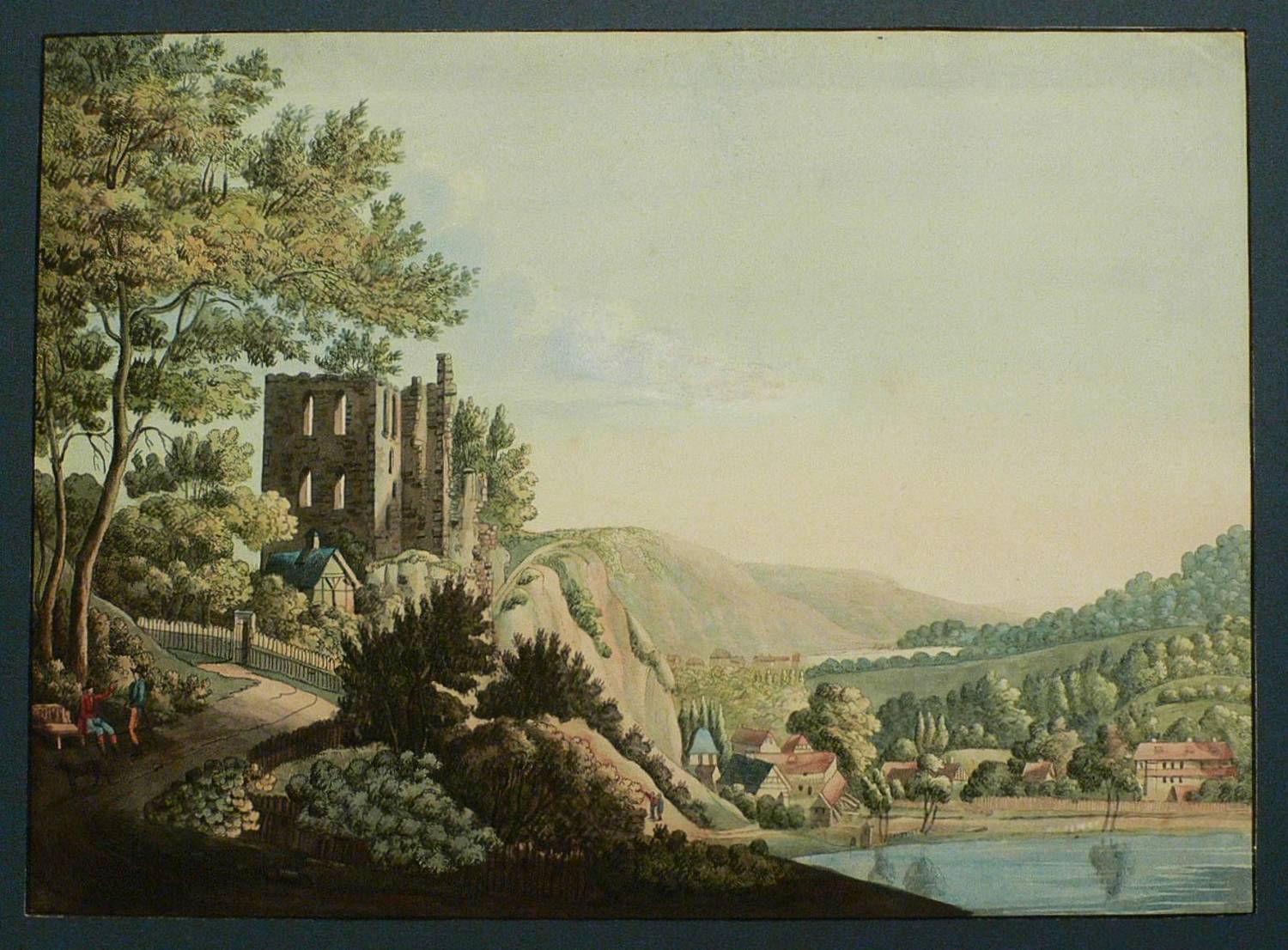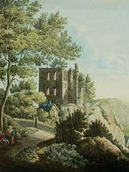 Verso in Bleistift bezeichnet. – Romantische Ansicht der Ruine der aus dem frühen 13. Jahrhundert stammenden Burg Tharandt. Im Vordergrund links zwei Wanderer. – Restaurierte Fehlstelle im Kolorit im Bereich des Himmels. Der Rest des Blattes ist in gutem Erhaltungszustand.