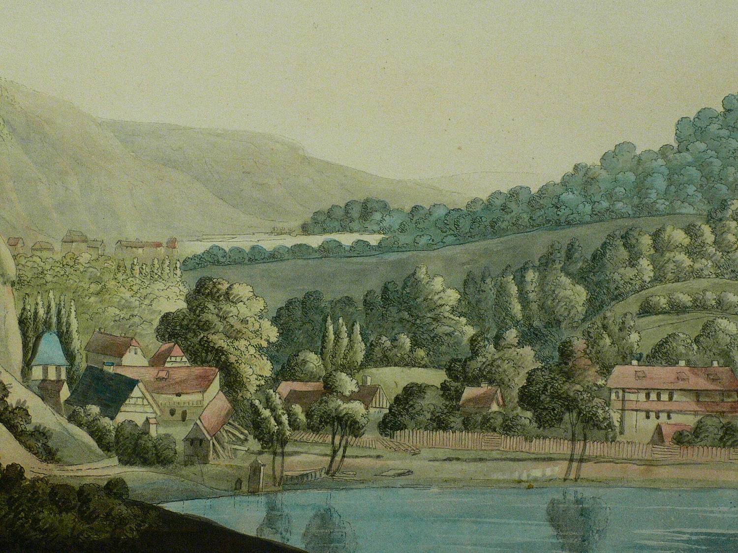 Um 1850. Federzeichnung, aquarelliert. – Historische Ortsansicht, von . – Unikat. – 32,0 x 44,0 cm (Darstellung / Einfassungslinie).