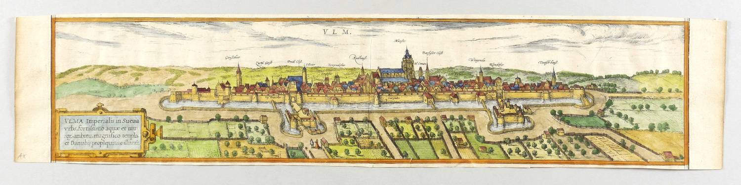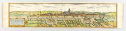 1572. Kupferstich, koloriert. – Historische Ortsansicht, von Franz Hogenberg. – 10,1 x 46,4 cm (Darstellung / ohne Schmuckrahmen), 11 x 52,5 cm (Blatt).