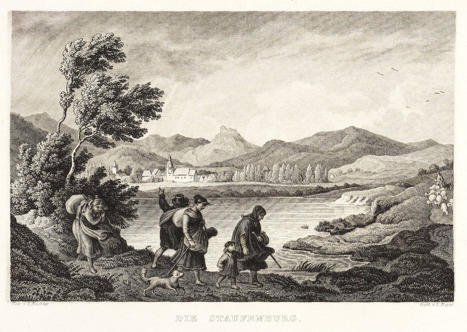 Adrian Ludwig Richter (1803 Dresden - 1884 Dresden). Bedeutender Maler, Zeichner und Grafiker der deutschen Romantik und des Biedermeier. Sohn des Zeichners und Kupferstechers Carl August Richter. Nach der Schulzeit begann er 1815 als Lehrling seines Vaters, studierte daneben an der Kunstakademie in Dresden. 1820/21 begleitete er den russischen Fürst Narischkin als Zeichner auf einer Reise nach Paris. 1823-26 reiste er nach Italien, wo er unter anderen mit Joseph Anton Koch und Julius Schnorr von Carolsfeld zusammentraf. Dies prägte seine idealistisch-harmonische Landschaftsauffassung. 1828-35 lehrte er an der Zeichenschule der Porzellanmanufaktur in Meißen, wo Gottfried Pulian zu seinen Schülern zählte. 1826 wurde er als Lehrer für Lasndschaftsmalerei an die Dresdner Kunstakademie berufen. Für die Reihe „Das malerische und romantische Deutschland“ des Leipziger Verlegers Georg Wigand schuf er die Ansichten für die Bände zu Harz, Franken und Riesengebirge. In den späten 1830er Jahren begann er mit Holzschnitt-Illustrationen für Bücher, die ihn unter einem größeren Laienpublikum in Deutschland bekannt machten. Schließlich wurde er zum Professor für Landschaftsmalerei in Dresden ernannt. 1873 musste er aufgrund eines Augenleidens mit dem Malen aufhören und schied 1876 aus der Kunstakademie in Dresden aus.