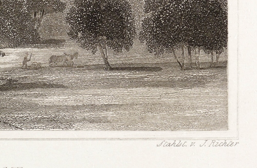 1846. Stahlstich. – Historische Ortsansicht, von Johann Richter. – 10,6 x 15,9 cm (Darstellung / ohne Schmuckrahmen), 14,5 x 22,5 cm (Blatt).