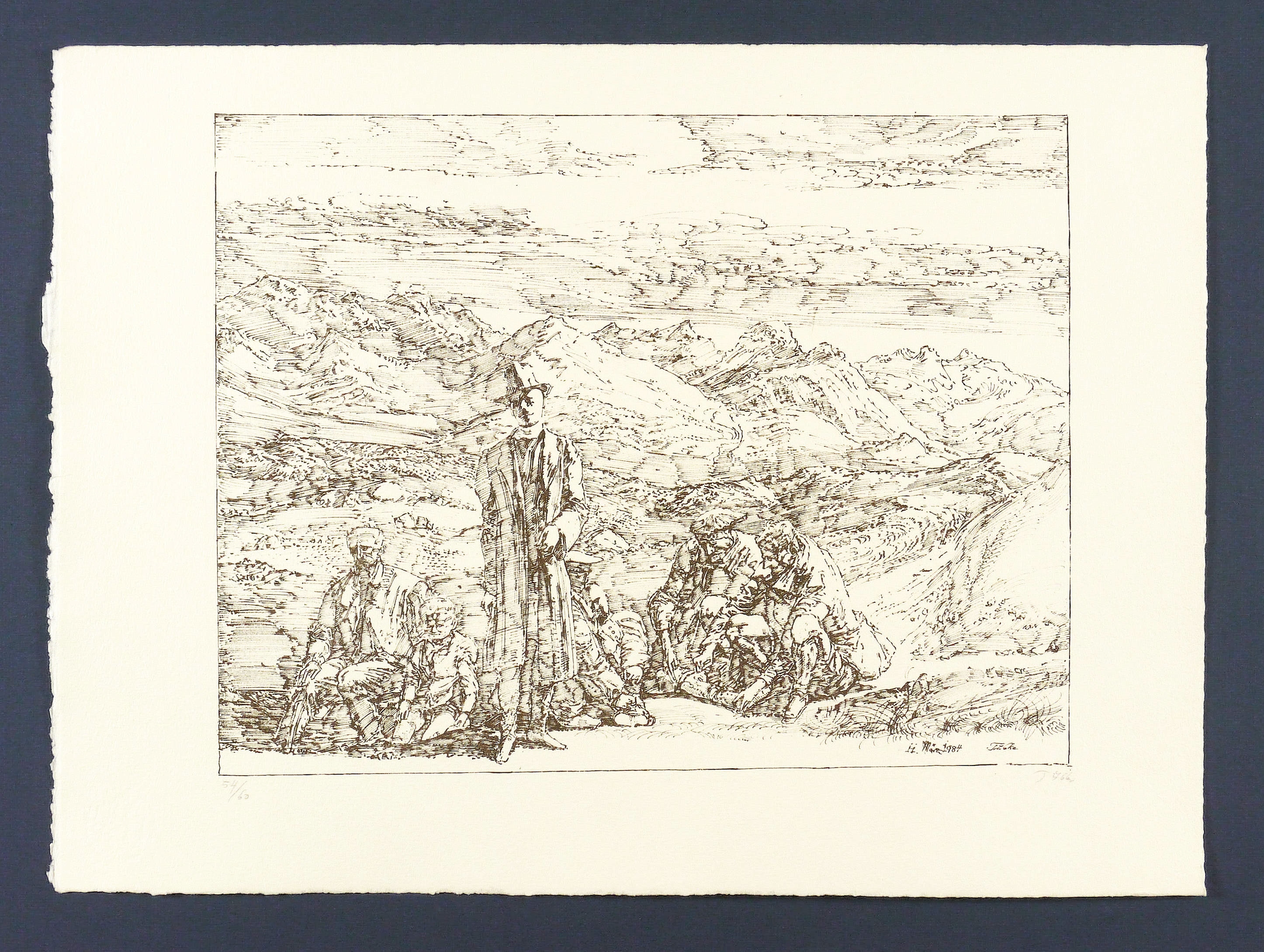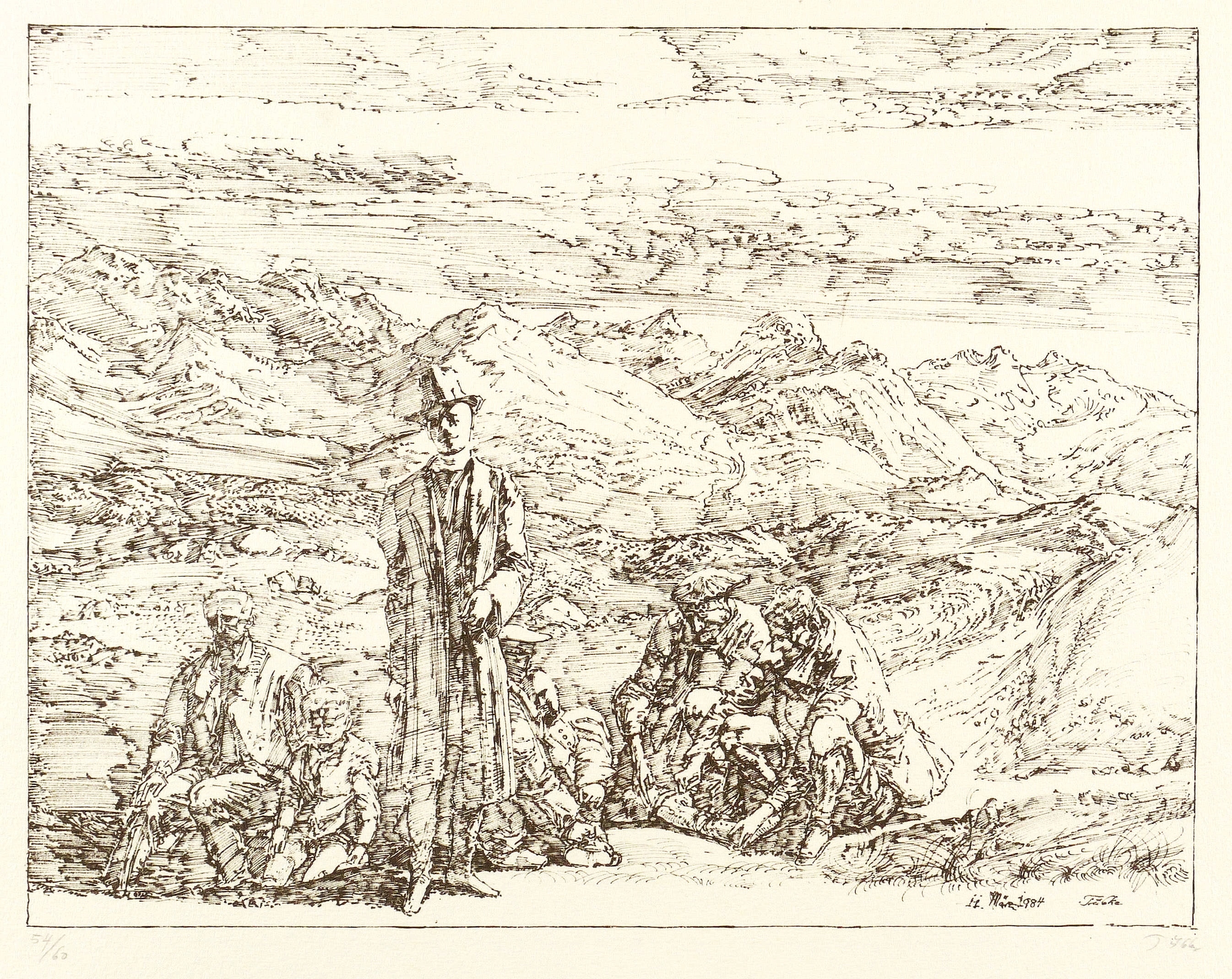 1984. Zinkografie / Federlithografie, in Schwarzbraun, auf Hahnemühle-Bütten. – Von Werner Tübke. – Auflage Exemplar Nr. 54/60. – 27,3 x 35,6 cm (Darstellung / Einfassungslinie), 35,5 x 48 cm (Blatt).