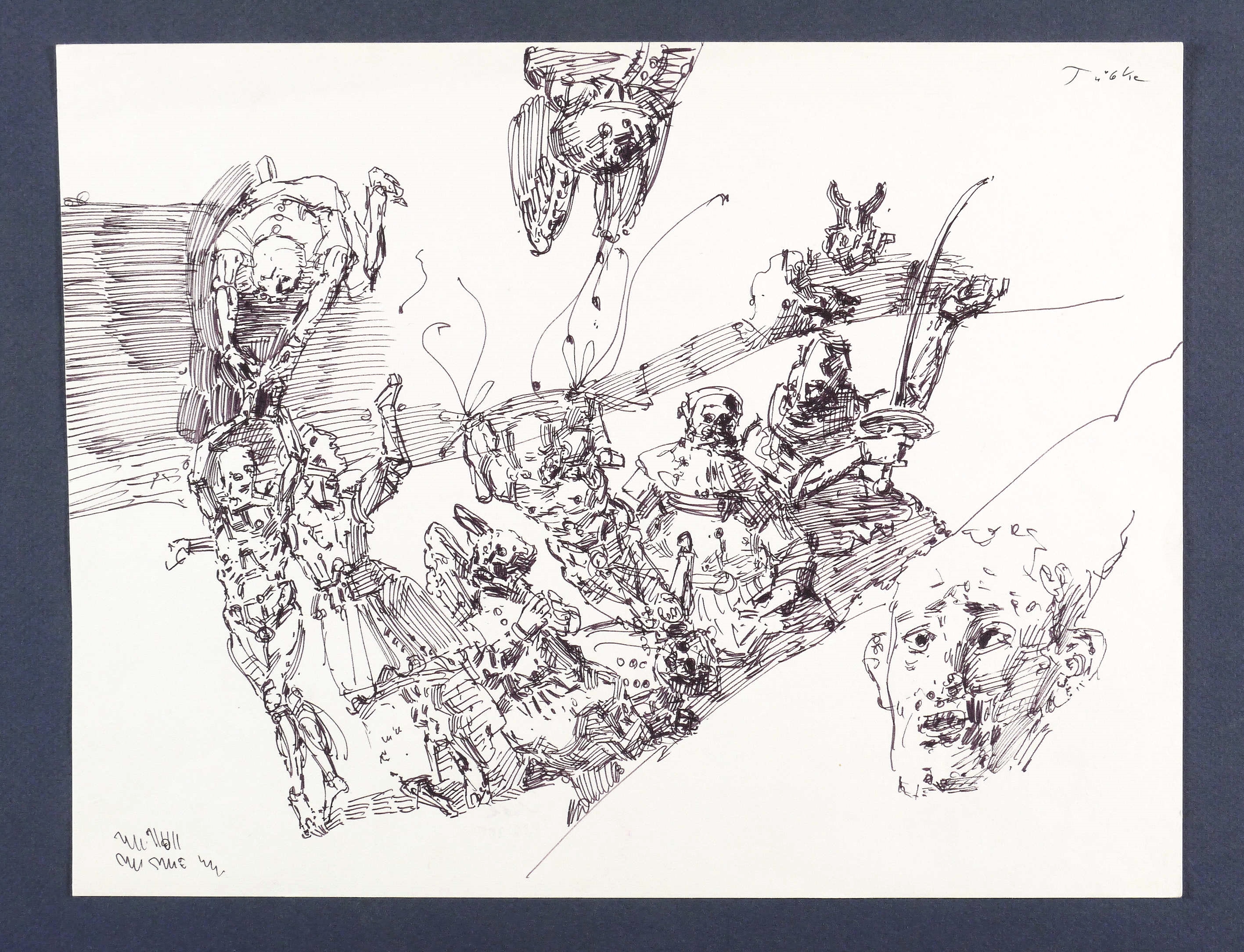 WVZ Z 73/73. – Rechts oben in Bleistift signiert: ″Tübke″. Verso Nachlass-Stempel. – Tanzreigen oder Aufzug diverser Figuren in historischer Montage durch eine Wiesenlandschaft führend. Ein nackter Mann, Hofdamen, der Tod, ein gestürzter Narr oder Komödiant, ein Gekreuzigter, eine maskierte Gestalt, ein Ritter, diverse Engel. Abseits der Kopf eines jungen Mannes, diese Szenerie wie vor dem inneren Auge an sich vorüberziehen lassend, mit dem Ausdruck des Staunens. - Geistreiches Blatt, sowohl motivisch als auch stilistisch zwischen den Arbeiten zum Bauernkriegsthema und zu ″Happening in Pompeij″ stehend. – Stempel unmerklich durchschlagend. Schwach ausgeprägte Knickspur links oben. Insgesamt guter Zustand.