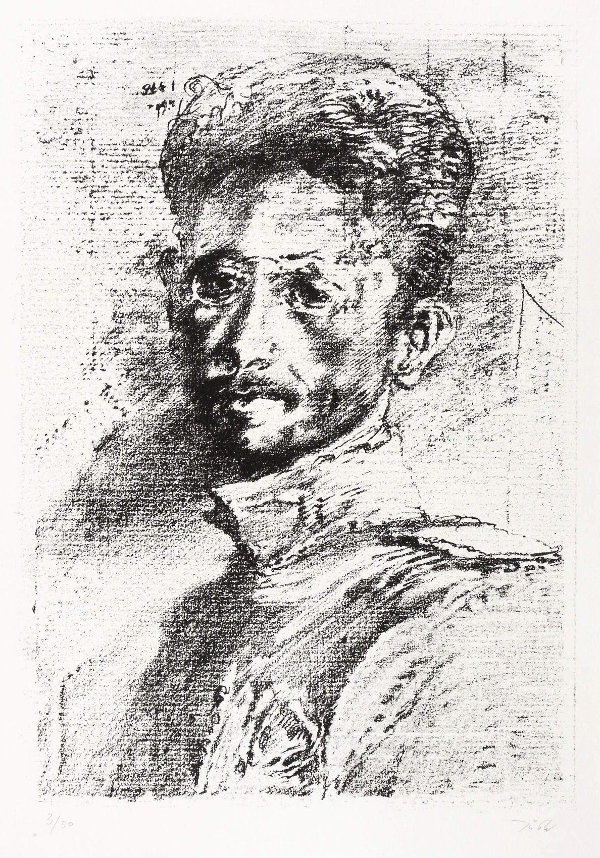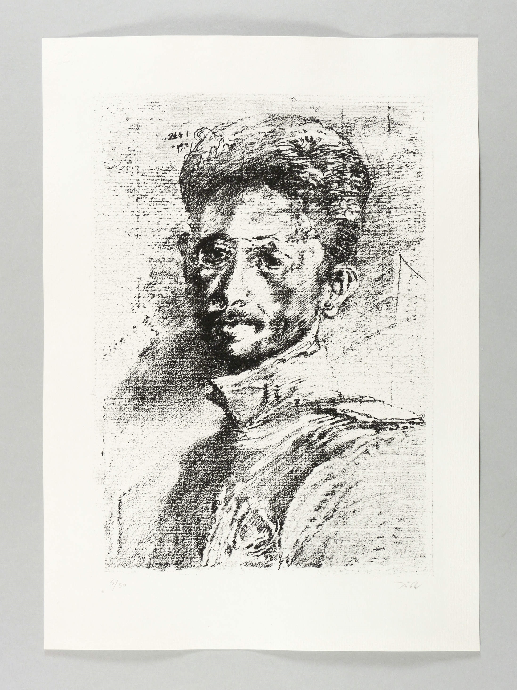 1978. Lithografie / Kreidelithografie, in Schwarz, auf weißem Büttenkarton. – Von Werner Tübke. – Auflage Exemplar Nr. 3/50. – 37,5 x 26,5 cm (Darstellung), 48 x 34 cm (Blatt).