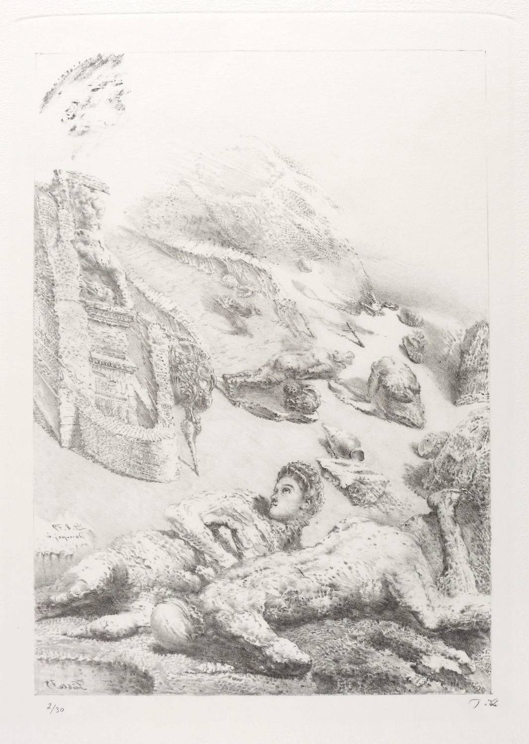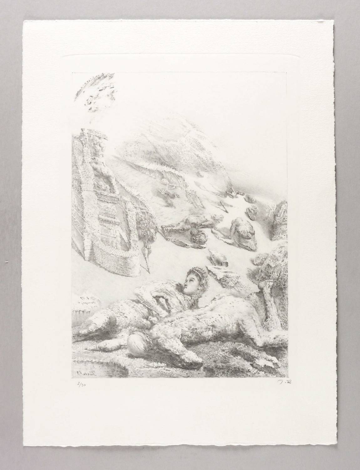 1979. Lithografie / Kreidelithografie, in Schwarz, auf schwerem hellem Hahnemühle-Bütten. – Originale Künstlergrafik, von Werner Tübke. – Auflage Exemplar Nr. 2/30. – 38,5 x 27,3 cm (Darstellung / Einfassungslinie), 54 x 40 cm (Blatt).