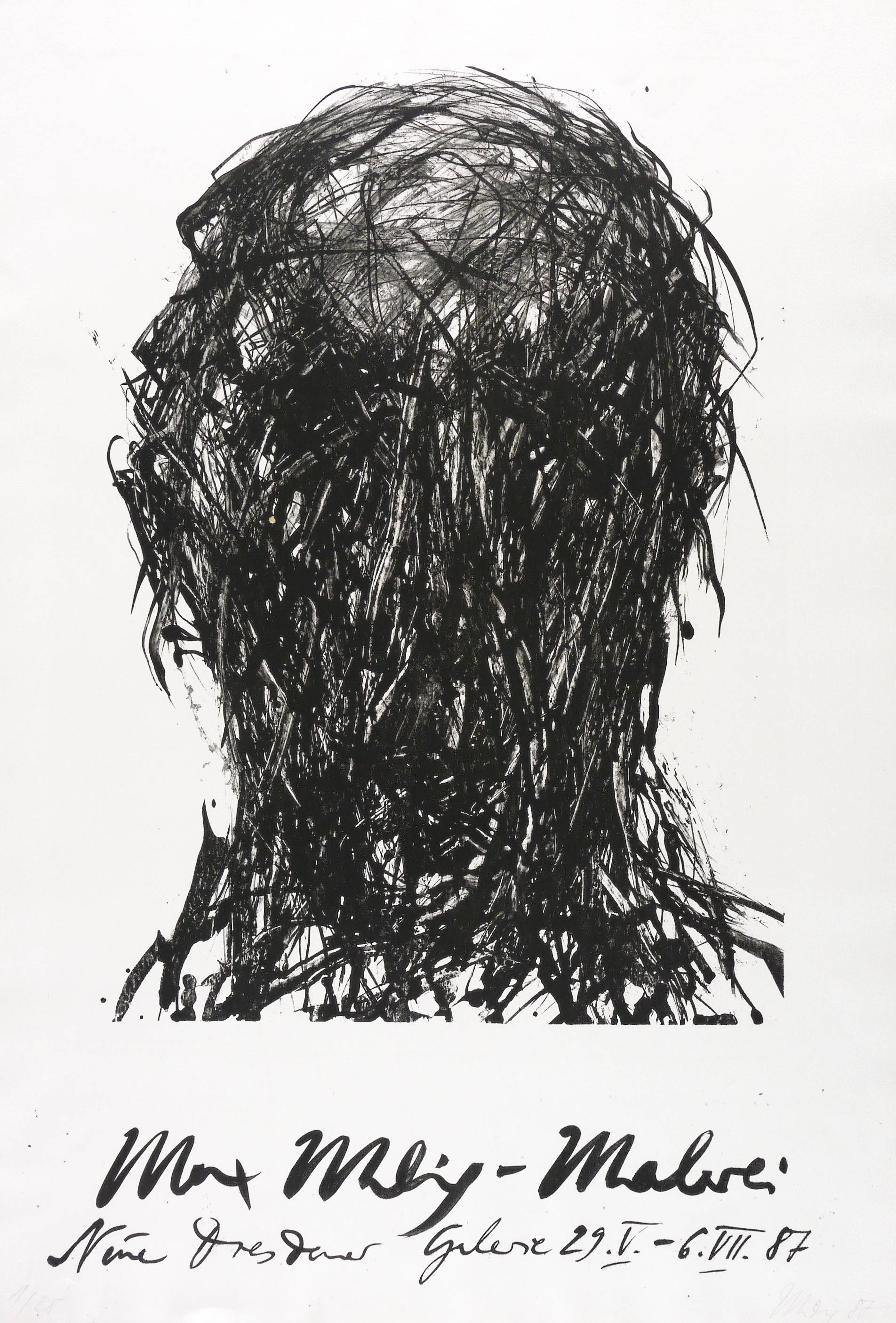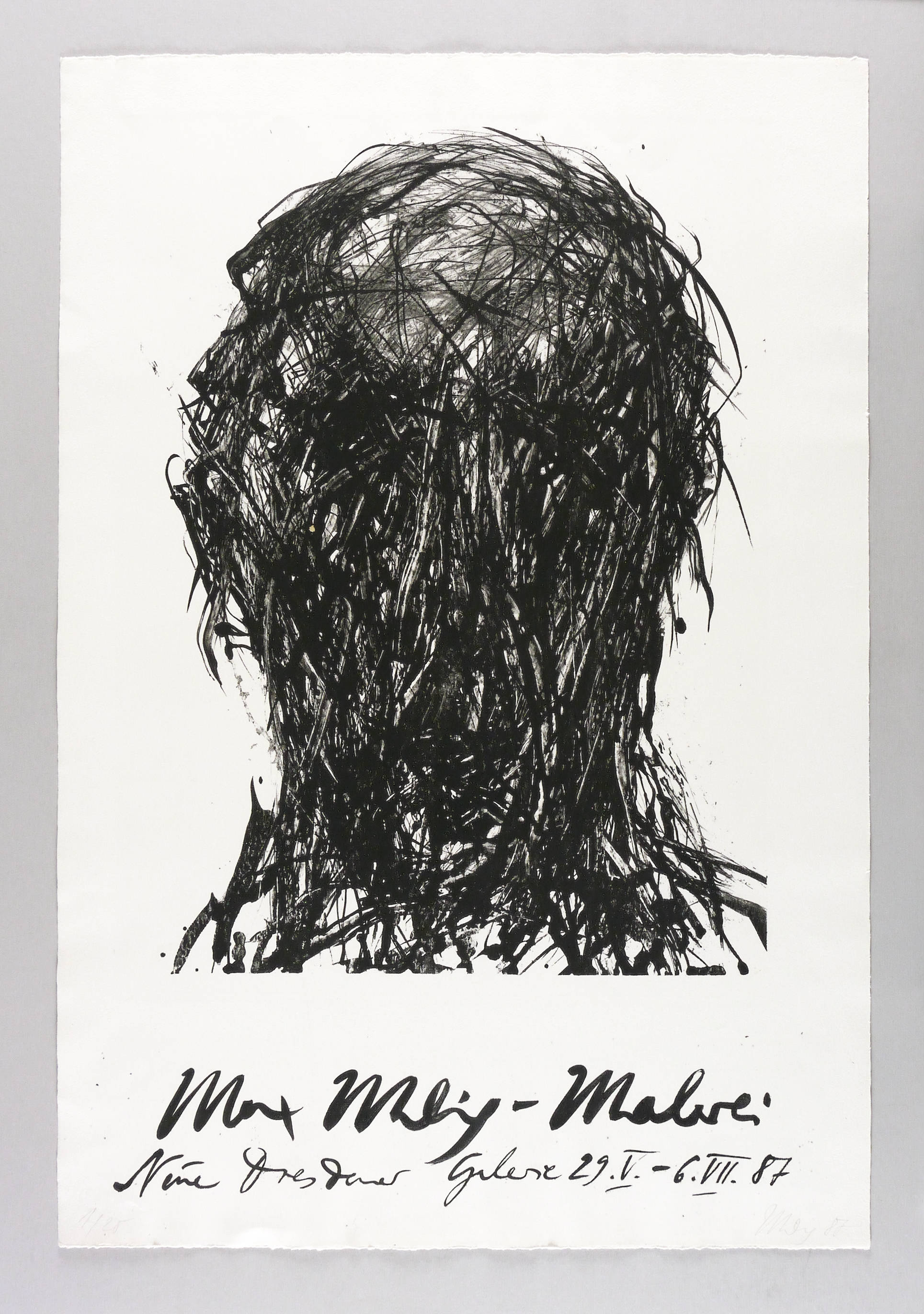 Rechts unten in Bleistift signiert und datiert: ″Uhlig 81″. Unterhalb der Inschrift Widmung für Hans-Joachim Müller. Im Stein unter der Darstellung Inschrift. – Originalgrafisches Plakat zur Ausstellung ″M.U. Malerei″ in der Neuen Dresdener Galerie 29.5.-6.7.1987. Unter Verwendung der Lithografie ″Frontaler Männerkopf″ von 1987 (WVZ Oesinghaus Nr. 258), die Uhlig im selben Jahr auch für ein Plakat der Galerie am Sachsenplatz in Leipzig nutzte (WVZ Oesinghaus Nr. 251, hier mit dem Titel ″Dunkler Kopf″). - Provenienz: Sammlung Dr. Ingrid und Prof. Dr. Albrecht Scholz, Dresden. – Leichte Lagerspuren. Guter Zustand.