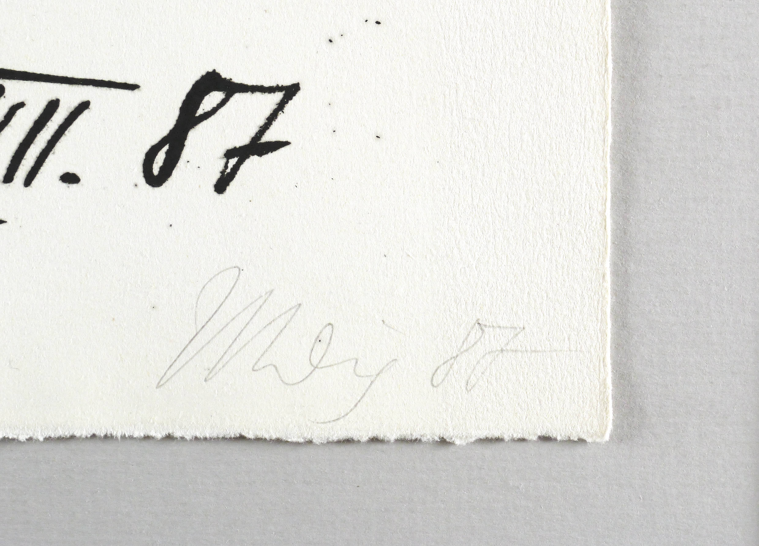 1987. Lithografie / Pinsellithografie, in Schwarz, auf hellchamois Velin. – Ausstellungsplakat, von Max Uhlig. – Auflage Exemplar Nr. 1/20. – 45,2 x 73,8 cm (Darstellung / mit Schrift), 57 x 80 cm (Blatt), 29,5 x 69,7 cm (Darstellung / ohne Schrift).