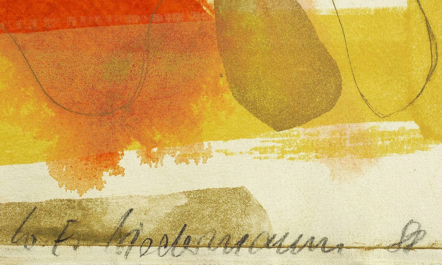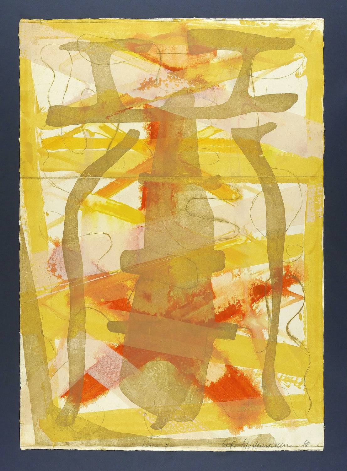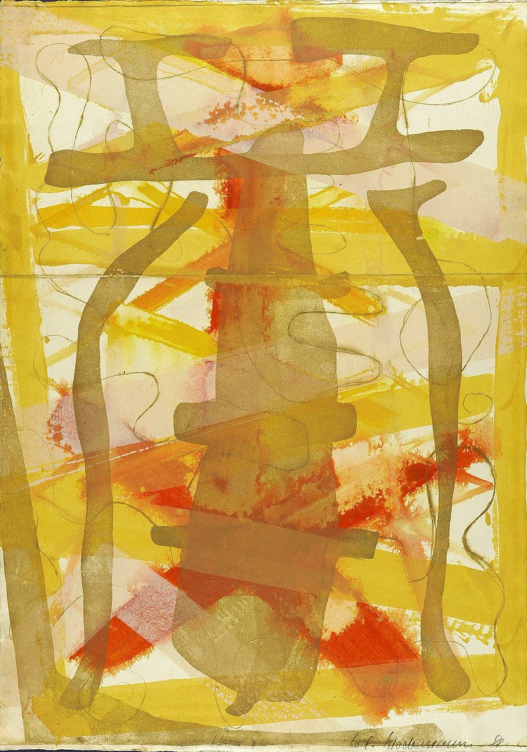 1988. Aquarell, über Materialdruck, auf Hahnemühle. – Originale Künstlergrafik, von Wolfgang E. Biedermann. – Unikat. – 79,0 x 55,5 cm (Darstellung / Blatt).