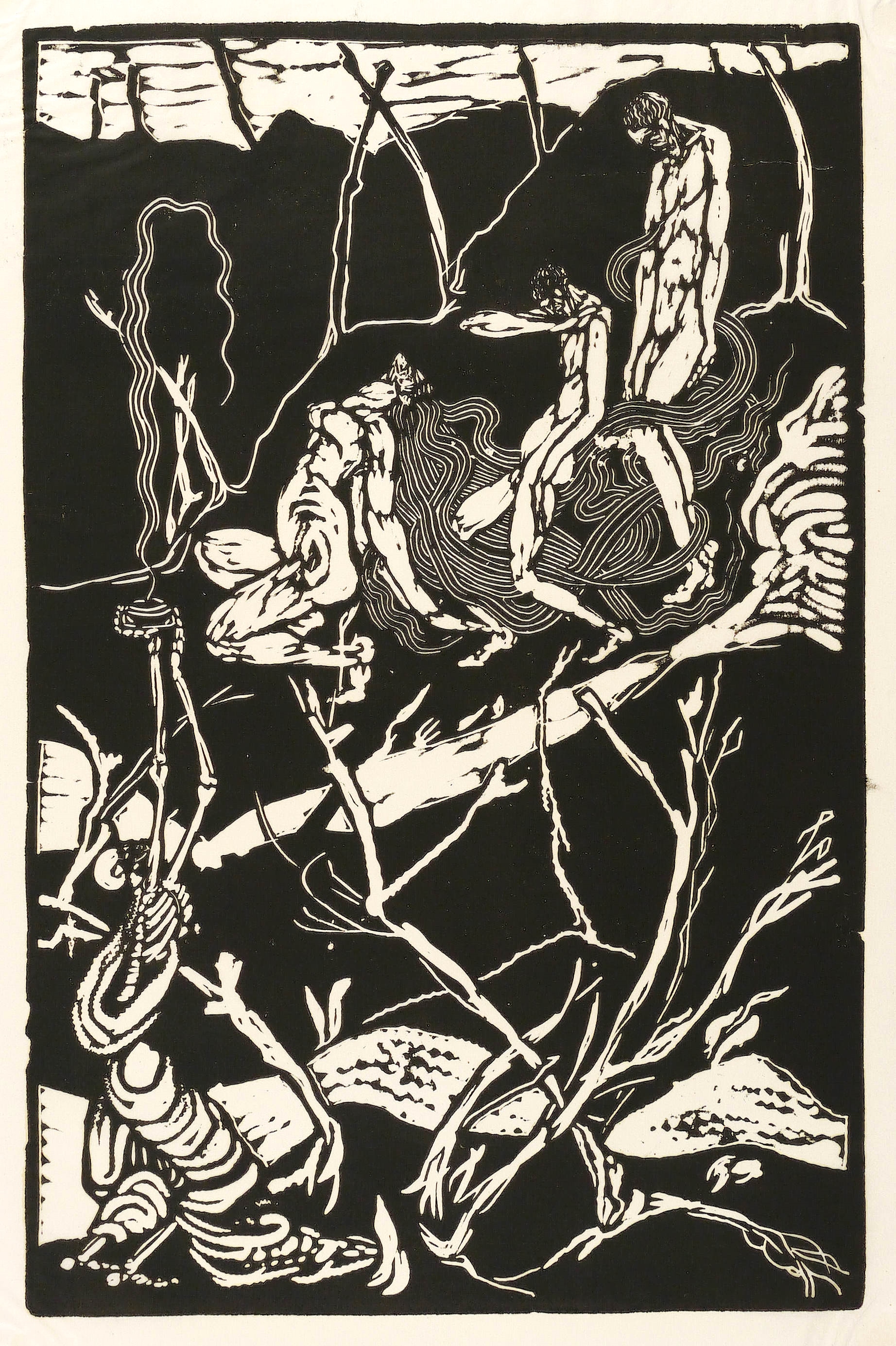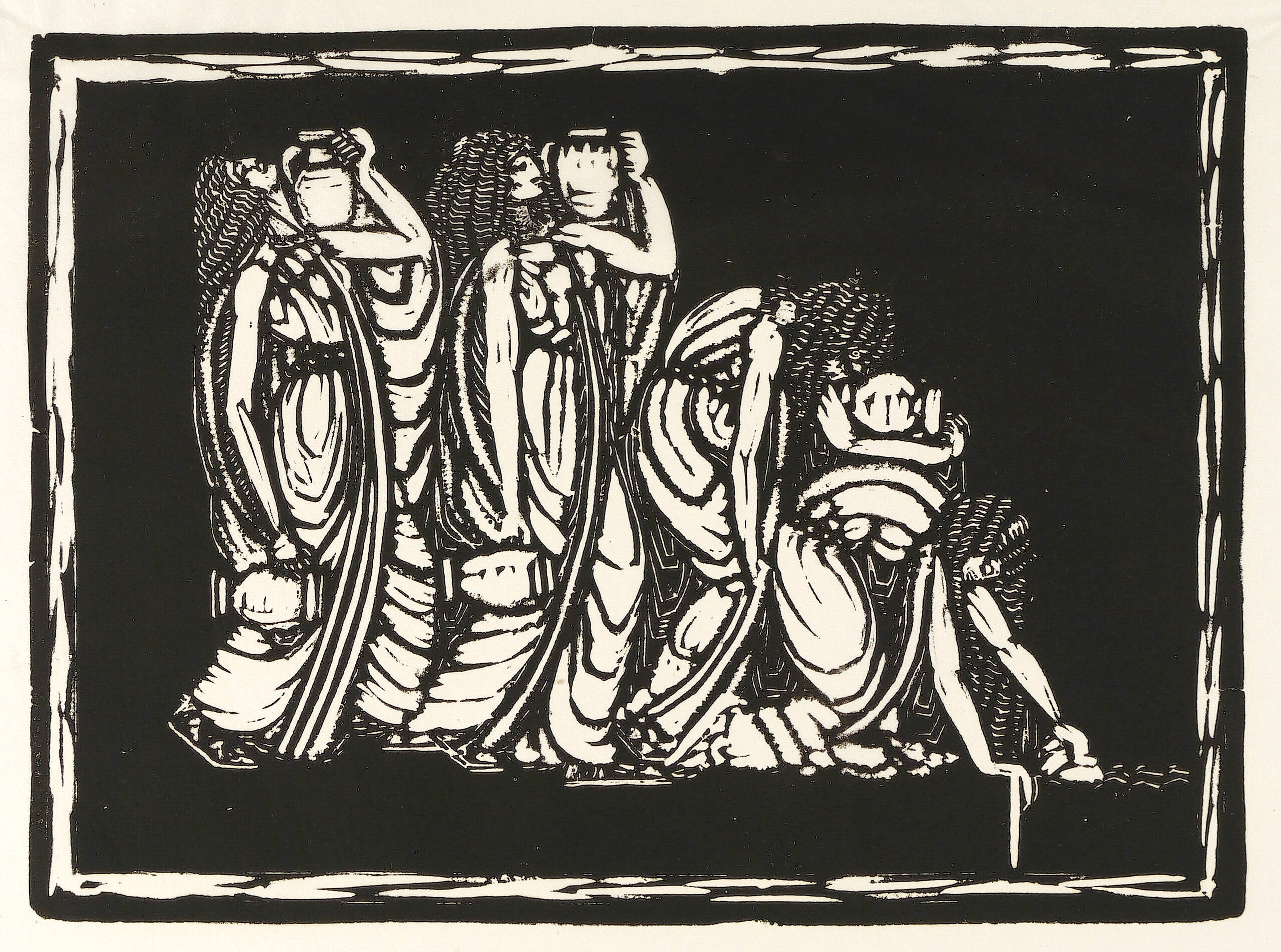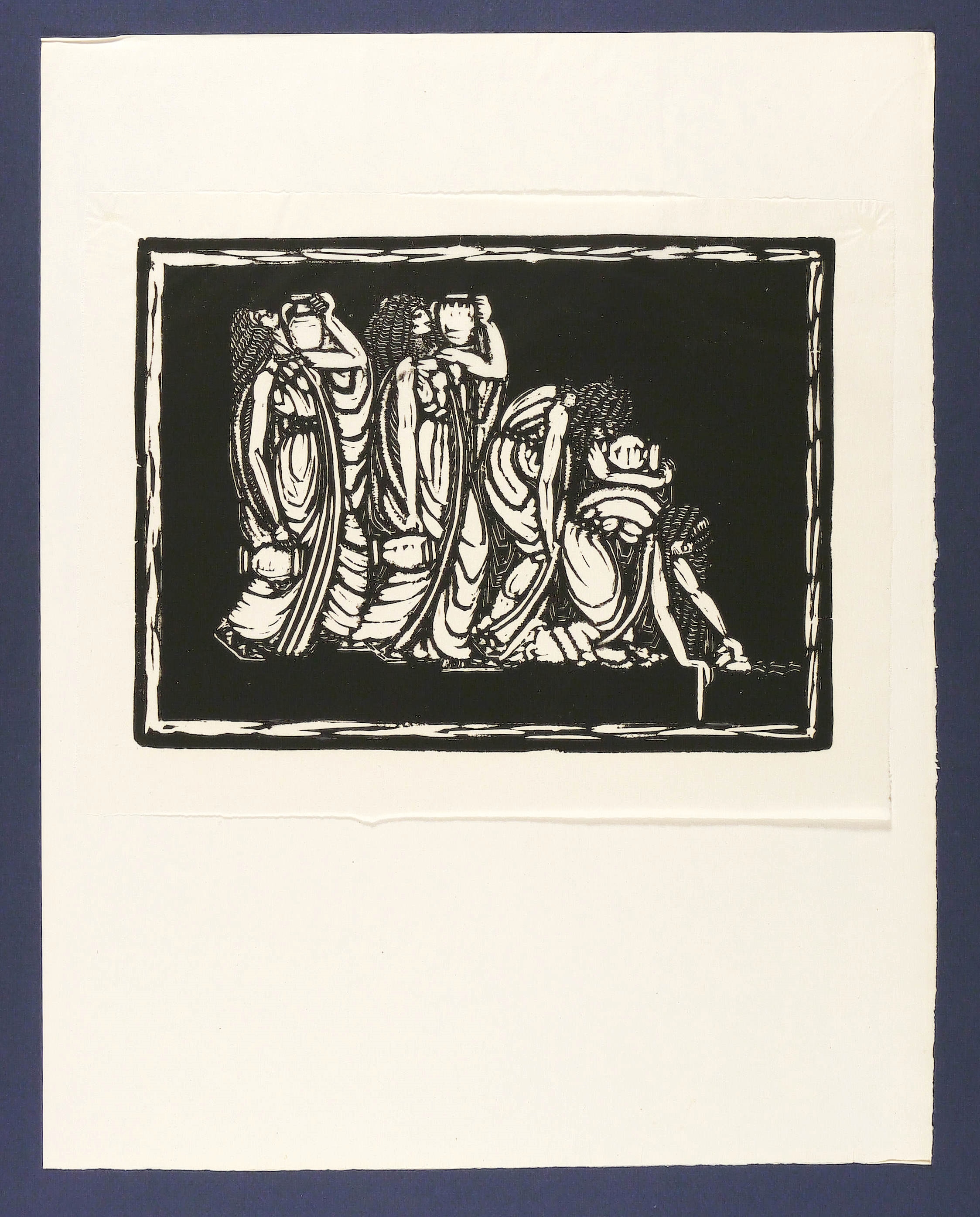 Aus: Heinrich Ehmsen - Linolschnitte. 3. Druck der Kabinettpresse (Berlin: Kabinettpresse 1965). – Im Impressum in blauer Feder von Lis Bertram-Ehmsen signiert. Dazu Auflagenbezeichnung. – Originalgrafische Mappe mit 7 posthumen Abdrucken von den originalen Platten: 1. Heilige Mädchen am Brunnen (1907/08). 2. Entwurf für ein Exlibris (1910). 3. Gefahr (1910). 4. Leben und Tod (1911). 5. Zerstörung (Krieg) (1913). 6. Ein Hoffen und Harren (1913). 7. Artisten der Großstadt (1913). – Mappe vollständig mit Titelblatt, Impressum und Umschlag erhalten. Die Japanpapiere oben auf Trägerkartons aufgesetzt. Umschlagdeckel etwas gedunkelt. Guter Zustand.