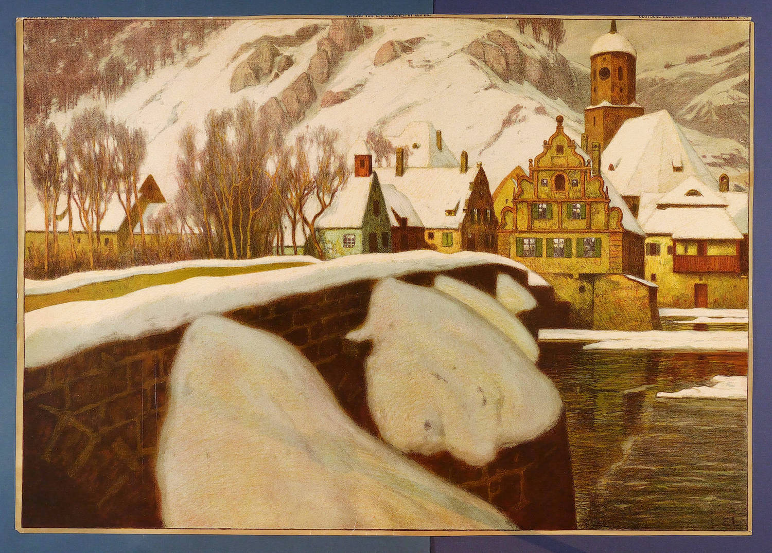(Leipzig: B.G. Teubner [1915]). – Im Stein rechts unten monogrammiert: ″EL″. Im oberen Rand angeschnitten typografische Bezeichnung mit Verlagsadresse. – Rand umlaufend leicht beschnitten. Der bisweilen etwas rissige Rand partiell hinterlegt. Ecken und Blattkanten etwas bestoßen. Insgesamt mäßig gut erhalten.