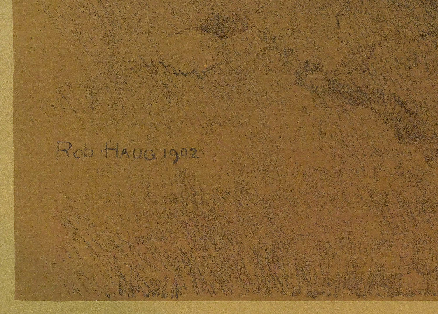 Aus: Künstlerischer Wandschmuck. Deutsche Künstler-Steinzeichnungen (Leipzig: R. Voigtländers Verlag [1900-1925]). – Nicht handsigniert. Im Stein links unten signiert und datiert: ″Rob. Haug 1902″. Unterhalb typografisch bezeichnet: ″ROBERT HAUG: MORGENROT″. Dazu Verlags- und Druckeradresse der Kunstdruckerei Künstlerbund Karlsruhe (KKK). – Originalrandiges unbeschnittenes Exemplar. Blattkanten stärker beansprucht, wenige kleine Risse rückseitig geklebt. Blattecken etwas bestoßen Insgesamt mäßig guter Zustand.