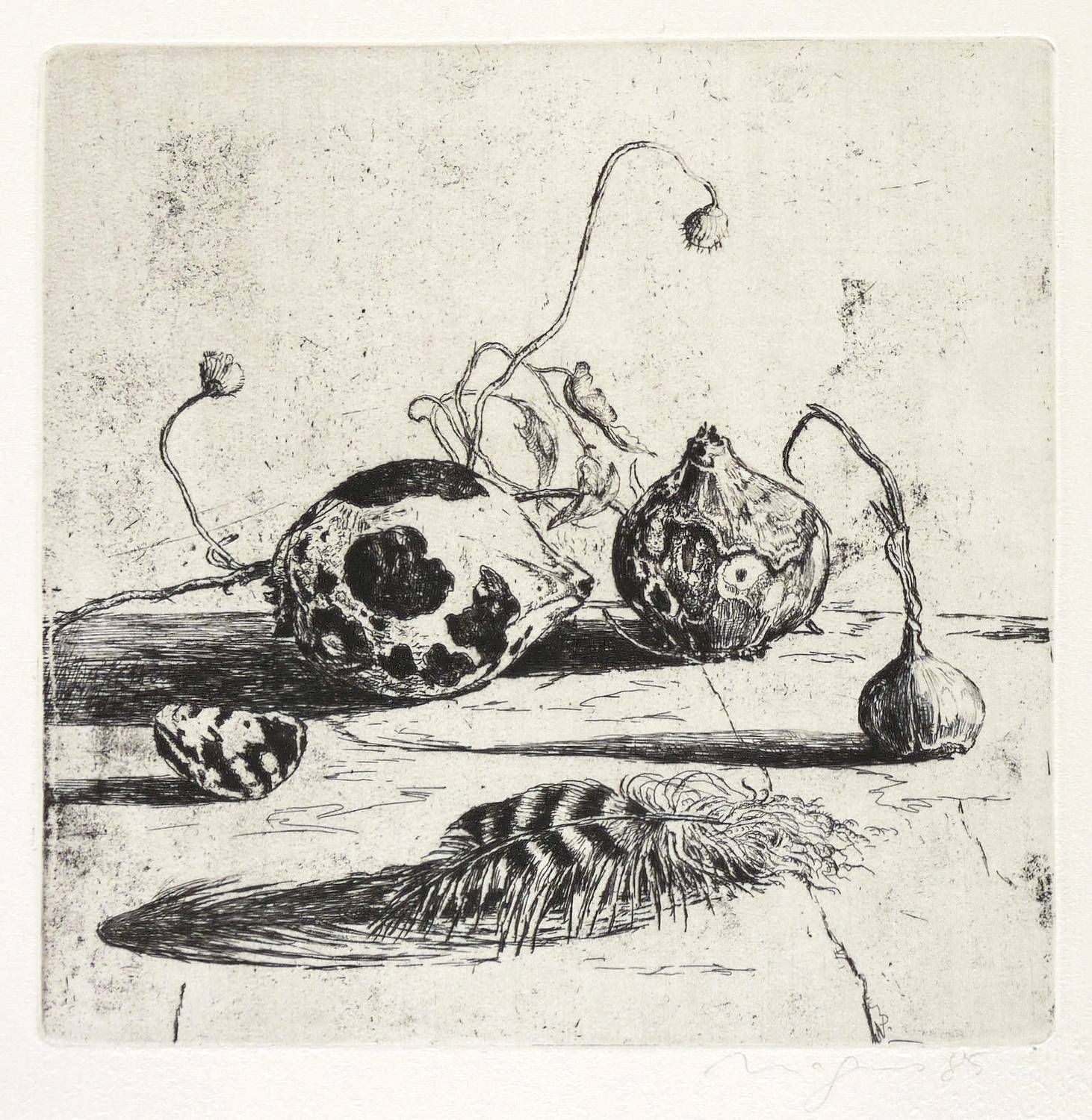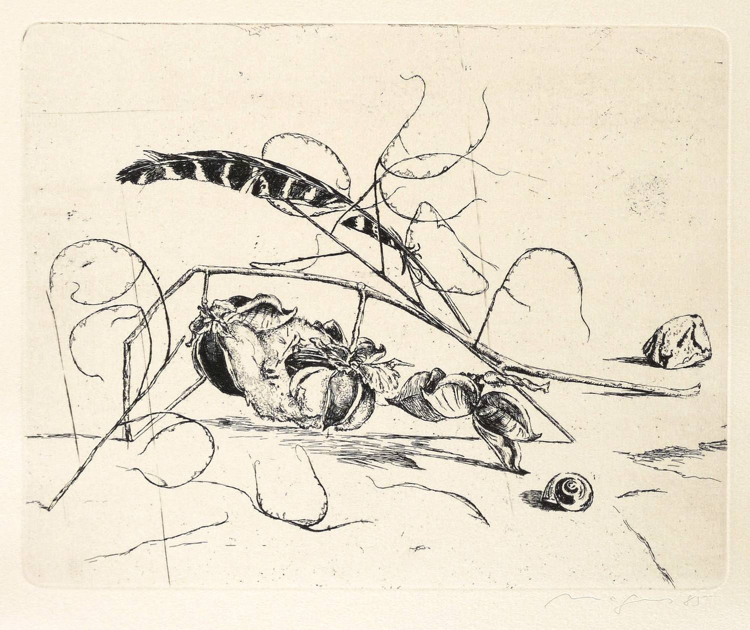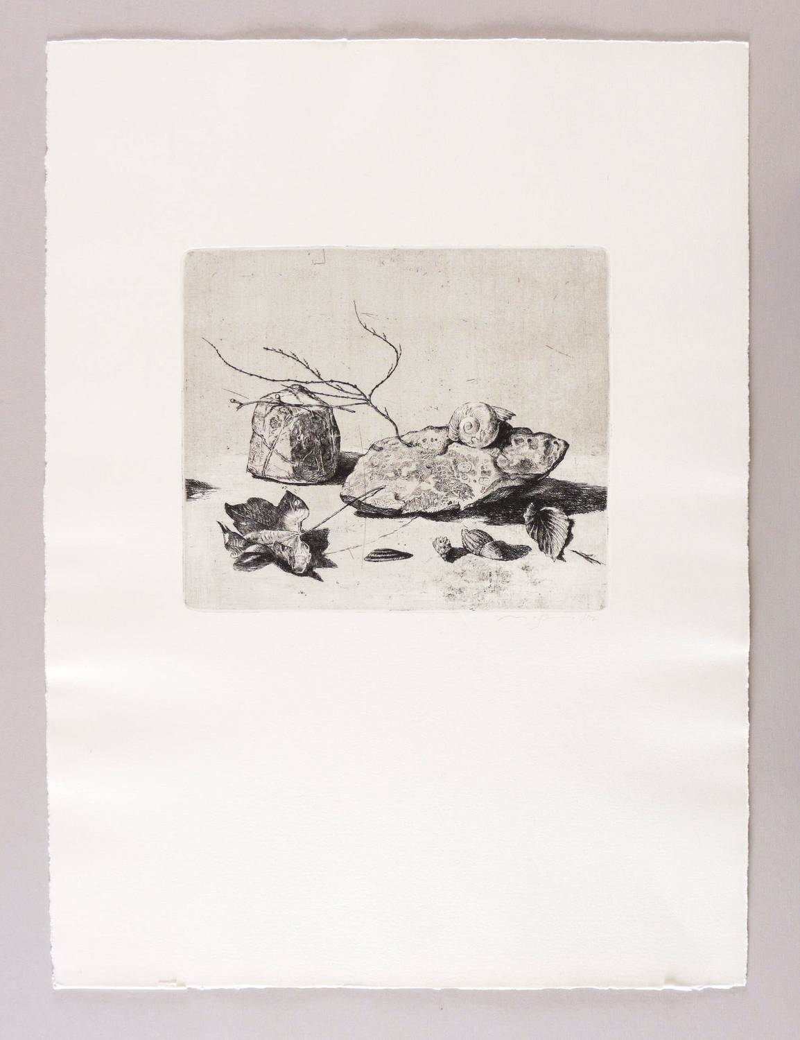 Aus: Klaus Magnus, Stillleben (Berlin: Berliner Graphikpresse 1987). – Jeweils rechts unten in Bleistift signiert und datiert: ″Magnus 87″. Impressum von Hand nummeriert. – Beinhaltend die 10 Radierungen, 1 Titelblatt, 1 Begleittext von Peter Röske sowie 1 Blatt Impressum. – Inklusive Mappe tadellos erhalten. Sehr guter Zustand.
