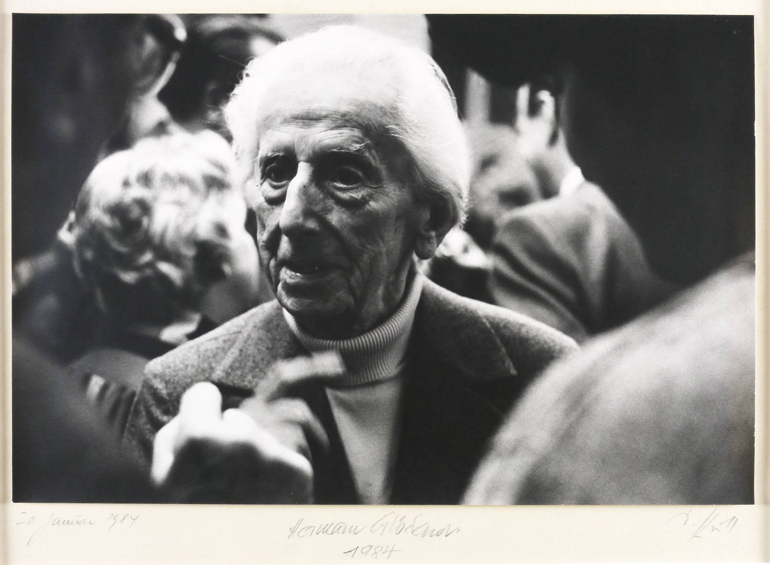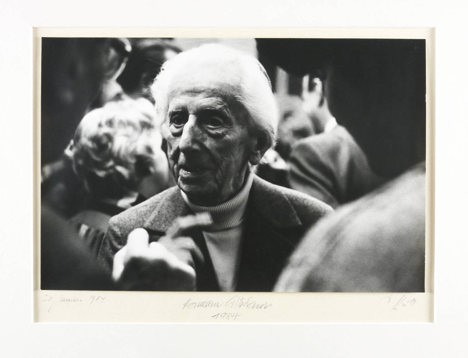 Auf dem Trägerkarton rechts unten in Bleistift signiert: ″D. Krull″. Links datiert: ″20. Januar 1984″. Mittig von Hermann Glöckner selbst signiert und datiert: ″Hermann Glöckner 1984″. – Aufnahme vom 20. Januar 1984 von der Eröffnungsfeier der Ausstellung zum 95. Geburtstag von Hermann Glöckner im Kupferstich-Kabinett der Staatlichen Kunstsammlungen Dresden, 21. Januar - 4. Mai 1984. – Ohne Mangel. Sehr guter Zustand. Original auf Trägerkarton gesetzt. Im Passepartout montiert.