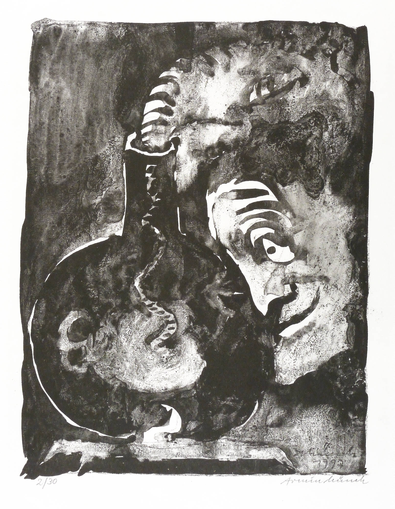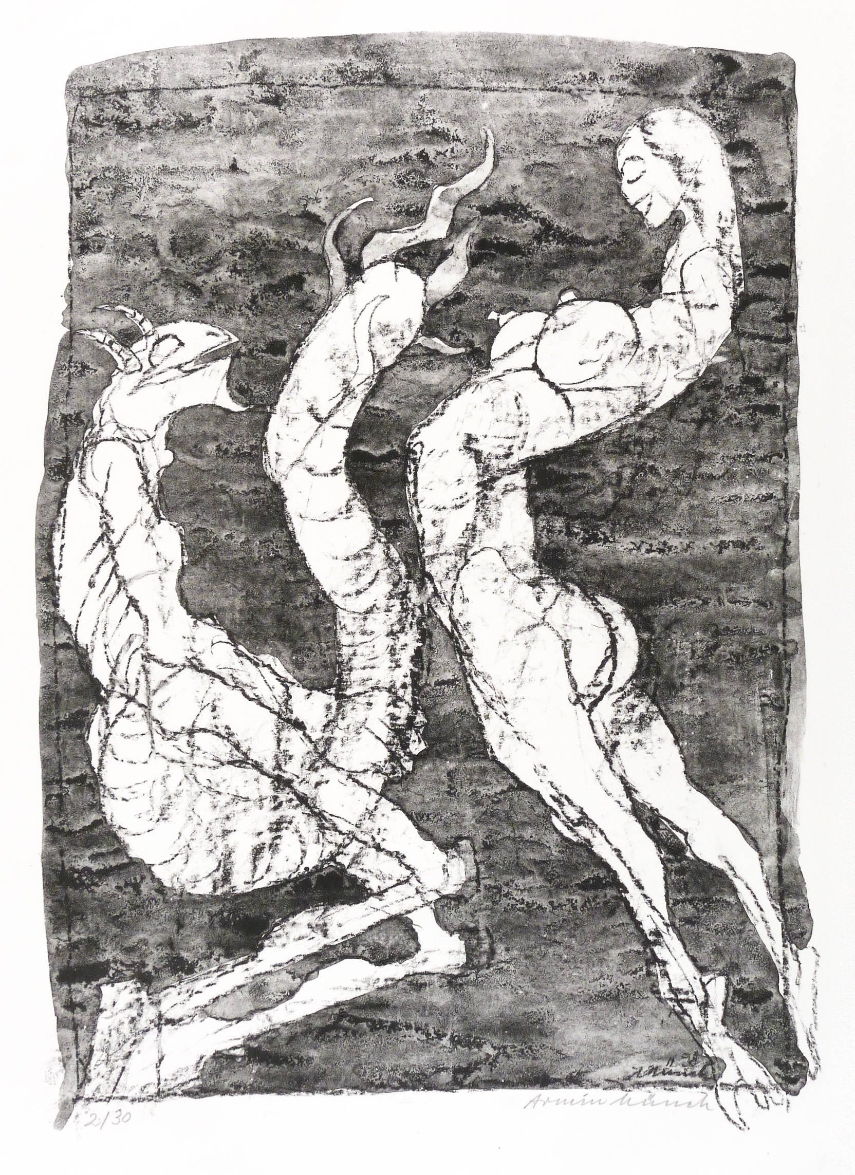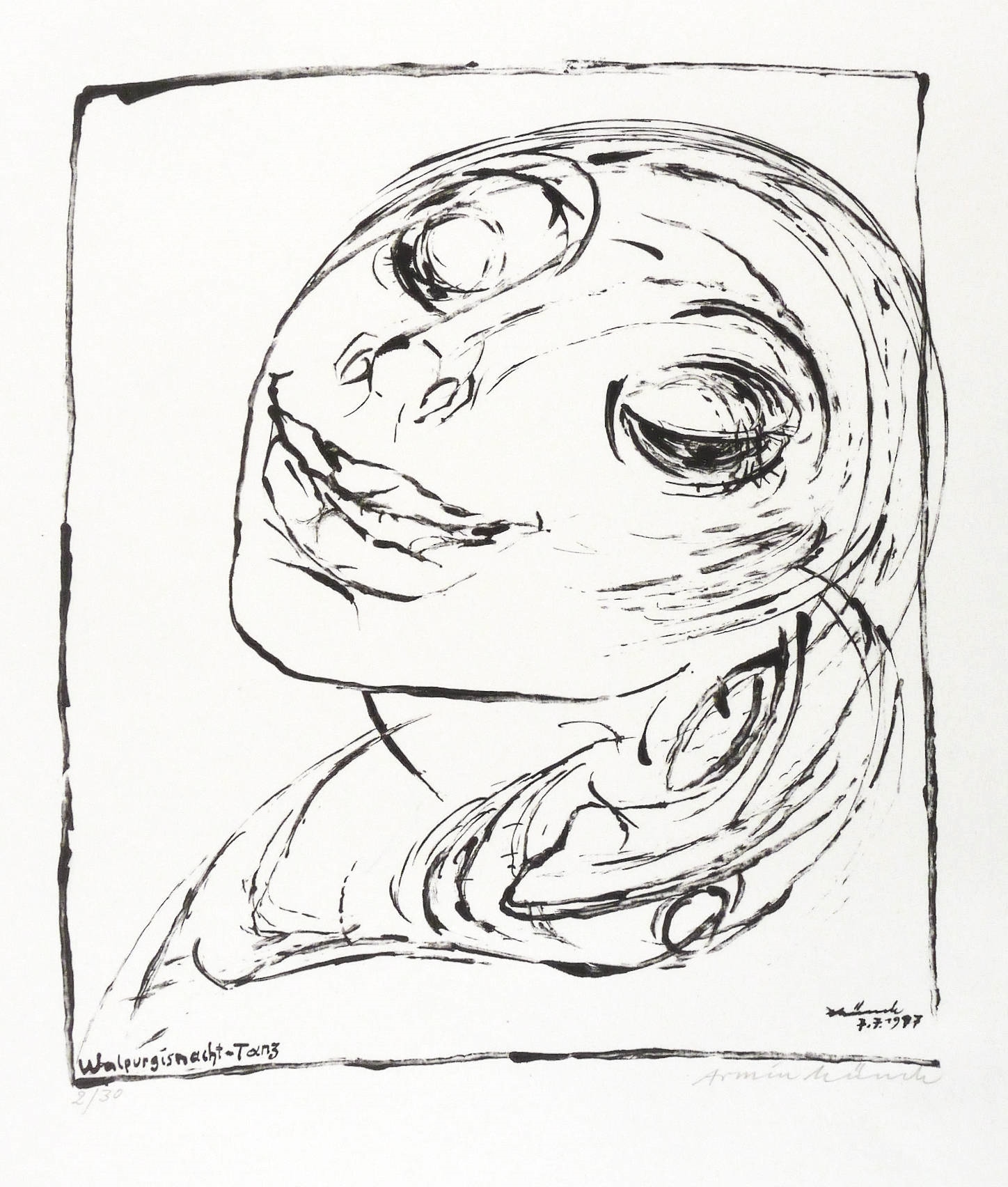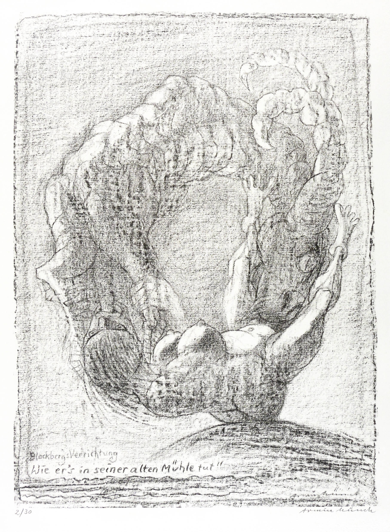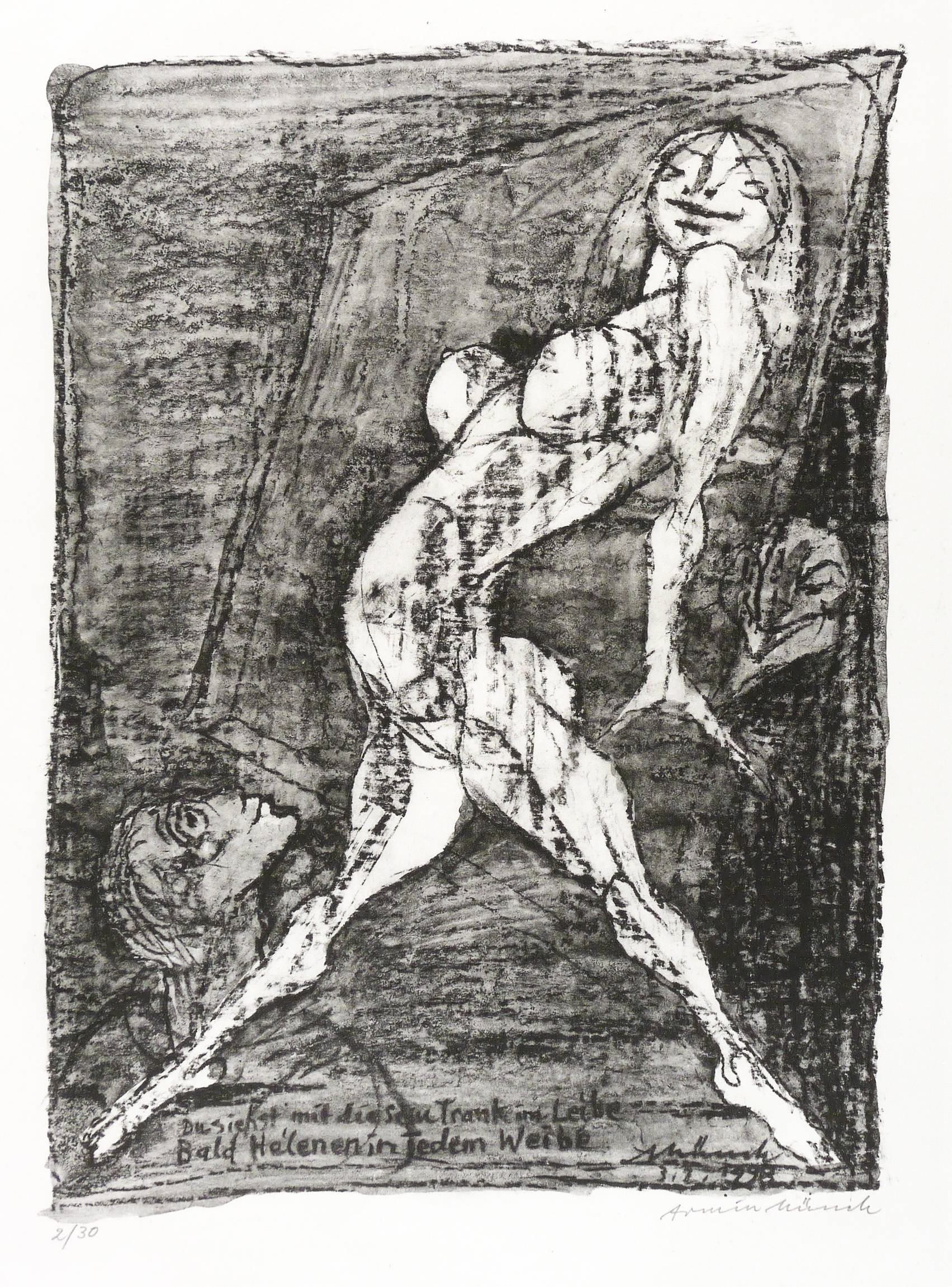 Aus: Armin Münch, Faustmephisto (Weimar: Galerie Profil 1999). – Sämtliche Blätter rechts unten in Bleistift signiert: ″AMünch″. Links jeweils Auflagenbezeichnung, in der Darstellung bisweilen Inschrift mit Signatur, Jahr und Blatttitel. – Originalgrafisches Mappenwerk mit 18 Lithografien + 1 Titel-Lithografie, gedruckt bei Arloth in Leipzig, mit einer Kassette der Buchbinderei Lüttich in Weimar, gestaltet von Helmut Hengst. Hergestellt wurden nur 20 Kassetten für die Exemplare 1-20 von 30. - Enthalten sind: 0. Der Pakt (Zusatz- Titel). - 1. Osterspaziergang. - 2. Das Böse, das Gute. - 3. Auerbachs Keller; Faßritt. - 4. Faust trinkt sich jung. - 5. Du siehst... - 6. Am Golde hängt... - 7. Liebespaar. - 8. Wie er's in seiner alten Mühle tut. - 9. Walpurgisnacht-Tanz. - 10. Die Mutter platzt. - 11. Kultischer Tanz. - 12. Der Apfelbaum. - 13. Von Feuer gehen wir zu Feuer. - 14. Die Maus. - 15. Homunculus. - 16. Teufelskuppe. - 17. Die innere Schlacht. - 18. Engel Faust Teufel. – Vollständig mit Leinen-Kassette, Titelblatt, Inhaltsverzeichnis, Impressum und allen Lithografien. In hervorragendem originalem Zustand.