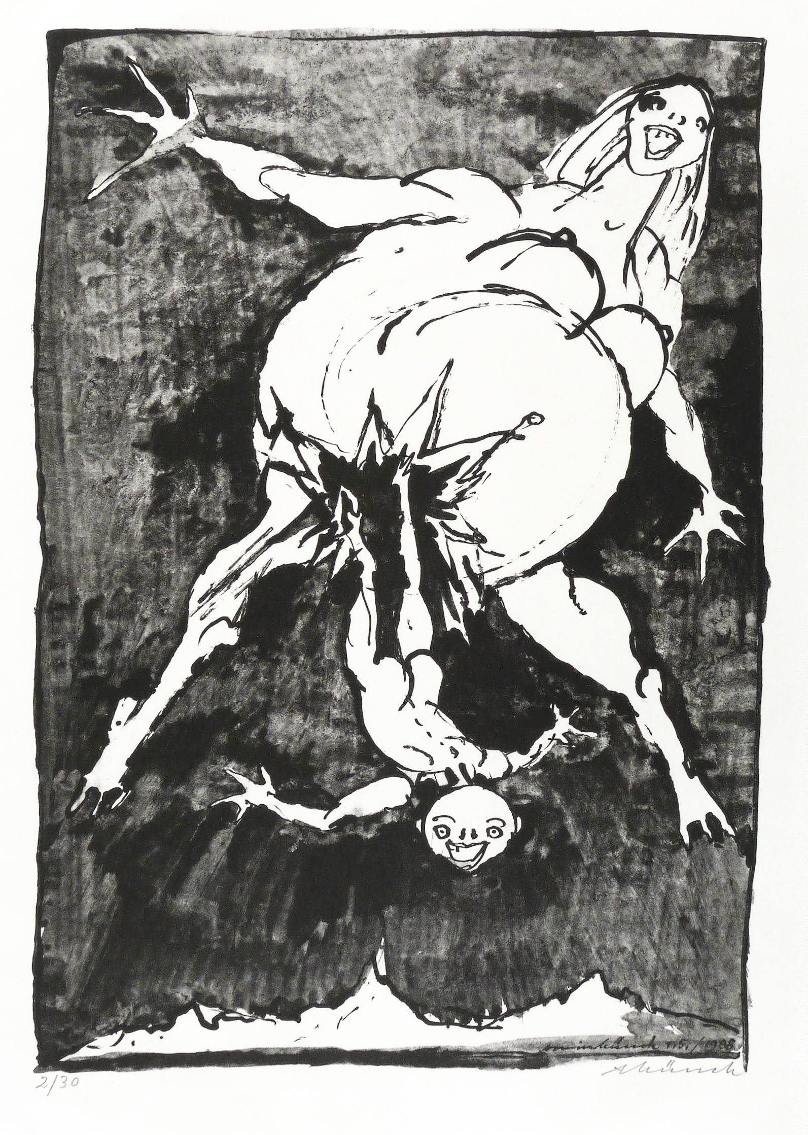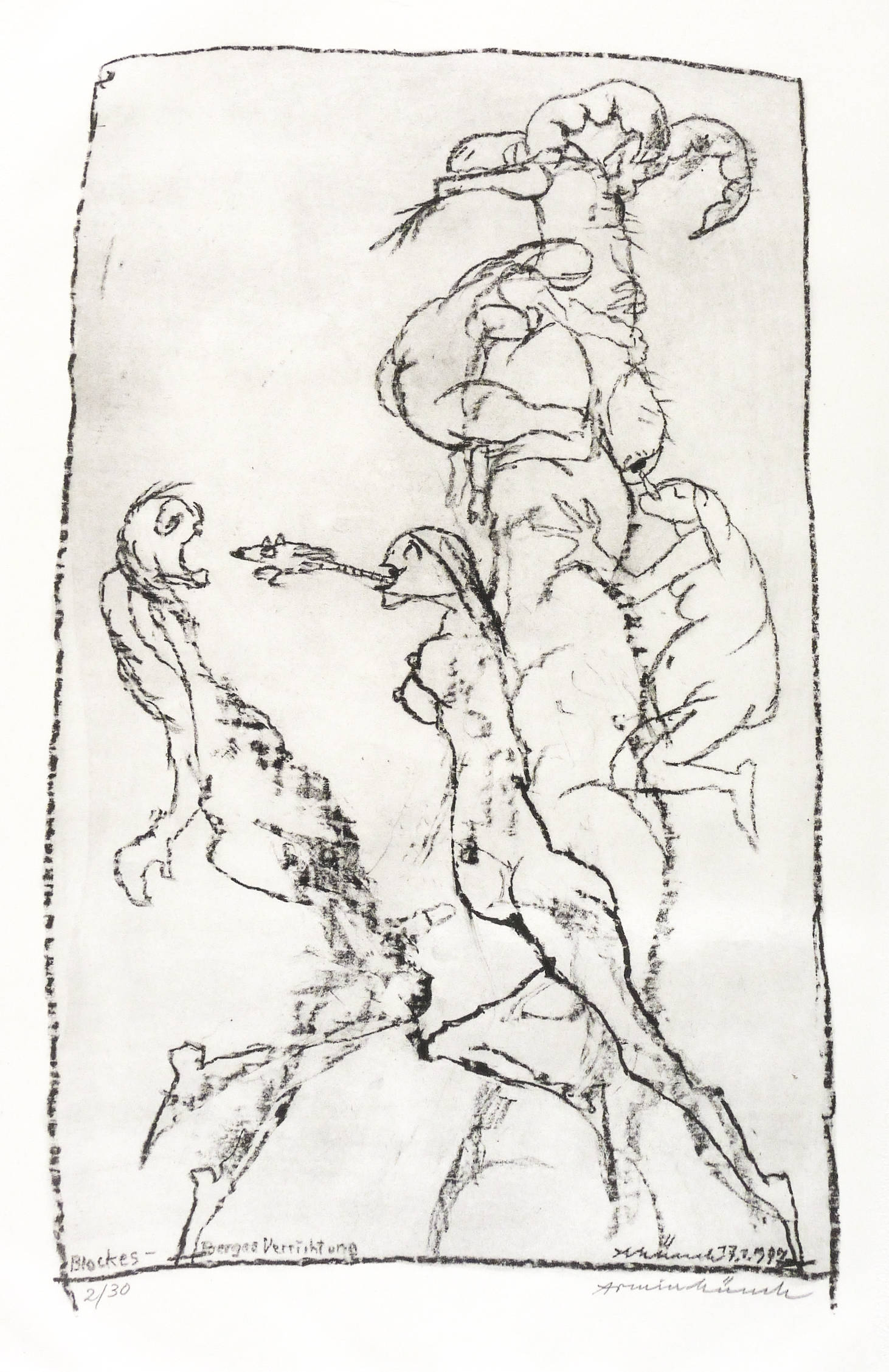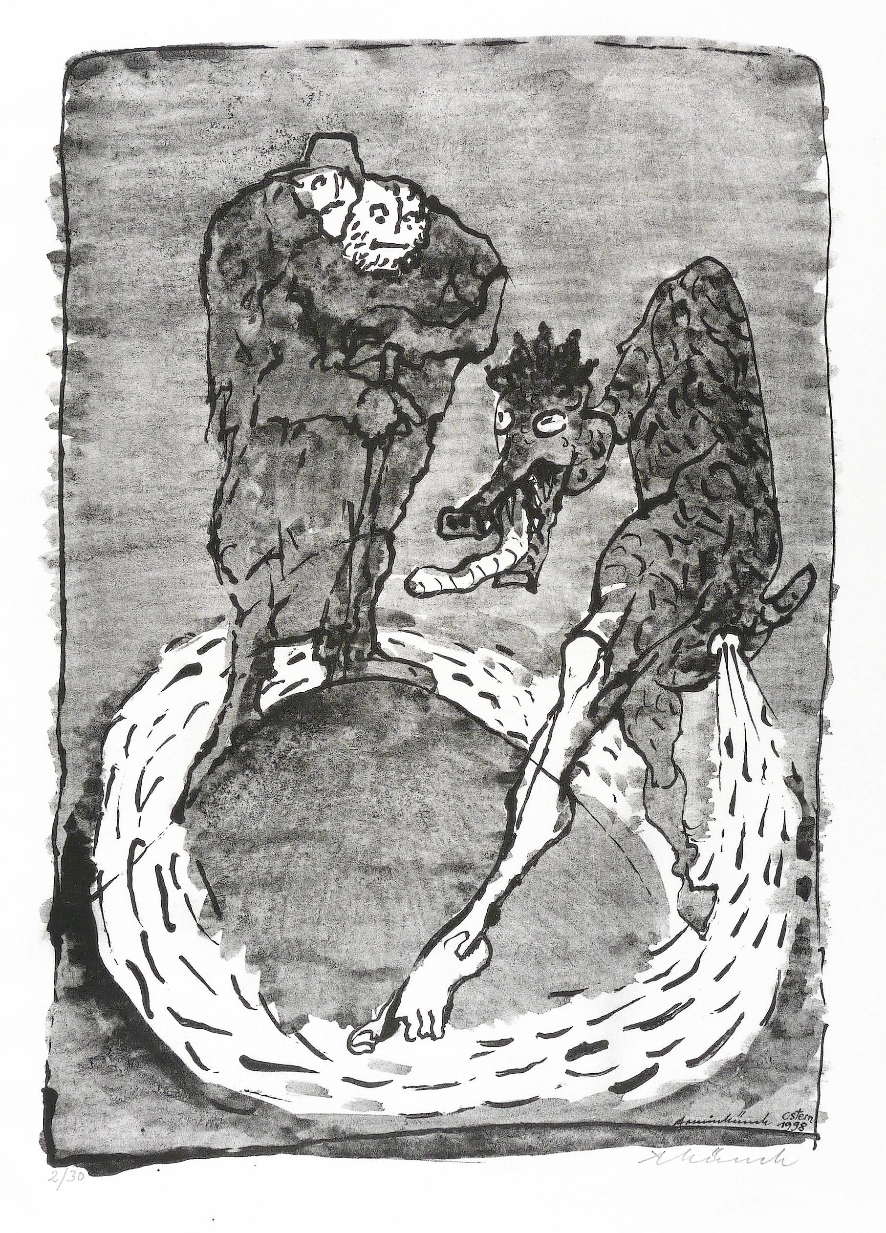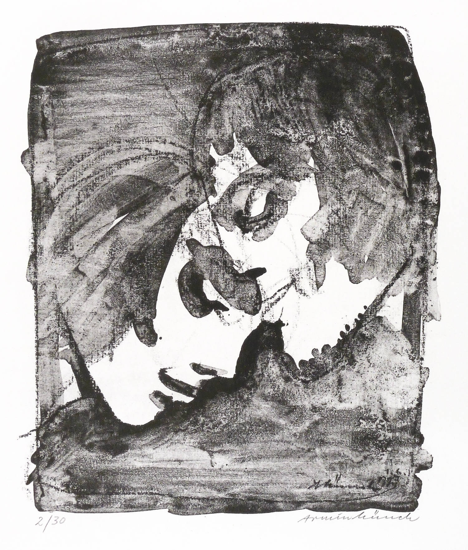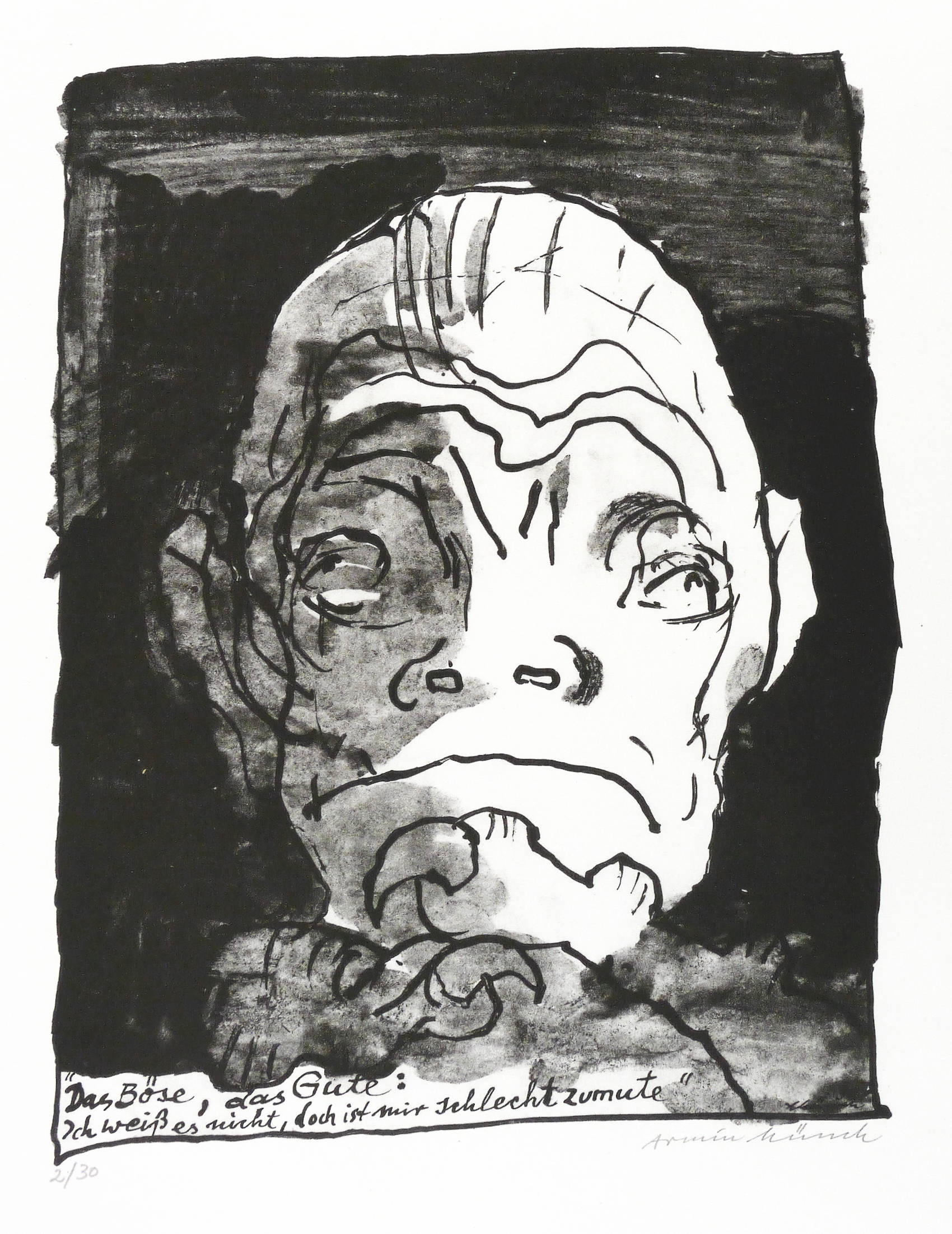 Aus: Armin Münch, Faustmephisto (Weimar: Galerie Profil 1999). – Sämtliche Blätter rechts unten in Bleistift signiert: ″AMünch″. Links jeweils Auflagenbezeichnung, in der Darstellung bisweilen Inschrift mit Signatur, Jahr und Blatttitel. – Originalgrafisches Mappenwerk mit 18 Lithografien + 1 Titel-Lithografie, gedruckt bei Arloth in Leipzig, mit einer Kassette der Buchbinderei Lüttich in Weimar, gestaltet von Helmut Hengst. Hergestellt wurden nur 20 Kassetten für die Exemplare 1-20 von 30. - Enthalten sind: 0. Der Pakt (Zusatz- Titel). - 1. Osterspaziergang. - 2. Das Böse, das Gute. - 3. Auerbachs Keller; Faßritt. - 4. Faust trinkt sich jung. - 5. Du siehst... - 6. Am Golde hängt... - 7. Liebespaar. - 8. Wie er's in seiner alten Mühle tut. - 9. Walpurgisnacht-Tanz. - 10. Die Mutter platzt. - 11. Kultischer Tanz. - 12. Der Apfelbaum. - 13. Von Feuer gehen wir zu Feuer. - 14. Die Maus. - 15. Homunculus. - 16. Teufelskuppe. - 17. Die innere Schlacht. - 18. Engel Faust Teufel. – Vollständig mit Leinen-Kassette, Titelblatt, Inhaltsverzeichnis, Impressum und allen Lithografien. In hervorragendem originalem Zustand.