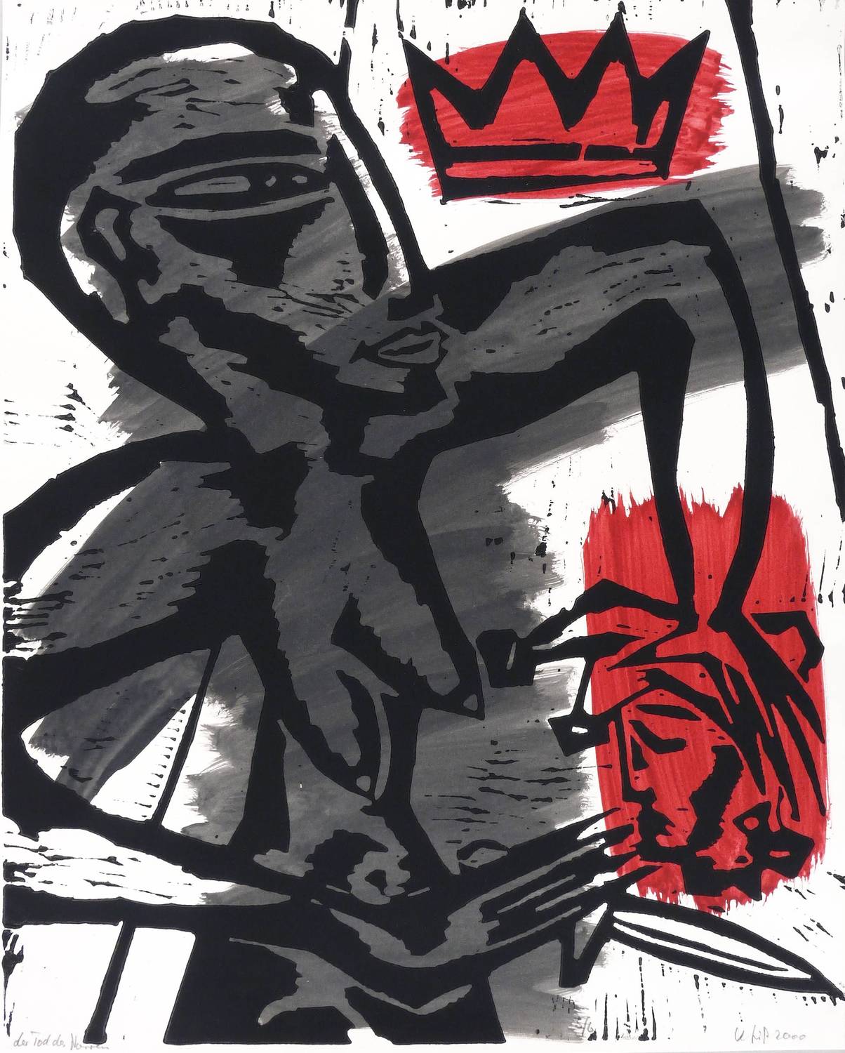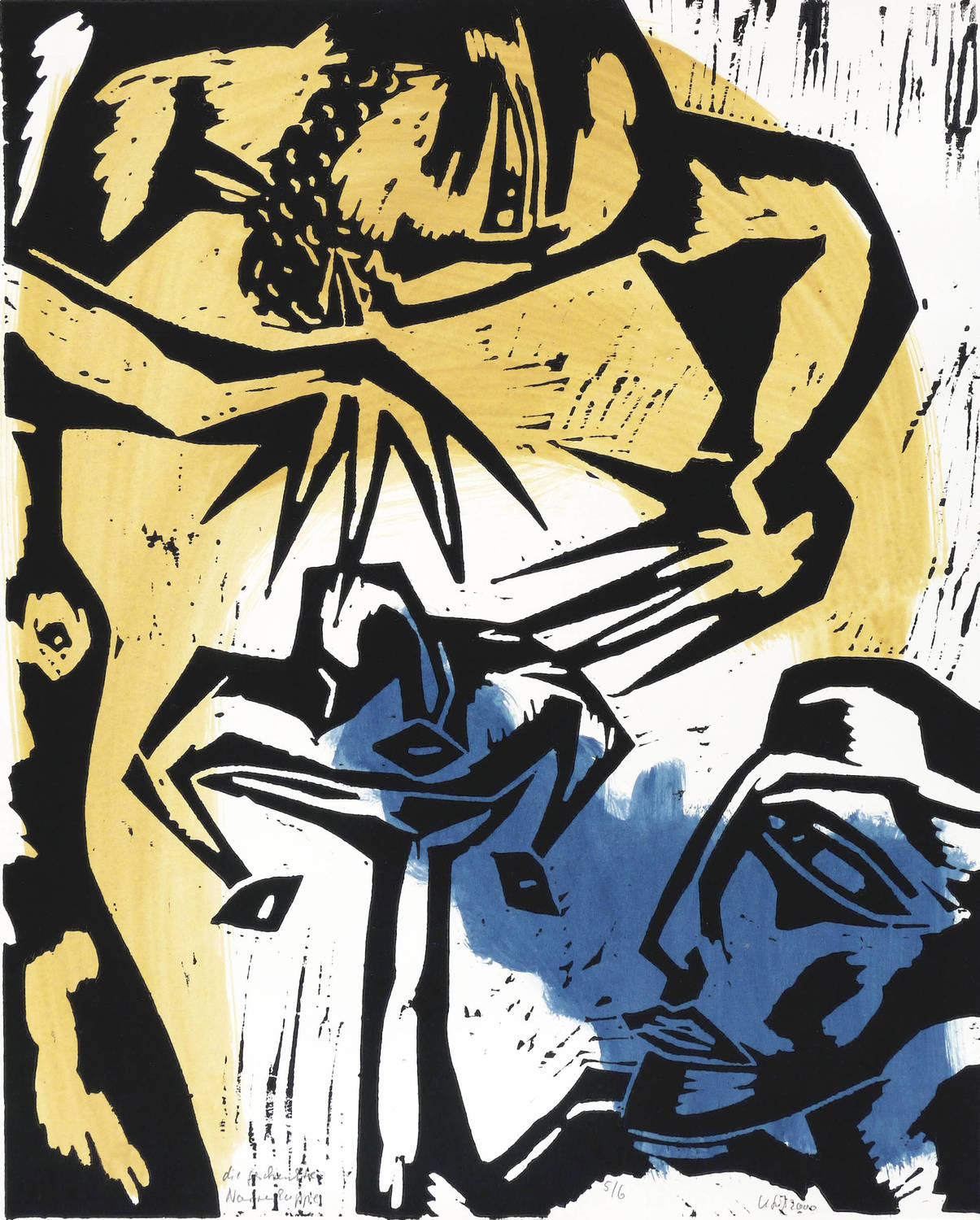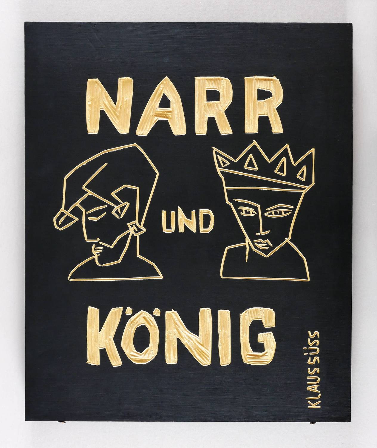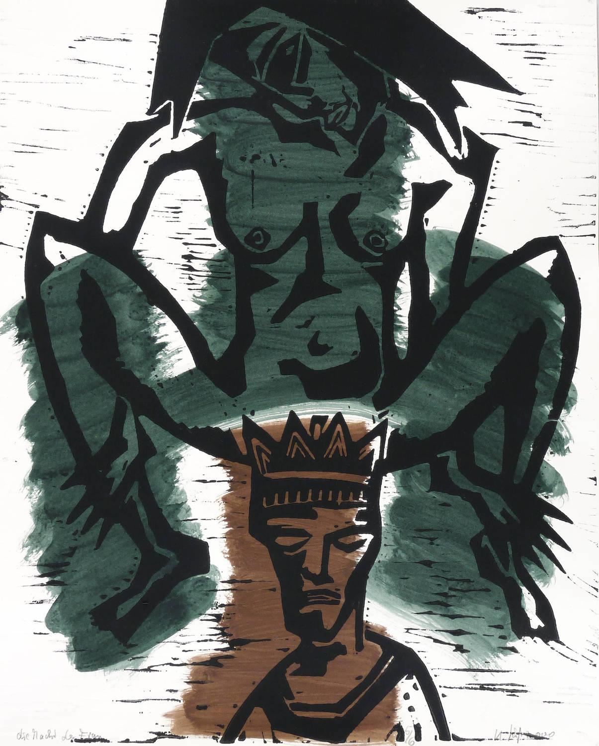 Aus: Klaus Süß, Narr und König (Chemnitz: Eigenverlag 2000). – Alle Blätter in Bleistift signiert, datiert, betitelt und mit Auflagenbezeichnung. Im Innendeckel der Kassette mit Silberstift bezeichnet: ″NARR UND KÖNIG // 7 UNTERMALTE HOLZSCHNITTE / AUFLAGE: 6 / EIGENEDITION SÜSS″. Dazu nochmals Signatur, Jahr und Auflagenbezeichnung. – Originalgrafisches Mappenwerk mit 7 Holzschnitten auf handkoloriertem Grund. Mit der jeweils variierten Untermalung haben die Grafiken unikaten Charakter. Eine Besonderheit für künstlerische Mappenwerke stellt die schwarz gefasste Holzkassette mit geschnittenem Deckel dar. - Enthalten die Motive: 1. Narrenliebe. - 2. Die Narrheit des Mannes. - 3. Damespiel. - 4. Der Tod des Narren. - 5. Die Macht der Frau. - 6. Der Stuhl der Königin. - 7. Die geschenkte Narrenkappe. – Vollständig mit sämtlichen Grafiken, der Kassette mit Metallschließen und dem zugehörigen Leinensack. Insgesamt sehr guter Zustand.