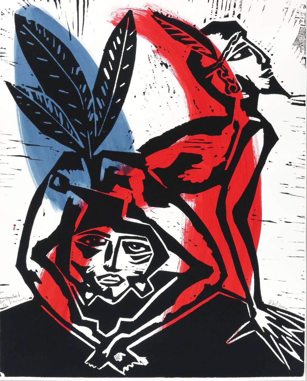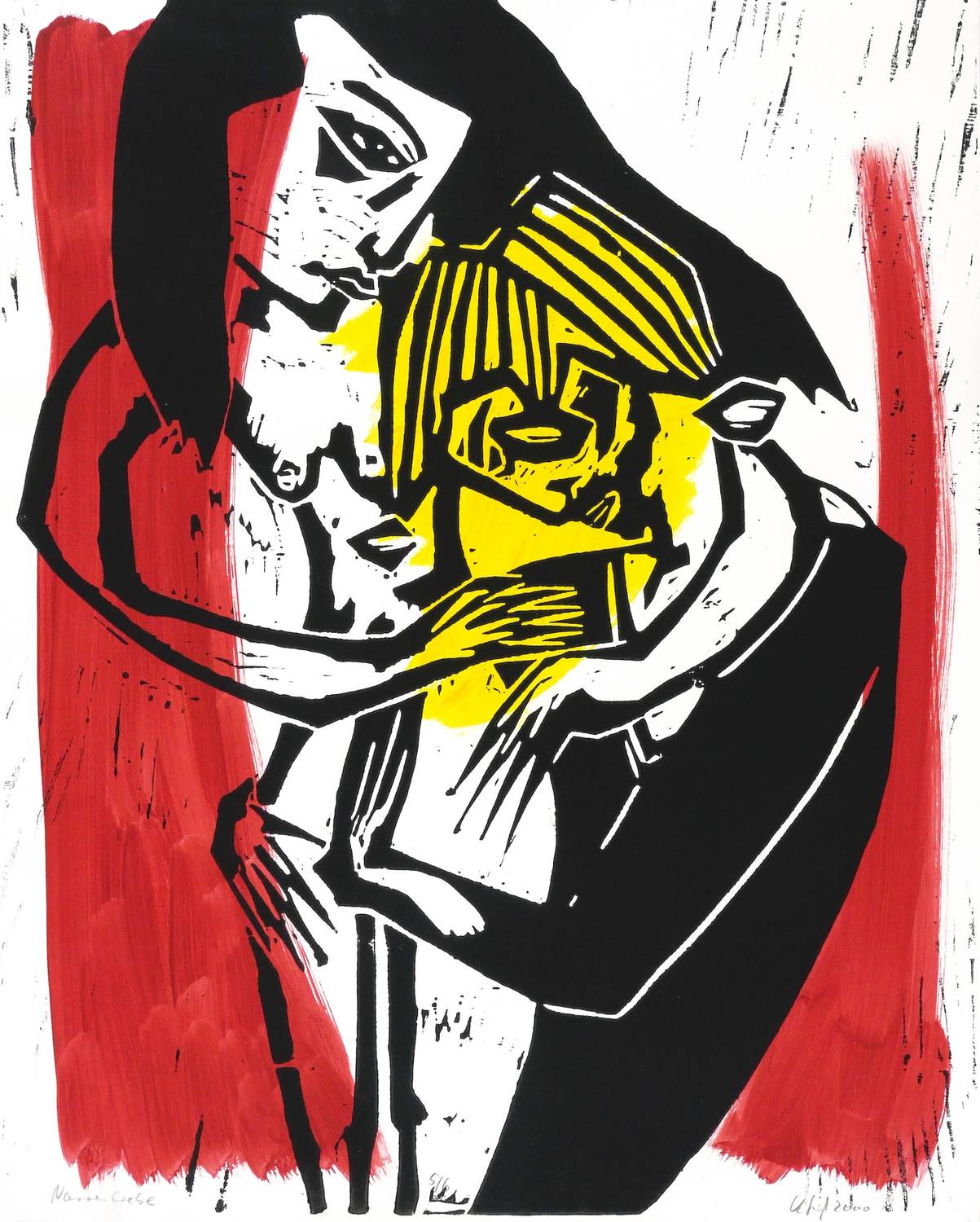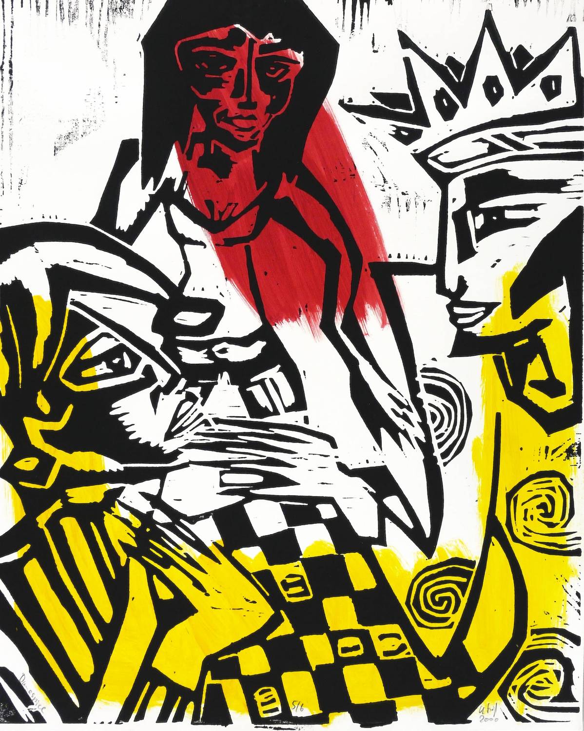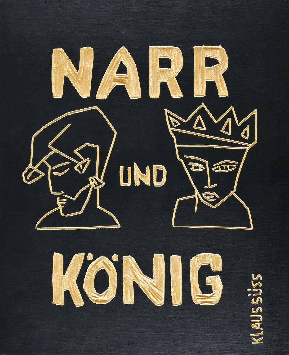 Aus: Klaus Süß, Narr und König (Chemnitz: Eigenverlag 2000). – Alle Blätter in Bleistift signiert, datiert, betitelt und mit Auflagenbezeichnung. Im Innendeckel der Kassette mit Silberstift bezeichnet: ″NARR UND KÖNIG // 7 UNTERMALTE HOLZSCHNITTE / AUFLAGE: 6 / EIGENEDITION SÜSS″. Dazu nochmals Signatur, Jahr und Auflagenbezeichnung. – Originalgrafisches Mappenwerk mit 7 Holzschnitten auf handkoloriertem Grund. Mit der jeweils variierten Untermalung haben die Grafiken unikaten Charakter. Eine Besonderheit für künstlerische Mappenwerke stellt die schwarz gefasste Holzkassette mit geschnittenem Deckel dar. - Enthalten die Motive: 1. Narrenliebe. - 2. Die Narrheit des Mannes. - 3. Damespiel. - 4. Der Tod des Narren. - 5. Die Macht der Frau. - 6. Der Stuhl der Königin. - 7. Die geschenkte Narrenkappe. – Vollständig mit sämtlichen Grafiken, der Kassette mit Metallschließen und dem zugehörigen Leinensack. Insgesamt sehr guter Zustand.