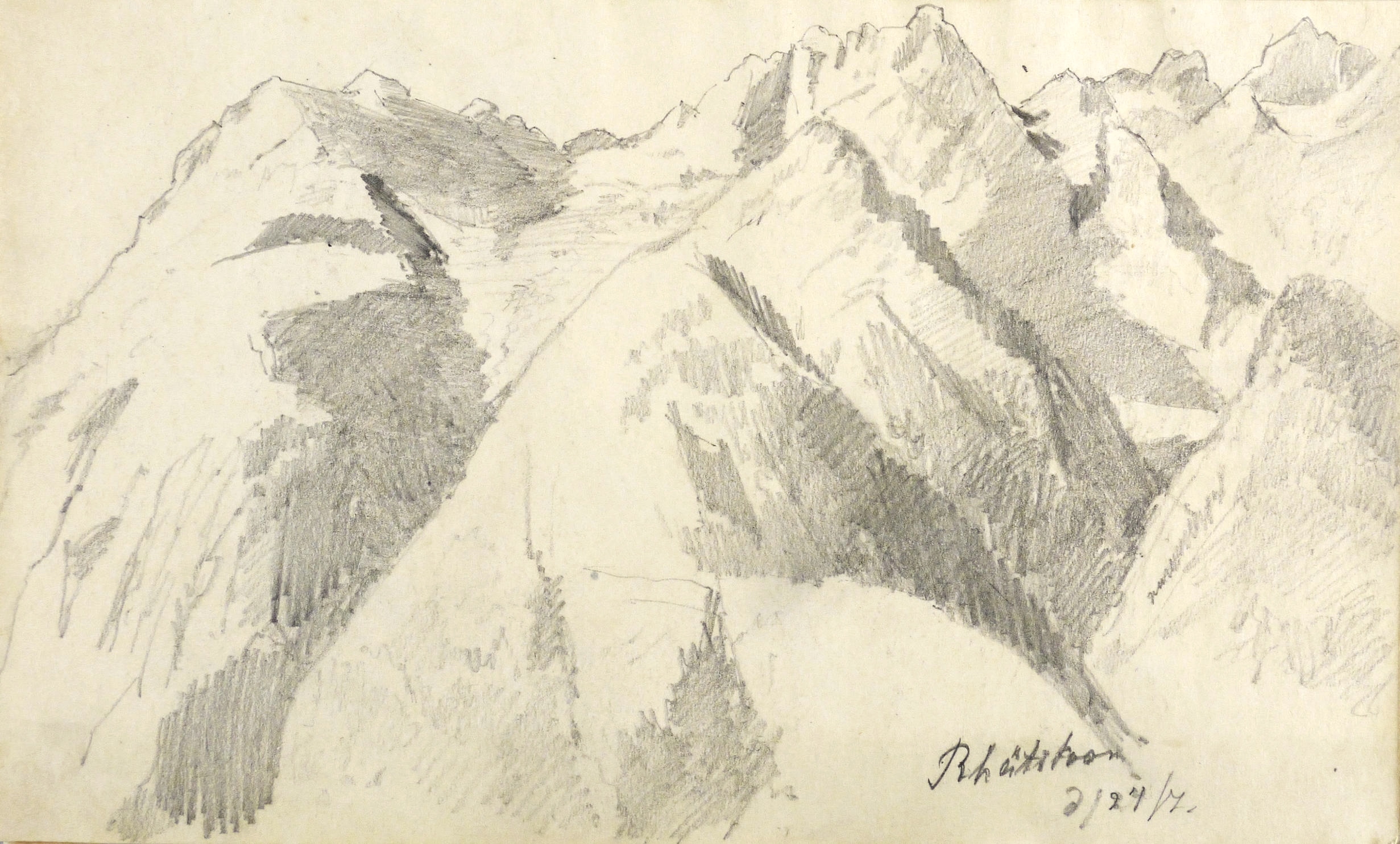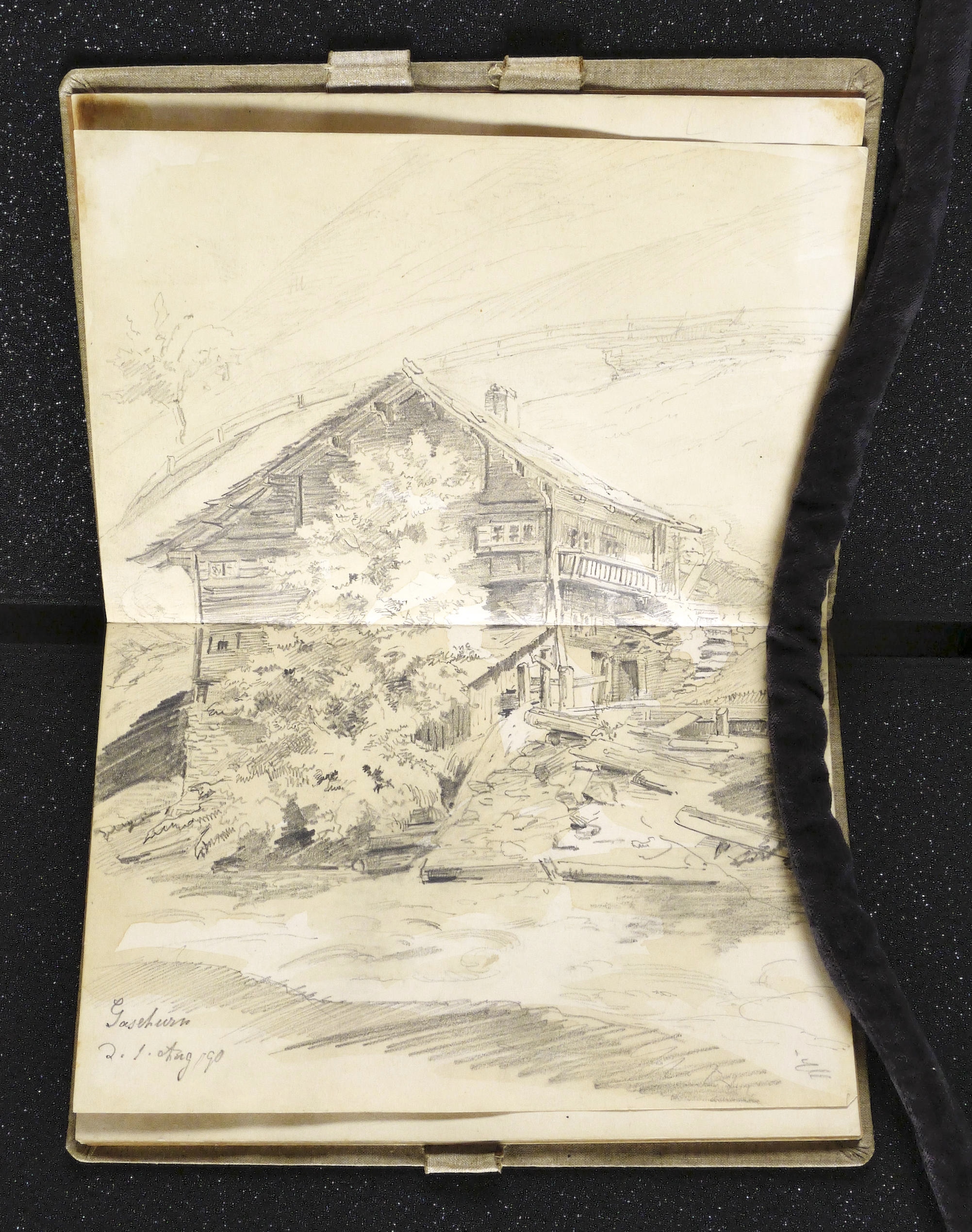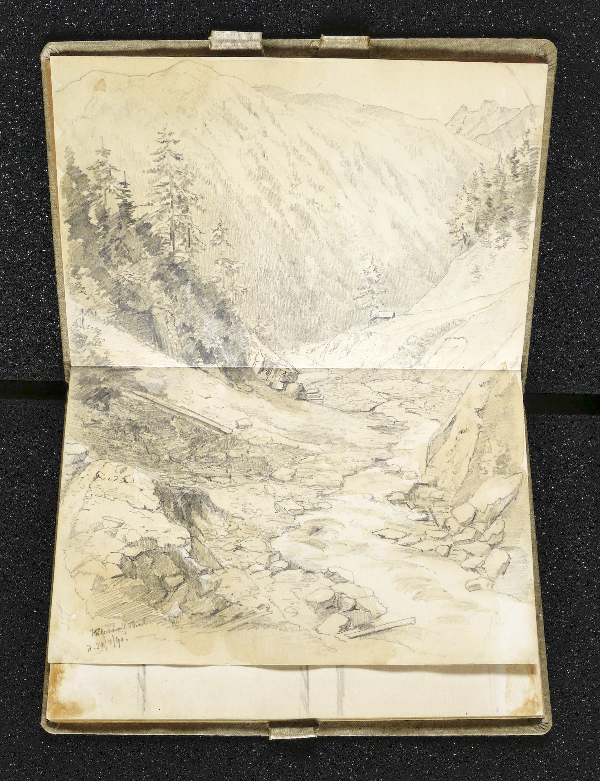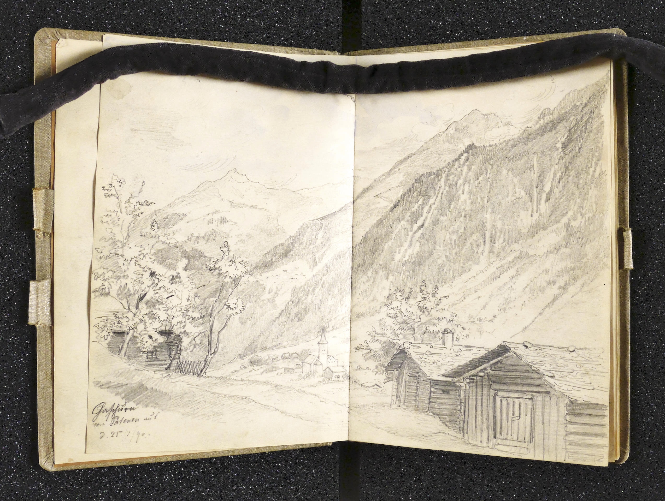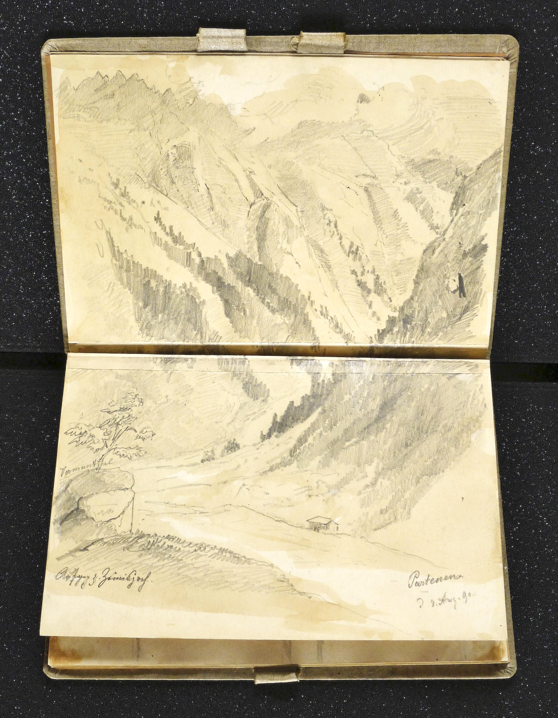 Auf dem Einband in schwarzer Feder bezeichnet: ″Montafon.″ Im Innendeckel Etikett: ″Emil Geller Nachf., Kunst- u. Malerutensilien- Handlung Dresden″. In Bleistift bezeichnet: ″Nachlass, Prof. E. Öhme″. Die einzelnen Ansichten regelmäßig mit Ortsnamen und Datum: ″am Bodensee d. 22. Juli // Alvierlbach Bürs d. 23. Juli 90 // Rhätikoon d/27/7. // Gaschurn von Partenen aus d. 25/7/90 // Vallula / d. 6. Aug. 90. Valula // Gaschurn d. 27/7/90 // Aufgang z. Zeinisjoch / Partenen d. 8. Aug. 90. // Kilschwil [?] Thal d. 30/7/90. // Gaschurn d. 9. Aug. 90 // St. Gallenkirch 2. Aug. 90 // Vallüla d. 19/8/90 // d. 5. Aug. 90 St. Gallenkirch // St. Gallenkirch 6. Aug 90 // St. Gallenkirch d. 13./8. // Pians // Matrisa Spitze / Matrisa Sp. / Alm im Gargellenthal d. 17. Aug. 90. // Tschirgant / Dobadill [Tobadill] d. 26/8/90 // Bürser Berg nach d. Wege ins Brandner Thal / Wasenspitz, d. 21 Aug. // Pians d/24/8/90 // Pians // Pians 28/8/90 // Regensburg // Grins″. – Skizzenbuch mit 29 Landschaften und Ansichten, jeweils meist auf einer Doppelseite. – Provenienz: Privatsammlung Niedersachsen. Vormals Sammlung Kretschmer, Dresden. Davor Künstler- Nachlass. – Der Leineneinband etwas fleckig. Vorsatz beschädigt. Die einzelnen Seiten mit den Zeichnungen selten unmerklich fleckig, meist in sehr gutem Zustand. Insgesamt guter Zustand.