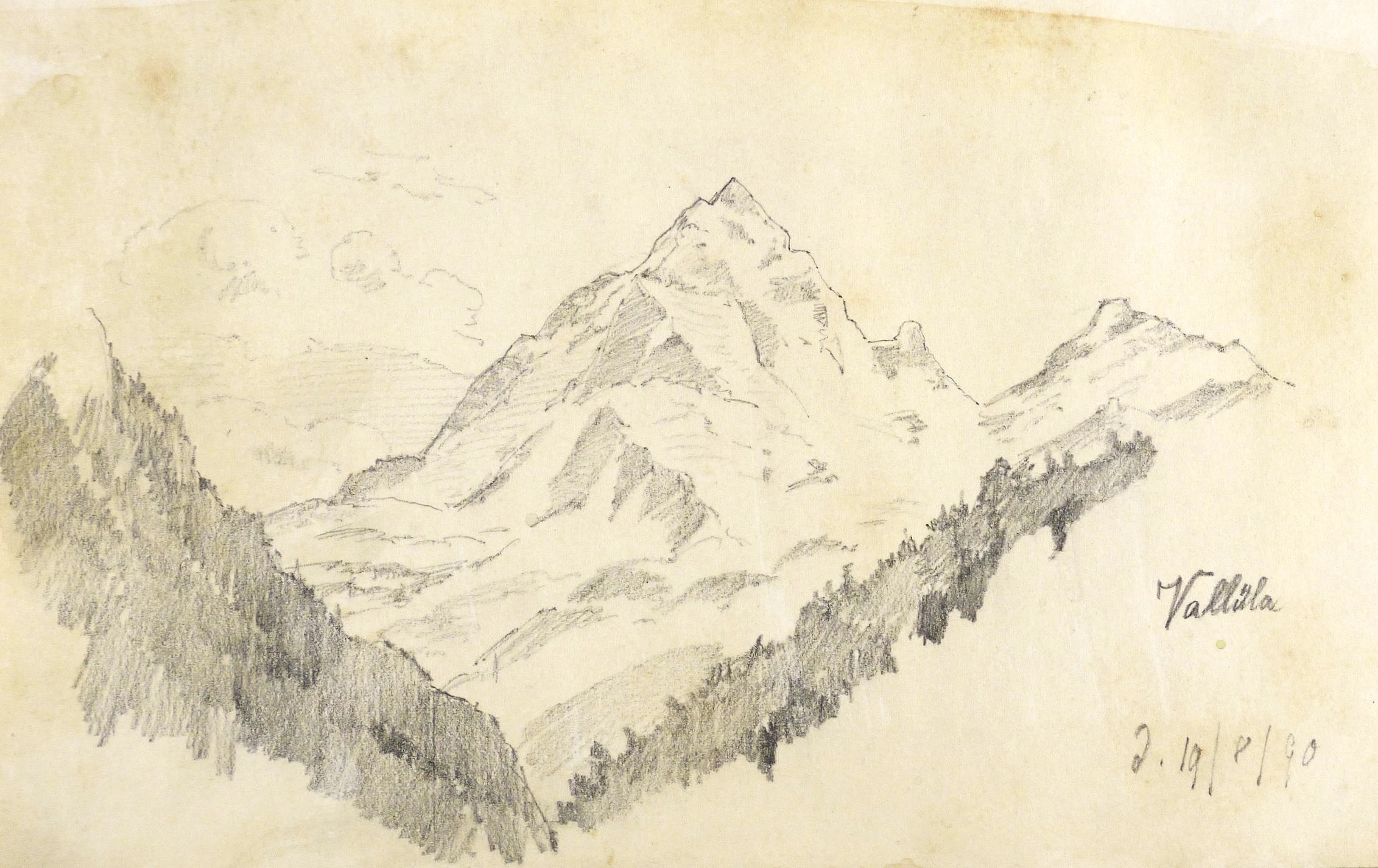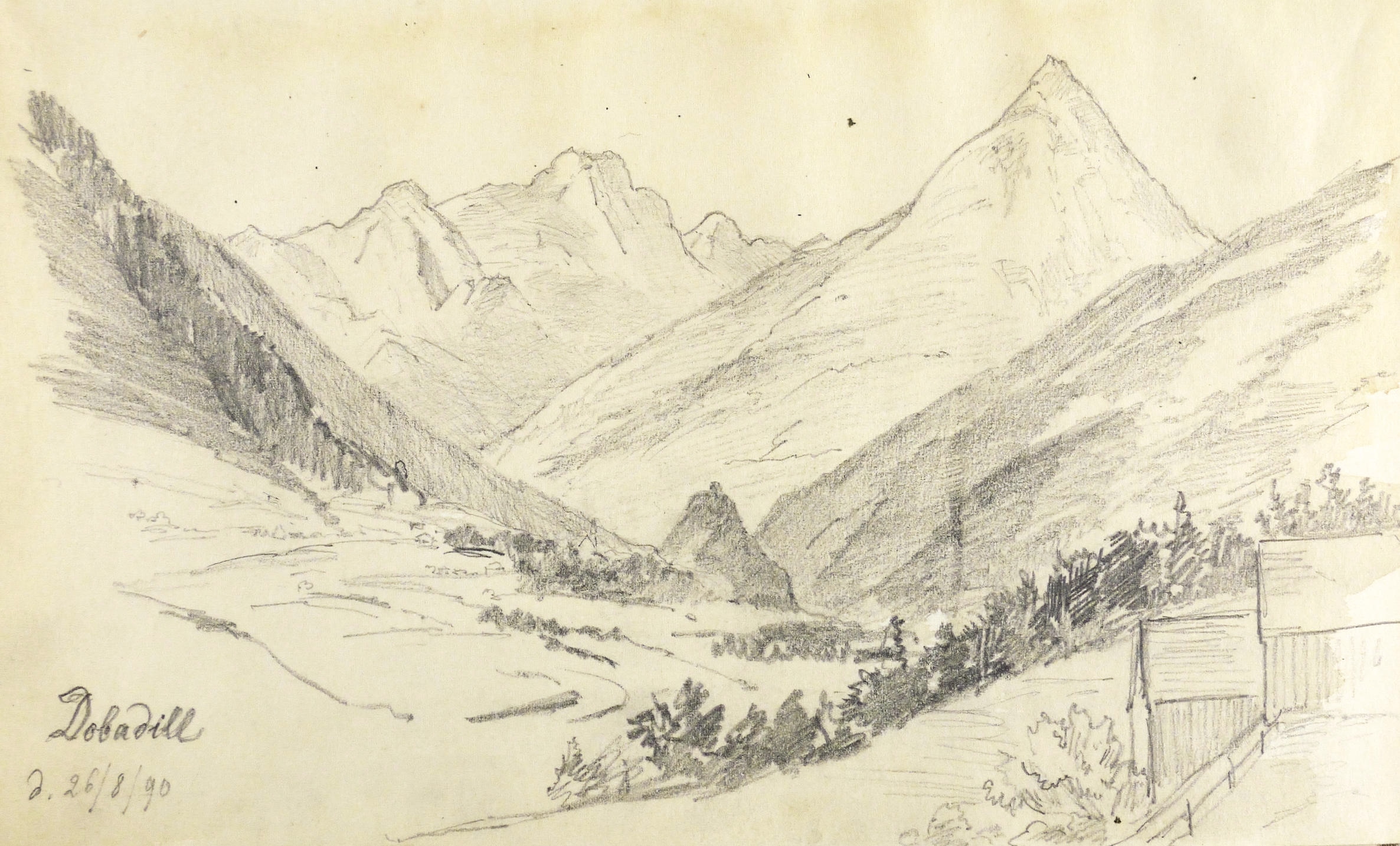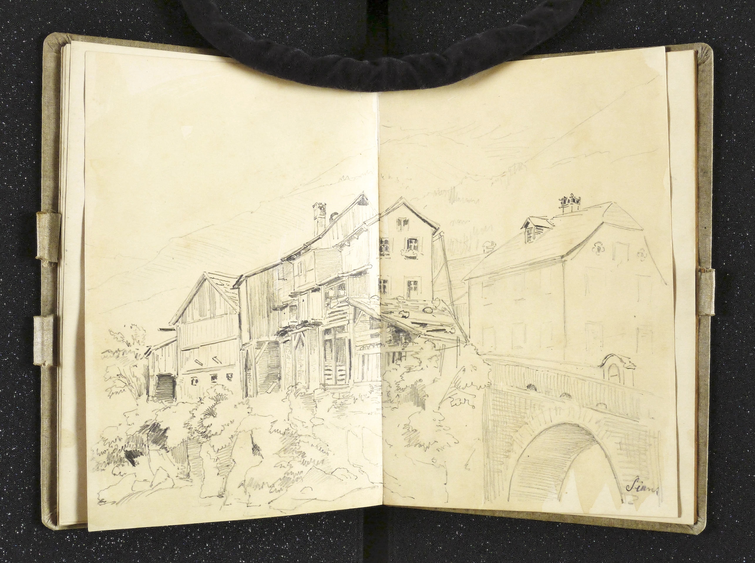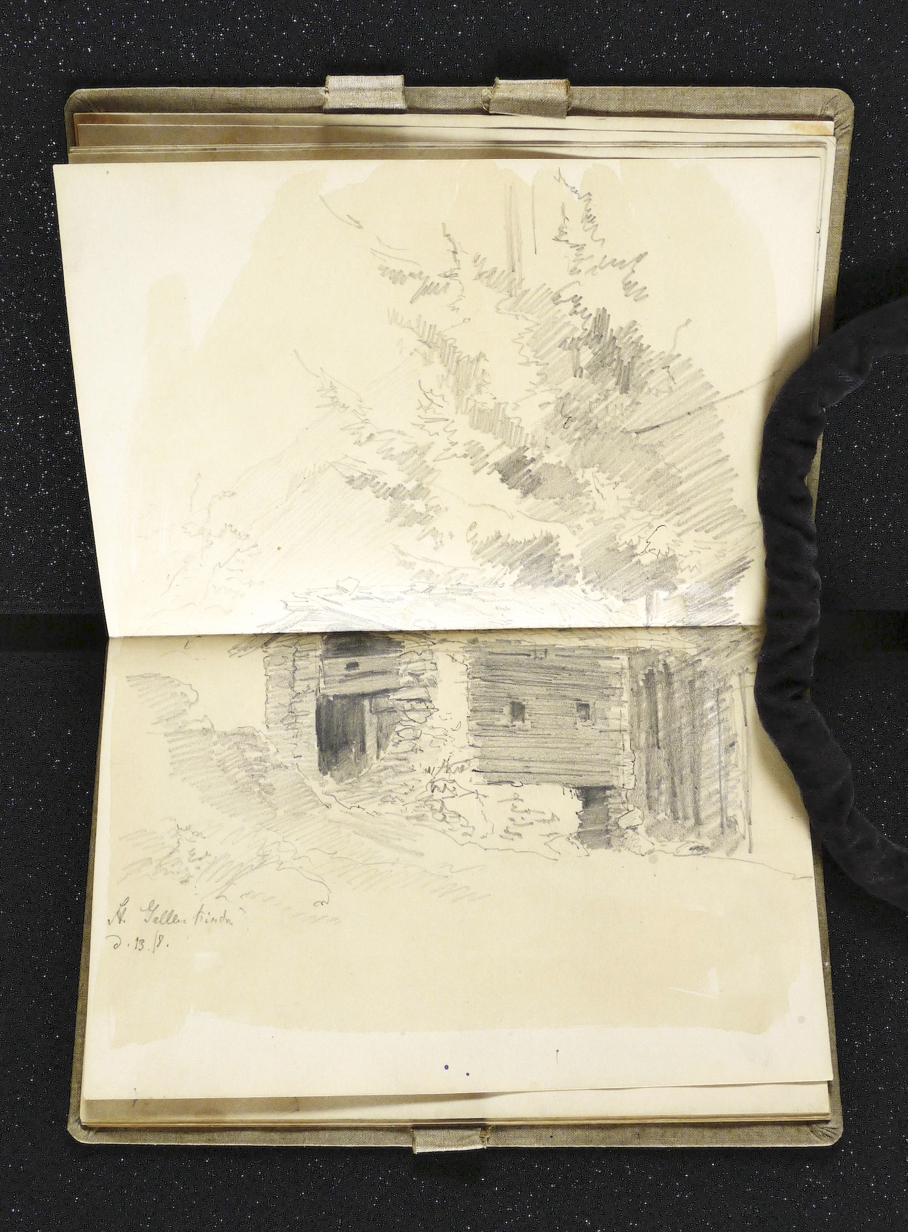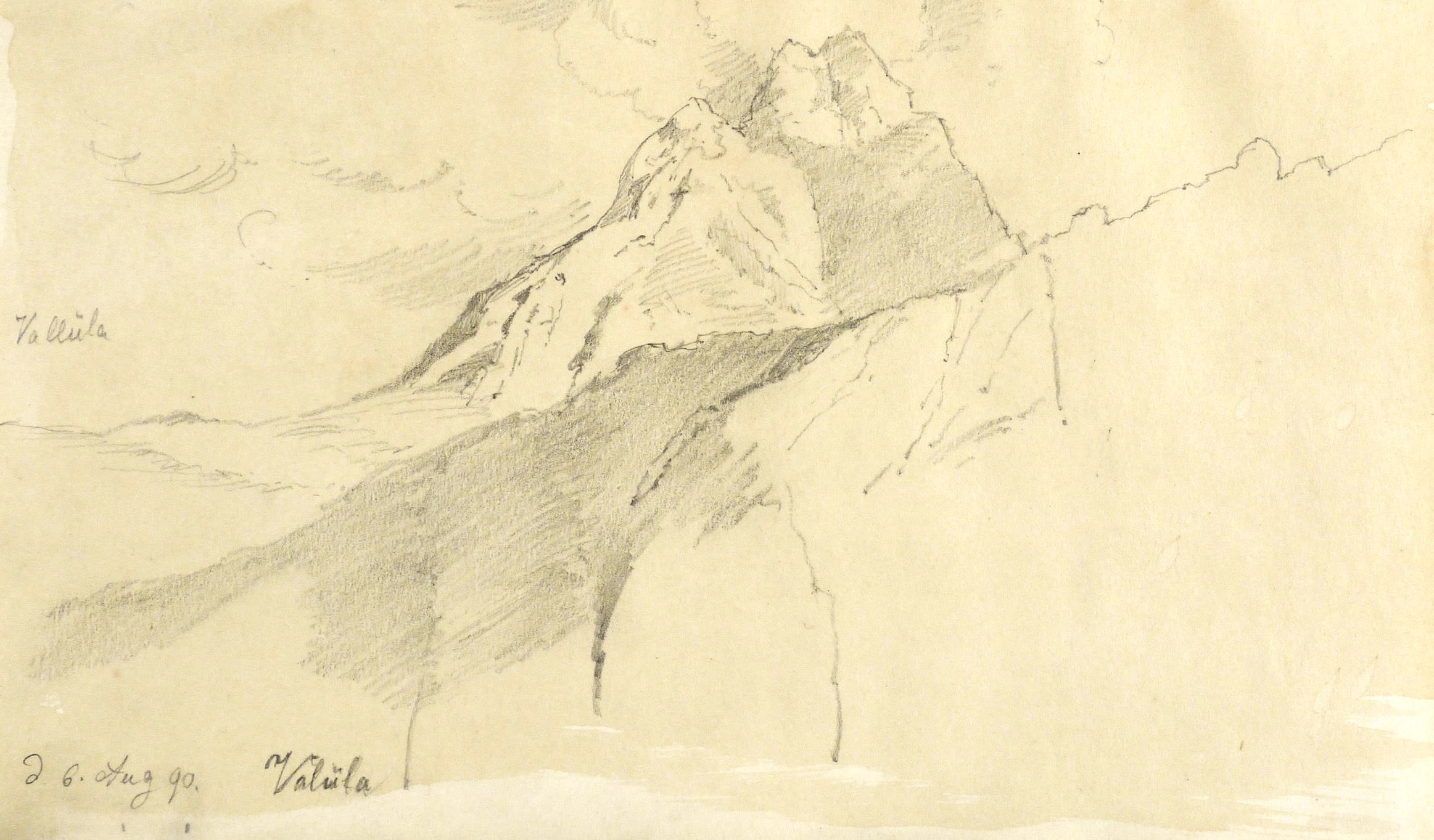 Auf dem Einband in schwarzer Feder bezeichnet: ″Montafon.″ Im Innendeckel Etikett: ″Emil Geller Nachf., Kunst- u. Malerutensilien- Handlung Dresden″. In Bleistift bezeichnet: ″Nachlass, Prof. E. Öhme″. Die einzelnen Ansichten regelmäßig mit Ortsnamen und Datum: ″am Bodensee d. 22. Juli // Alvierlbach Bürs d. 23. Juli 90 // Rhätikoon d/27/7. // Gaschurn von Partenen aus d. 25/7/90 // Vallula / d. 6. Aug. 90. Valula // Gaschurn d. 27/7/90 // Aufgang z. Zeinisjoch / Partenen d. 8. Aug. 90. // Kilschwil [?] Thal d. 30/7/90. // Gaschurn d. 9. Aug. 90 // St. Gallenkirch 2. Aug. 90 // Vallüla d. 19/8/90 // d. 5. Aug. 90 St. Gallenkirch // St. Gallenkirch 6. Aug 90 // St. Gallenkirch d. 13./8. // Pians // Matrisa Spitze / Matrisa Sp. / Alm im Gargellenthal d. 17. Aug. 90. // Tschirgant / Dobadill [Tobadill] d. 26/8/90 // Bürser Berg nach d. Wege ins Brandner Thal / Wasenspitz, d. 21 Aug. // Pians d/24/8/90 // Pians // Pians 28/8/90 // Regensburg // Grins″. – Skizzenbuch mit 29 Landschaften und Ansichten, jeweils meist auf einer Doppelseite. – Provenienz: Privatsammlung Niedersachsen. Vormals Sammlung Kretschmer, Dresden. Davor Künstler- Nachlass. – Der Leineneinband etwas fleckig. Vorsatz beschädigt. Die einzelnen Seiten mit den Zeichnungen selten unmerklich fleckig, meist in sehr gutem Zustand. Insgesamt guter Zustand.