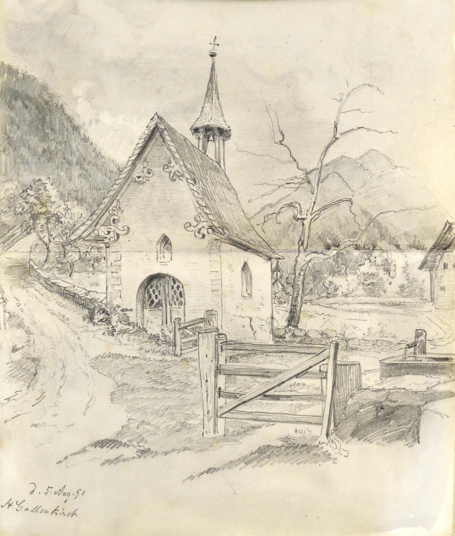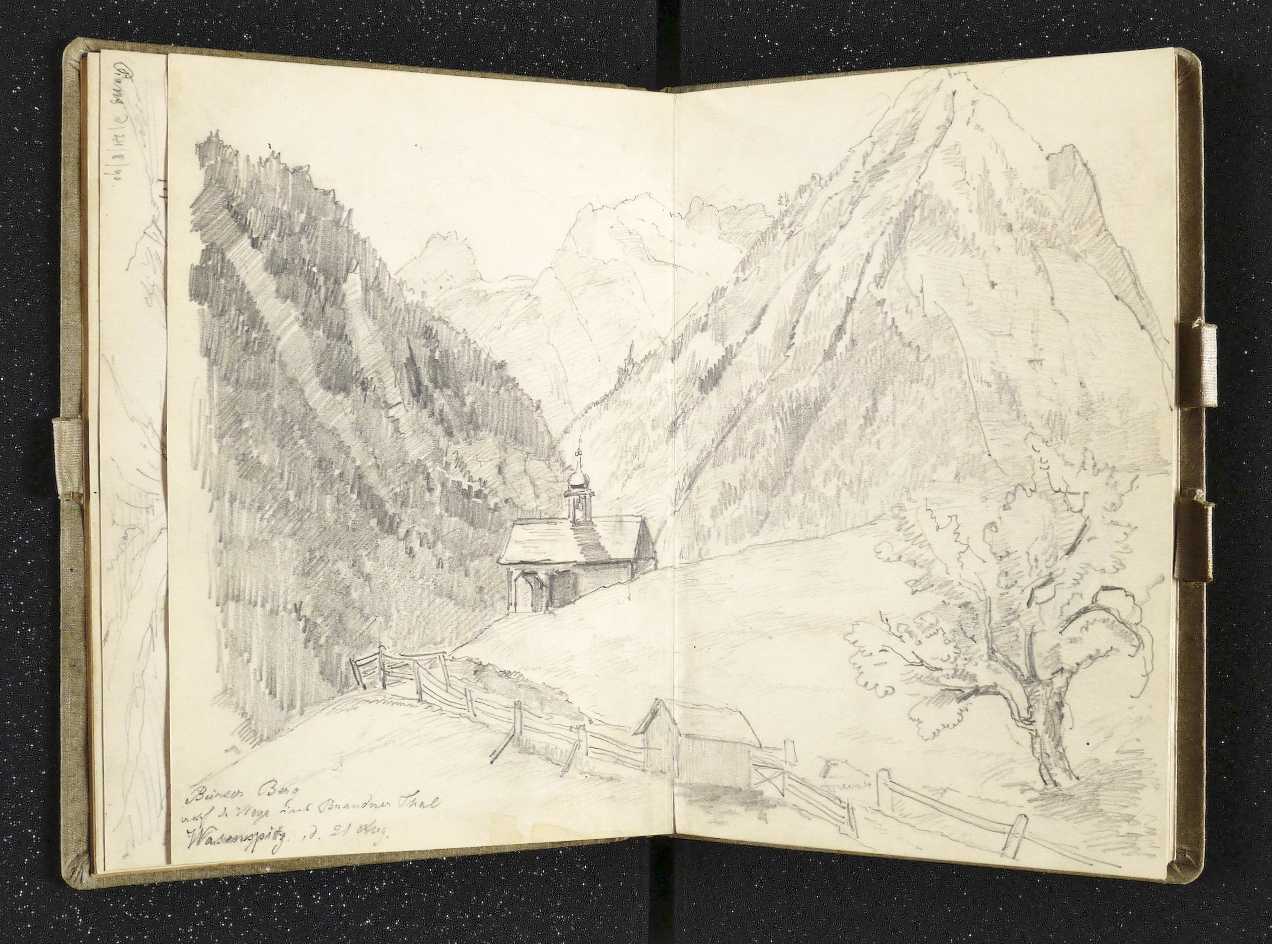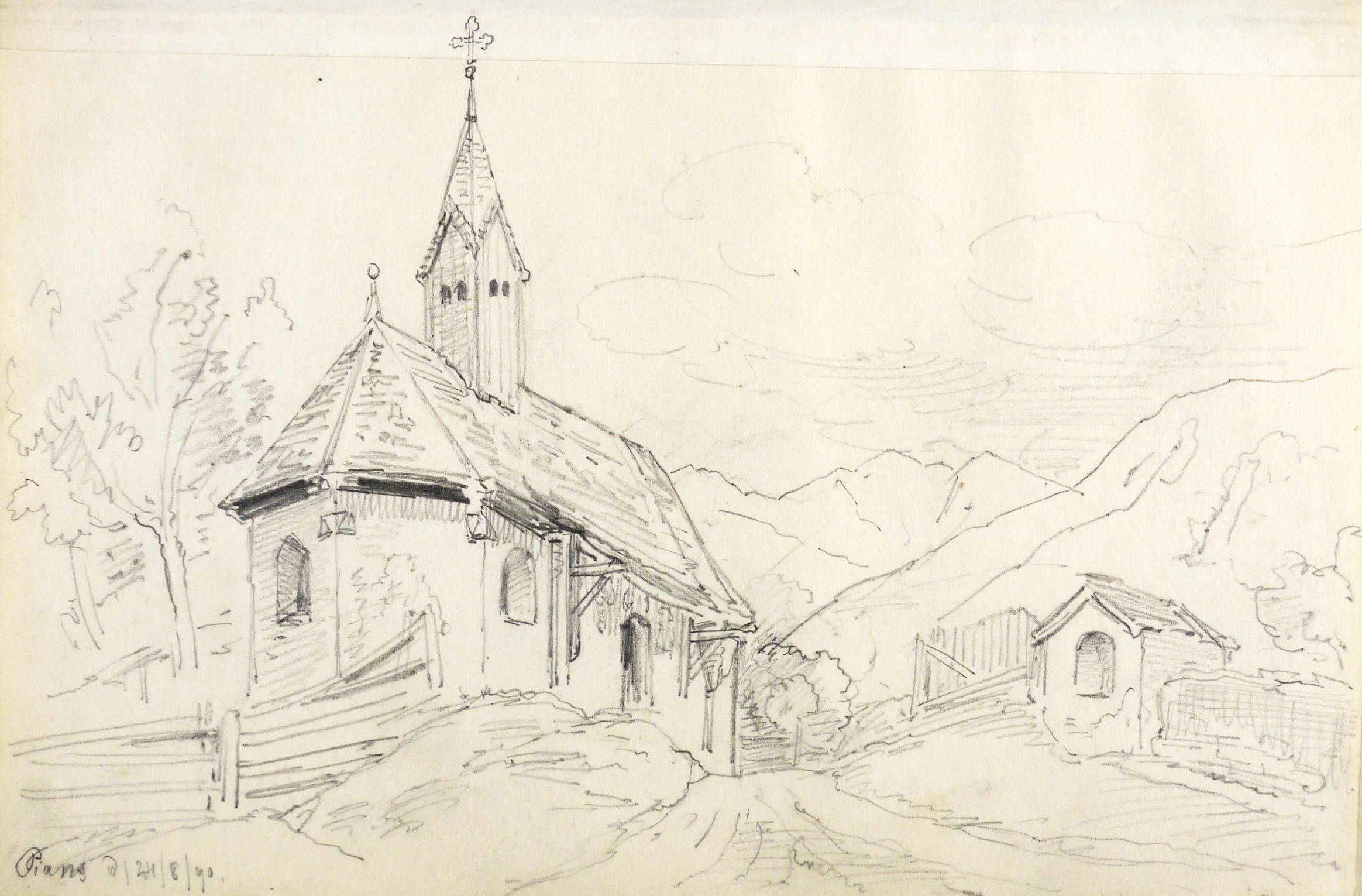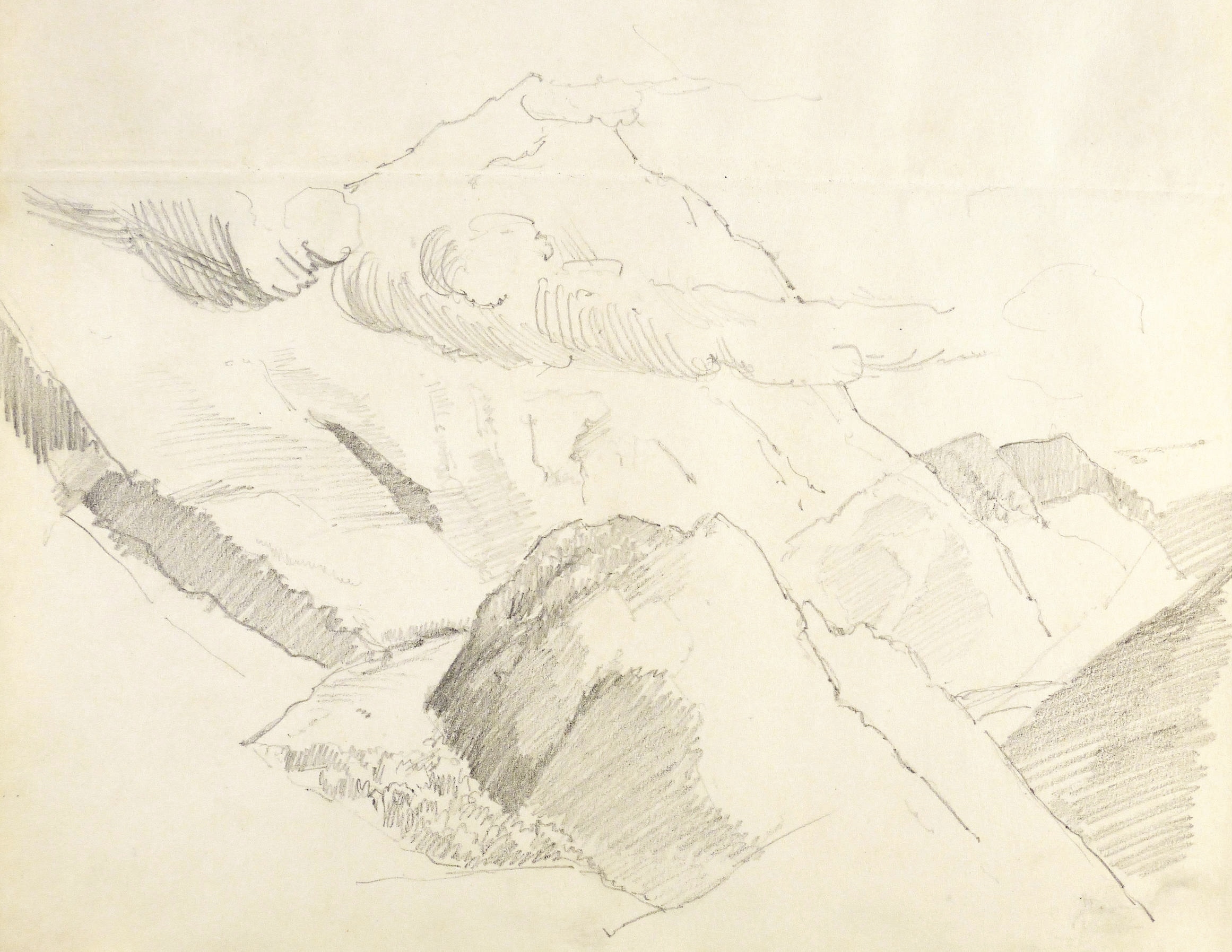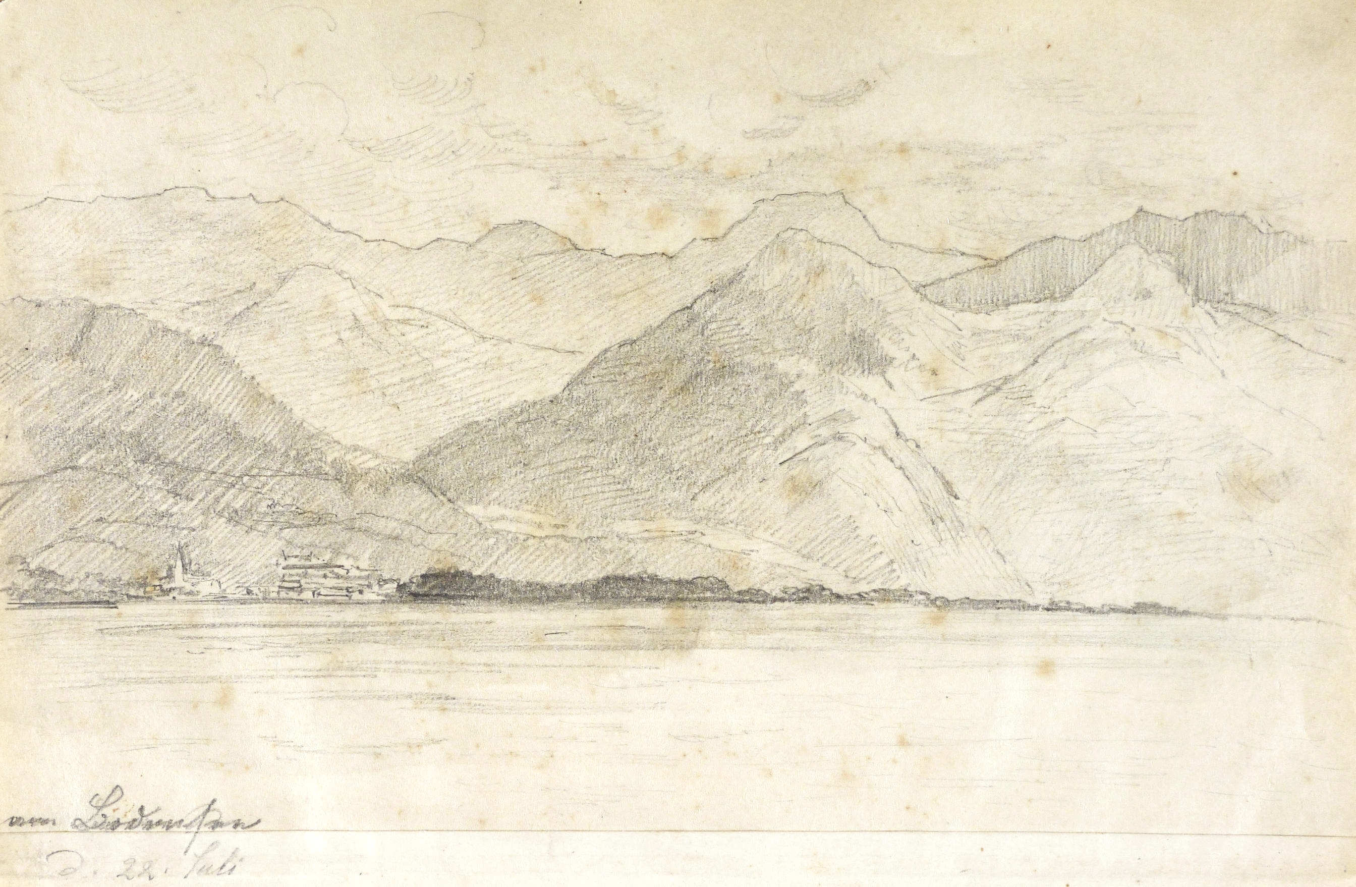 Auf dem Einband in schwarzer Feder bezeichnet: ″Montafon.″ Im Innendeckel Etikett: ″Emil Geller Nachf., Kunst- u. Malerutensilien- Handlung Dresden″. In Bleistift bezeichnet: ″Nachlass, Prof. E. Öhme″. Die einzelnen Ansichten regelmäßig mit Ortsnamen und Datum: ″am Bodensee d. 22. Juli // Alvierlbach Bürs d. 23. Juli 90 // Rhätikoon d/27/7. // Gaschurn von Partenen aus d. 25/7/90 // Vallula / d. 6. Aug. 90. Valula // Gaschurn d. 27/7/90 // Aufgang z. Zeinisjoch / Partenen d. 8. Aug. 90. // Kilschwil [?] Thal d. 30/7/90. // Gaschurn d. 9. Aug. 90 // St. Gallenkirch 2. Aug. 90 // Vallüla d. 19/8/90 // d. 5. Aug. 90 St. Gallenkirch // St. Gallenkirch 6. Aug 90 // St. Gallenkirch d. 13./8. // Pians // Matrisa Spitze / Matrisa Sp. / Alm im Gargellenthal d. 17. Aug. 90. // Tschirgant / Dobadill [Tobadill] d. 26/8/90 // Bürser Berg nach d. Wege ins Brandner Thal / Wasenspitz, d. 21 Aug. // Pians d/24/8/90 // Pians // Pians 28/8/90 // Regensburg // Grins″. – Skizzenbuch mit 29 Landschaften und Ansichten, jeweils meist auf einer Doppelseite. – Provenienz: Privatsammlung Niedersachsen. Vormals Sammlung Kretschmer, Dresden. Davor Künstler- Nachlass. – Der Leineneinband etwas fleckig. Vorsatz beschädigt. Die einzelnen Seiten mit den Zeichnungen selten unmerklich fleckig, meist in sehr gutem Zustand. Insgesamt guter Zustand.