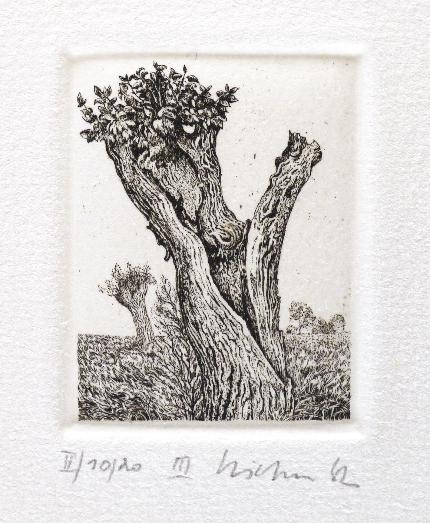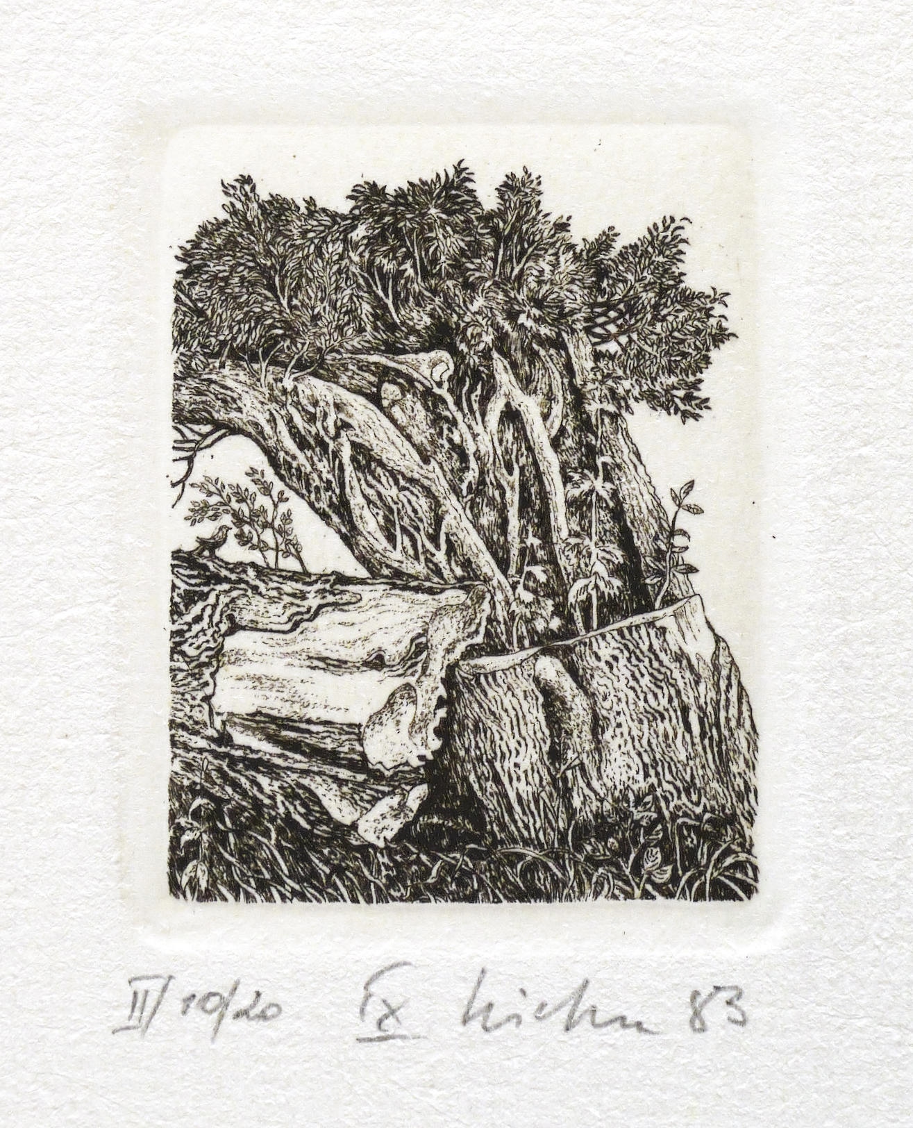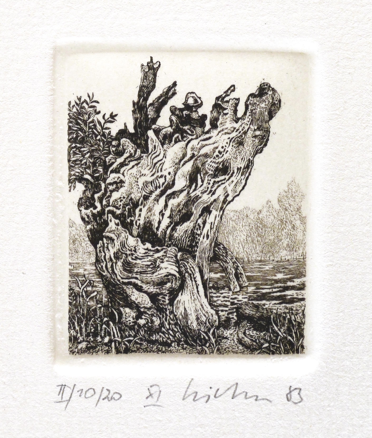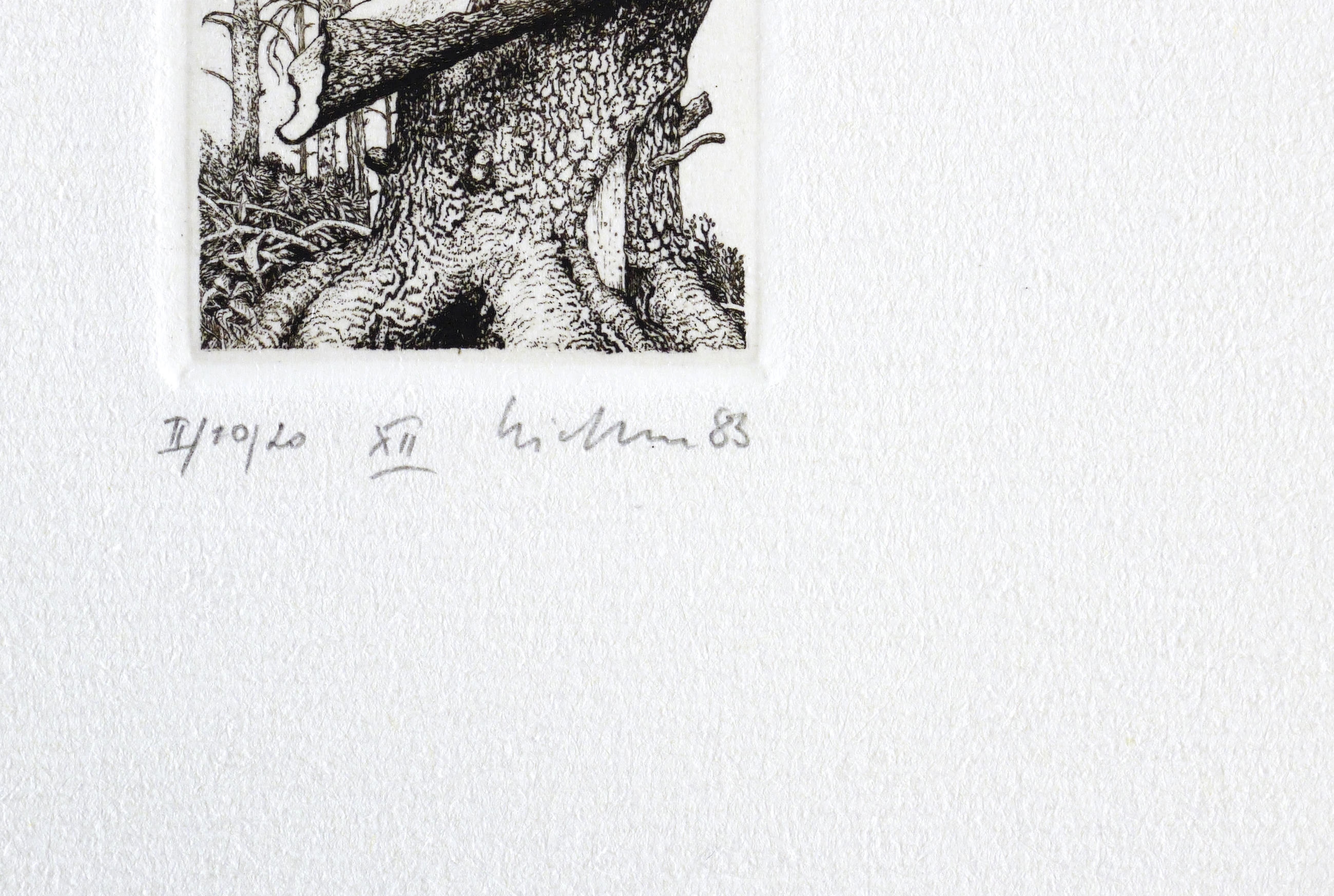 Aus: Gerenot Richter, Dreizehn Torsi (Berlin: Kunstverlag Edition Manfred Schmidt 1990). – Alle Grafiken rechts unten in Bleistift signiert und datiert. Links jeweils Auflagenbezeichnung: ″II/10/20″. Mittig Blatt-Nummer der Folge. Das Begleitheft mit dem Titelblatt ebenfalls mit Auflagenbezeichnung. – Kleine Grafik-Kassette mit der Folge ″Dreizehn Torsi″ von Gerenot Richter in der Edition des Kunstverlag Manfred Schmidt, Druck der Friedrichshagener Presse (1990) und Begleittext von Gisold Lammel. Enthalten die Radierungen: ″1. Torso (Eberesche/Abgefressen). - 2. Torso I (Buhnen). - 3. Torso II (Stubben). - 4. Torso III (Linde). - 5. Torso IV (Strandgut). - 6. Torso V (Buche). - 7. Torso VI (Fichte). - 8. Torso VII (Pappel). - 9. Torso VIII (Strandgut). - 10. Torso IX (Weide). - 11. Torso X (Strandgut). - 12. Torso XI (Weide). - 13. Torso XII (Fichte). – Abweichend von der Übersicht im Begleitheft ist das erste Blatt hier bezeichnet als: ″XIII″. – Vollständig mit Leinenkassette, Begleitheft und allen Grafiken. Keine Mängel. Sehr guter Zustand.
